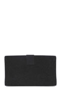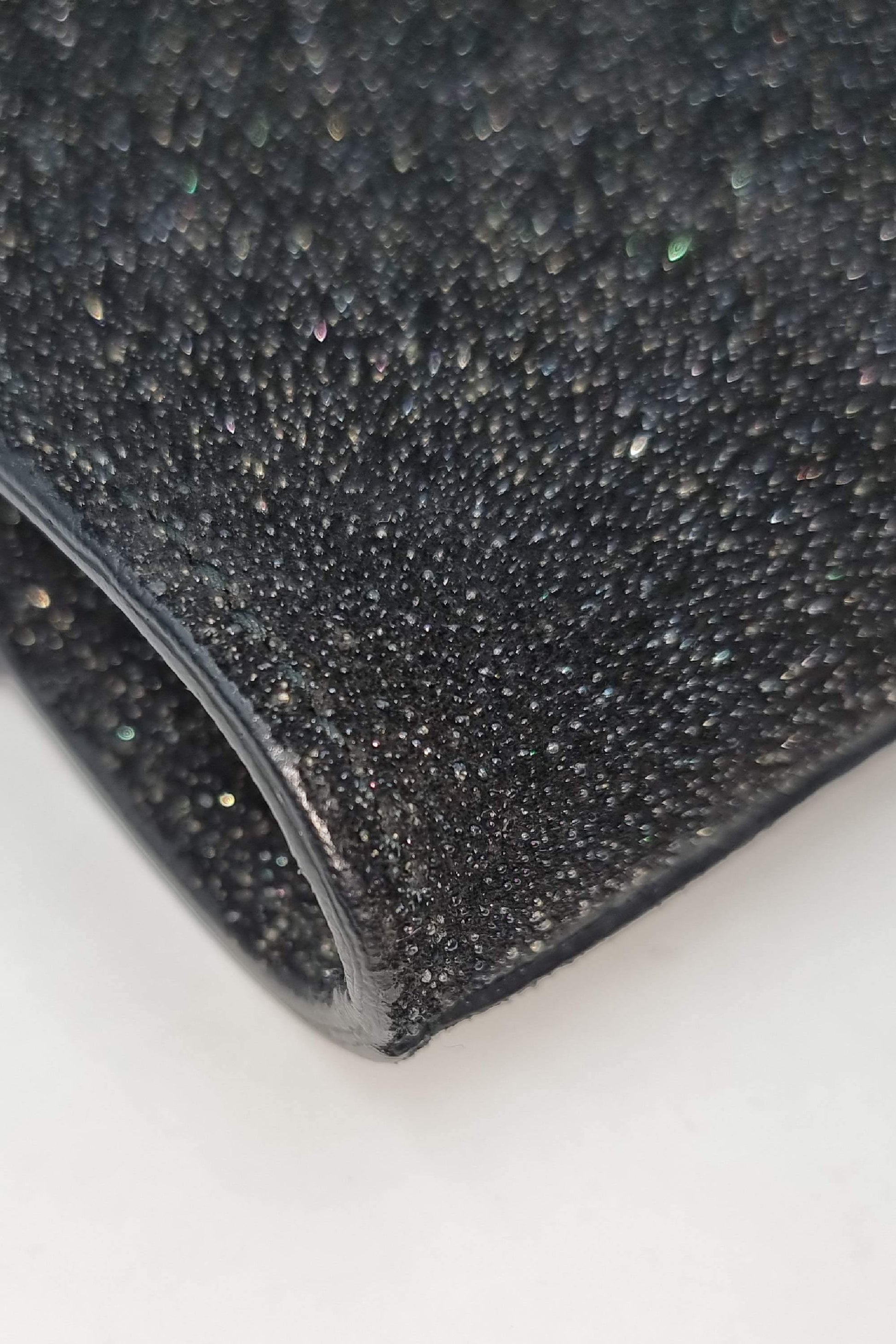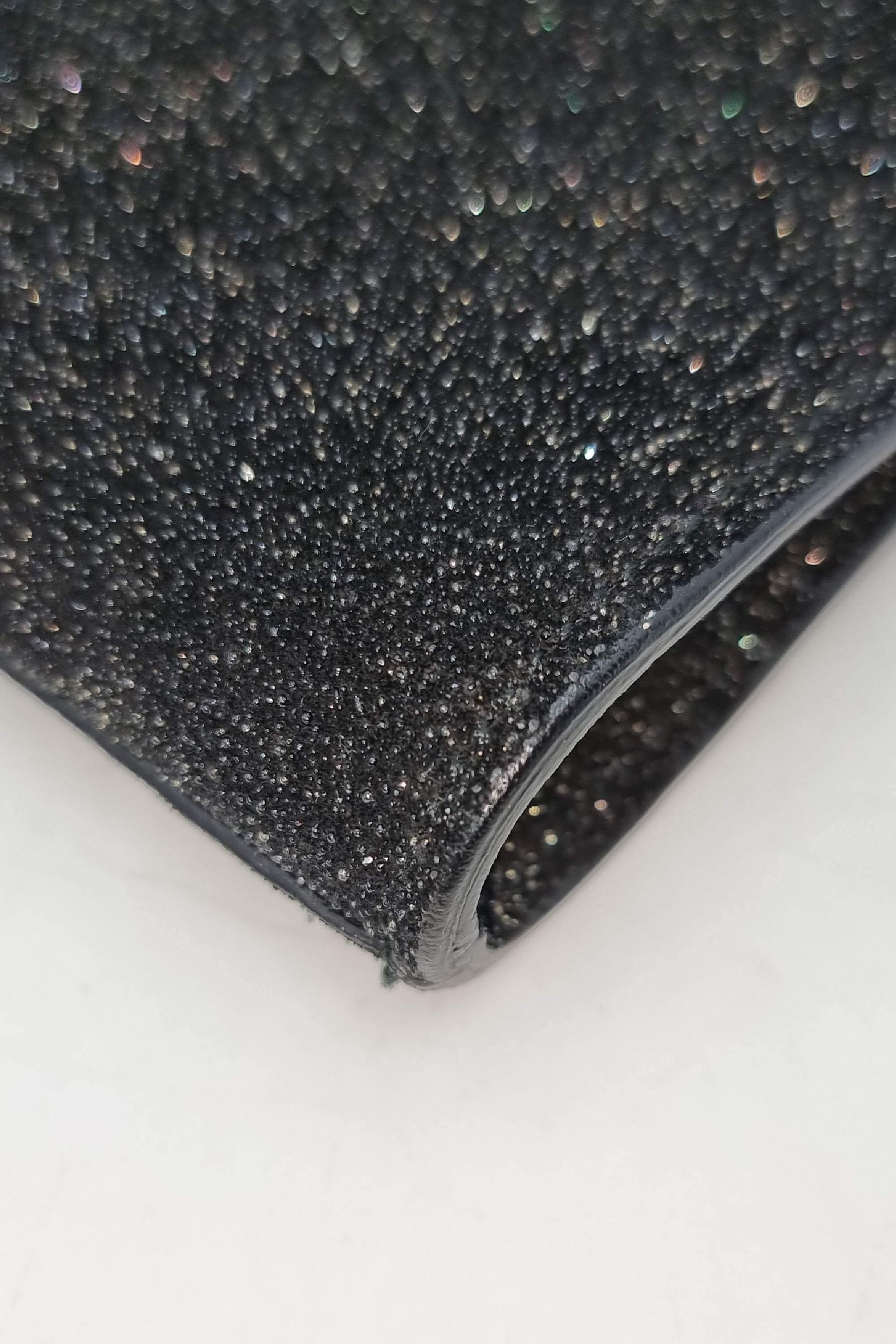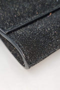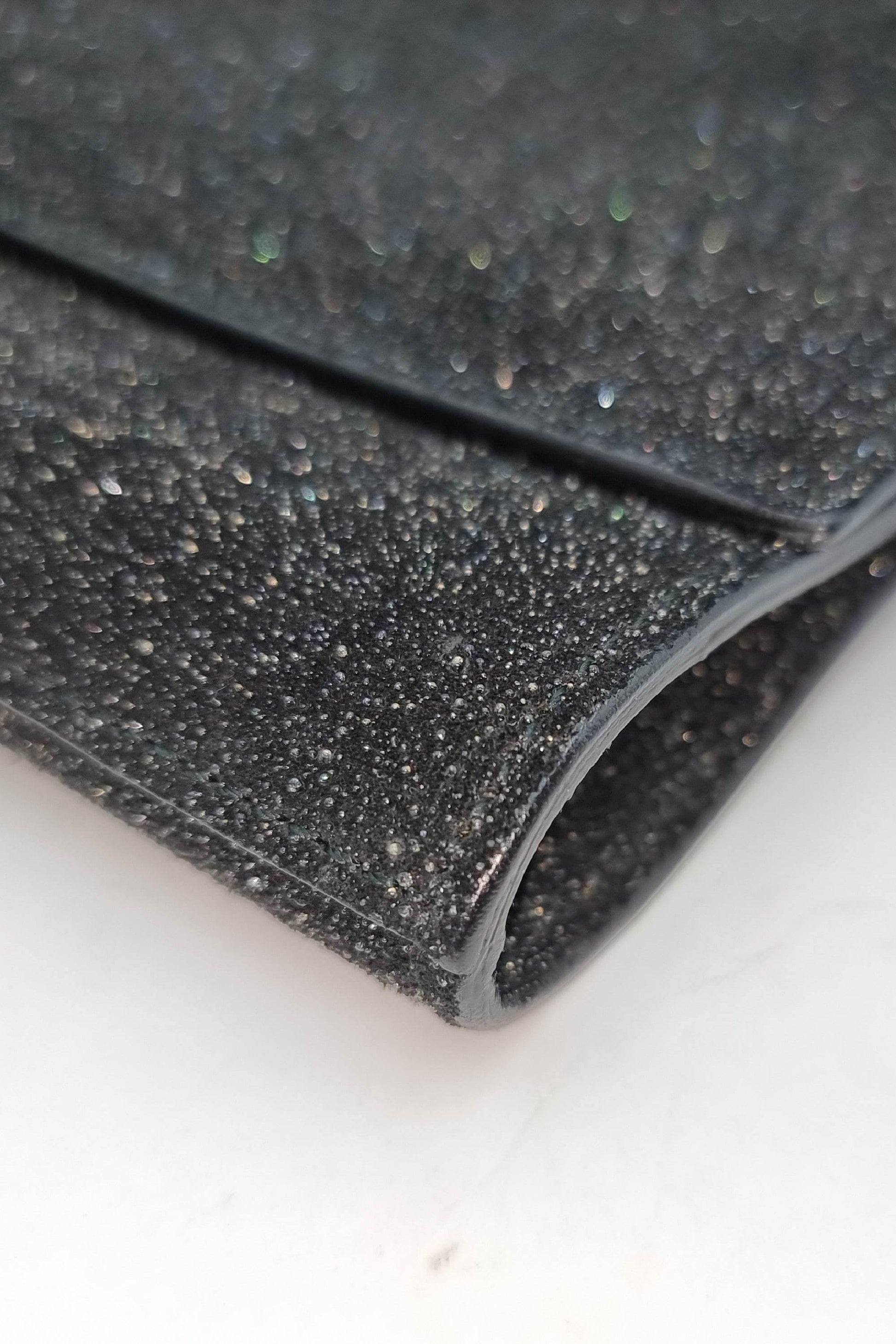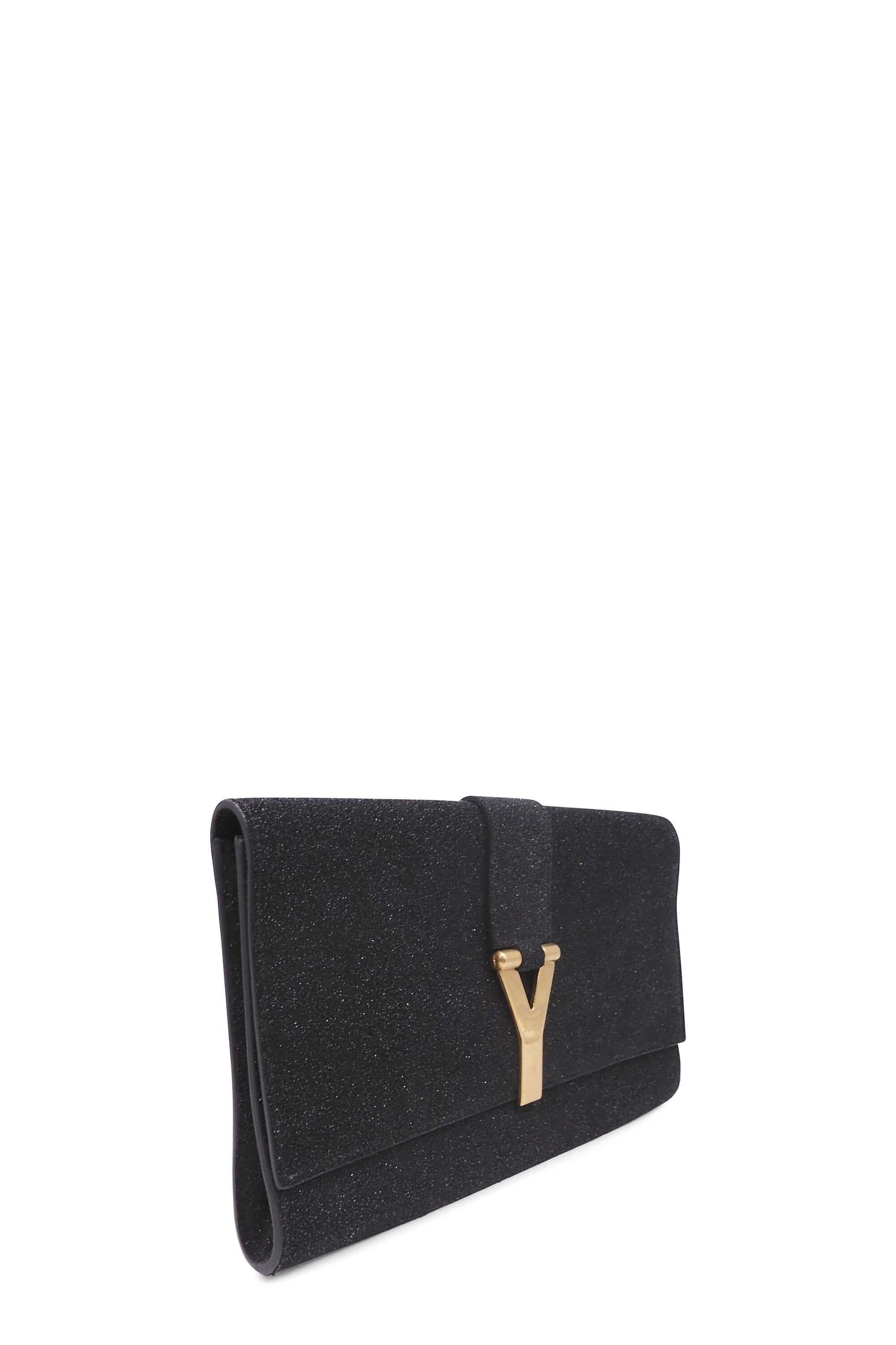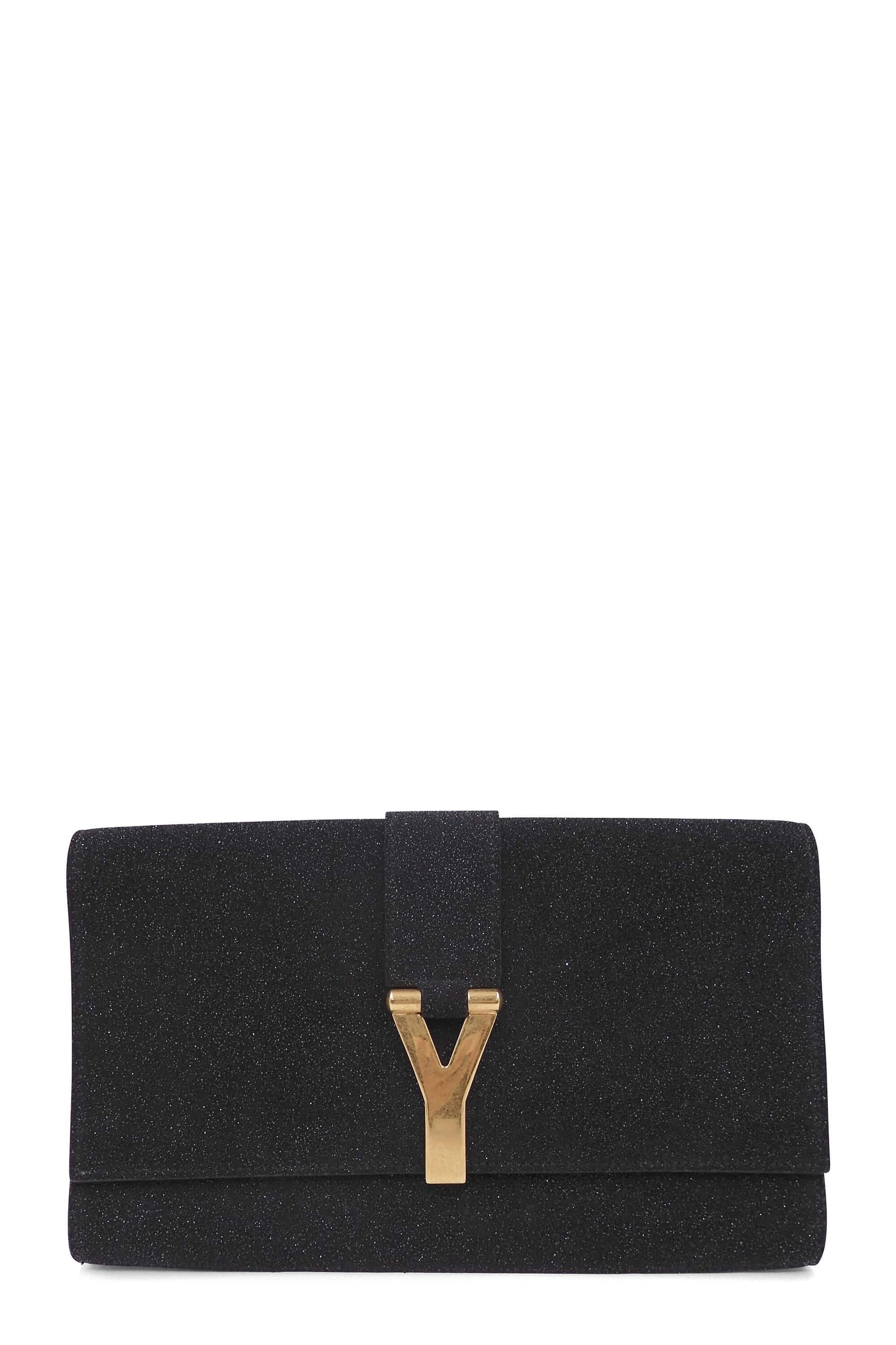 This Saint Laurent Chyc Clutch Black Glitter features a glitter embossed leather and gold-tone hardware, snap tab closure, designer y plaque. The flap opens fabric interior lining.