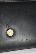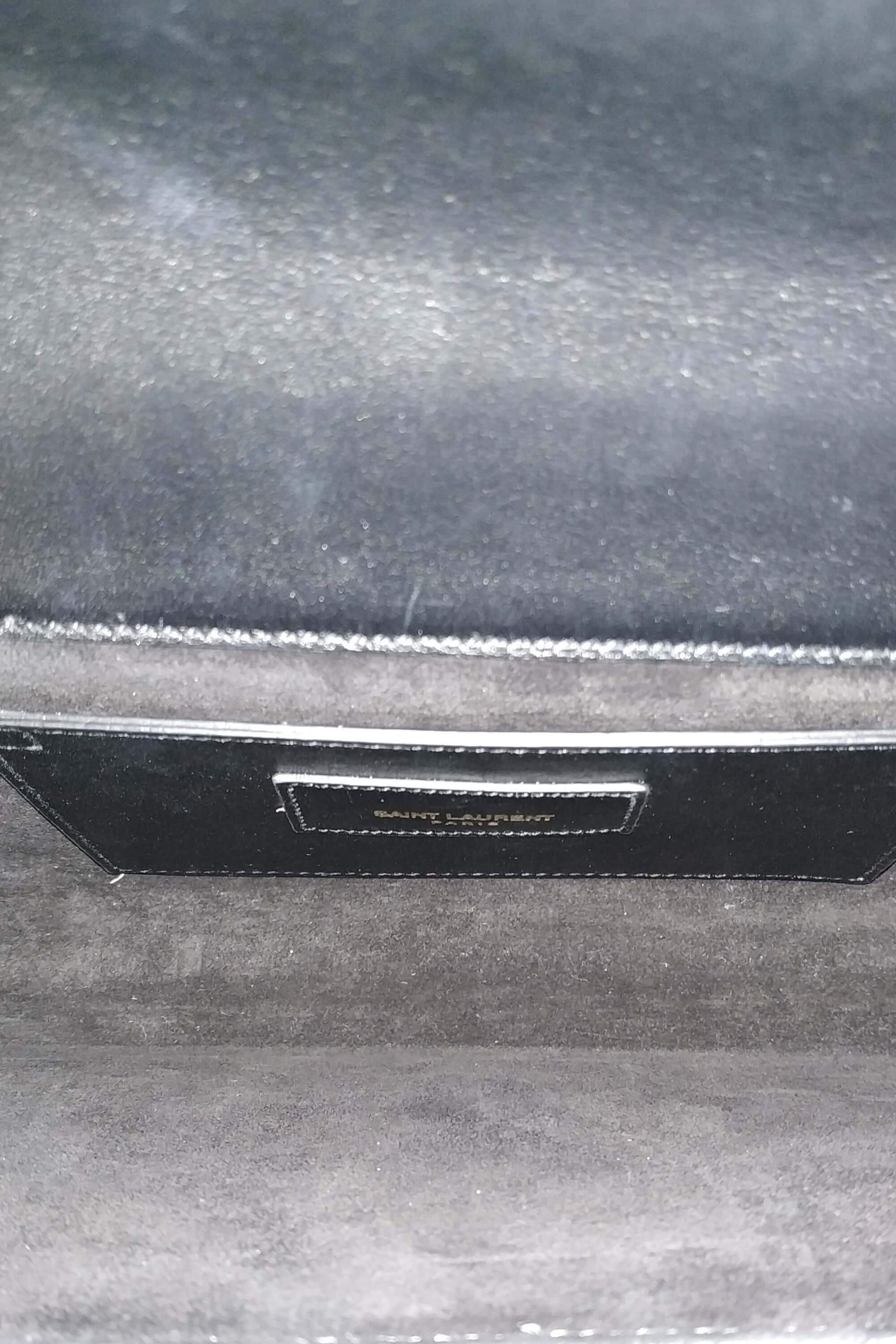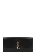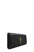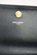 This stunning clutch is crafted of grained calfskin leather in black. The clutch features a facing iconic gold tone YSL emblem, opens to a black fabric interior, and an interior patch pocket.