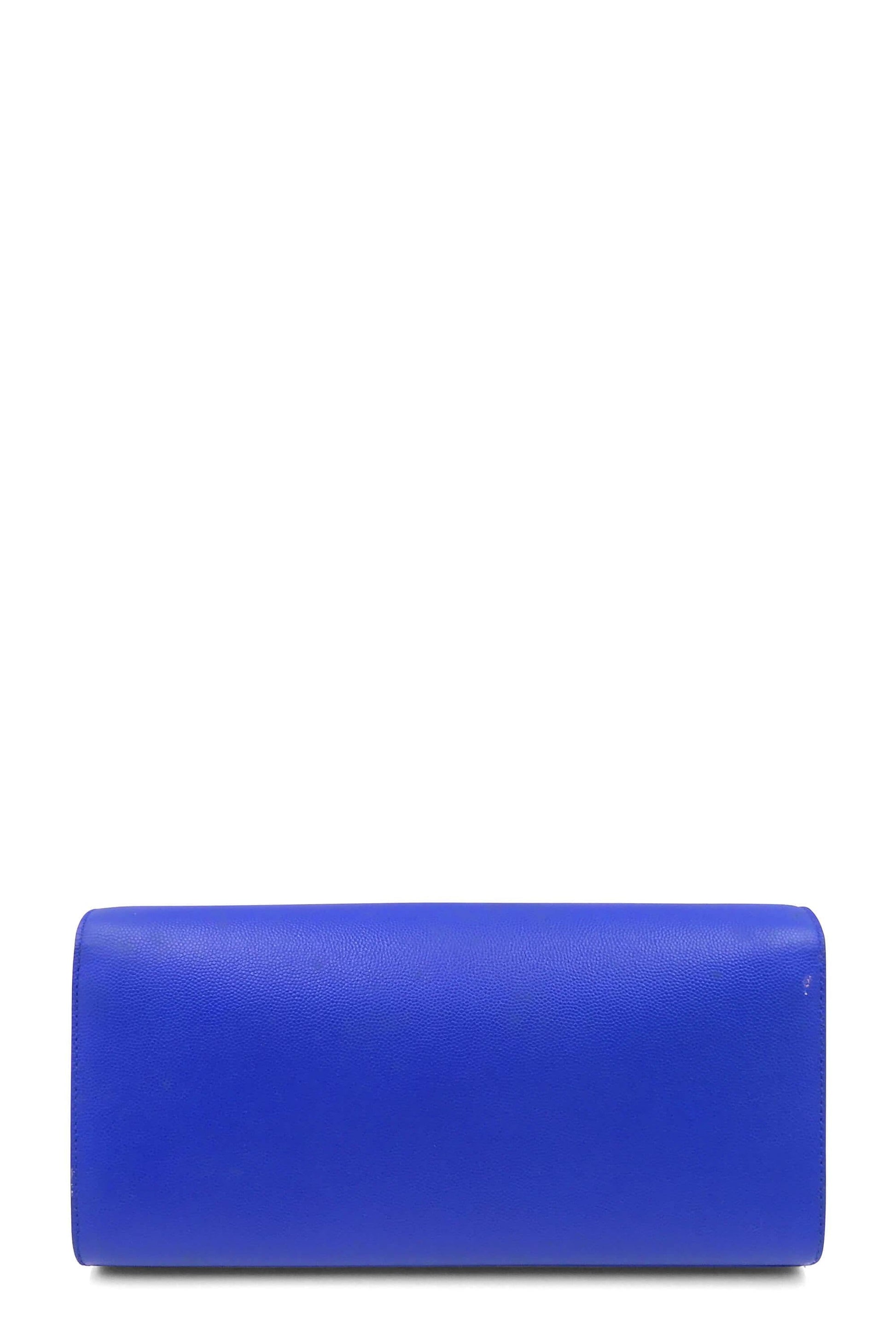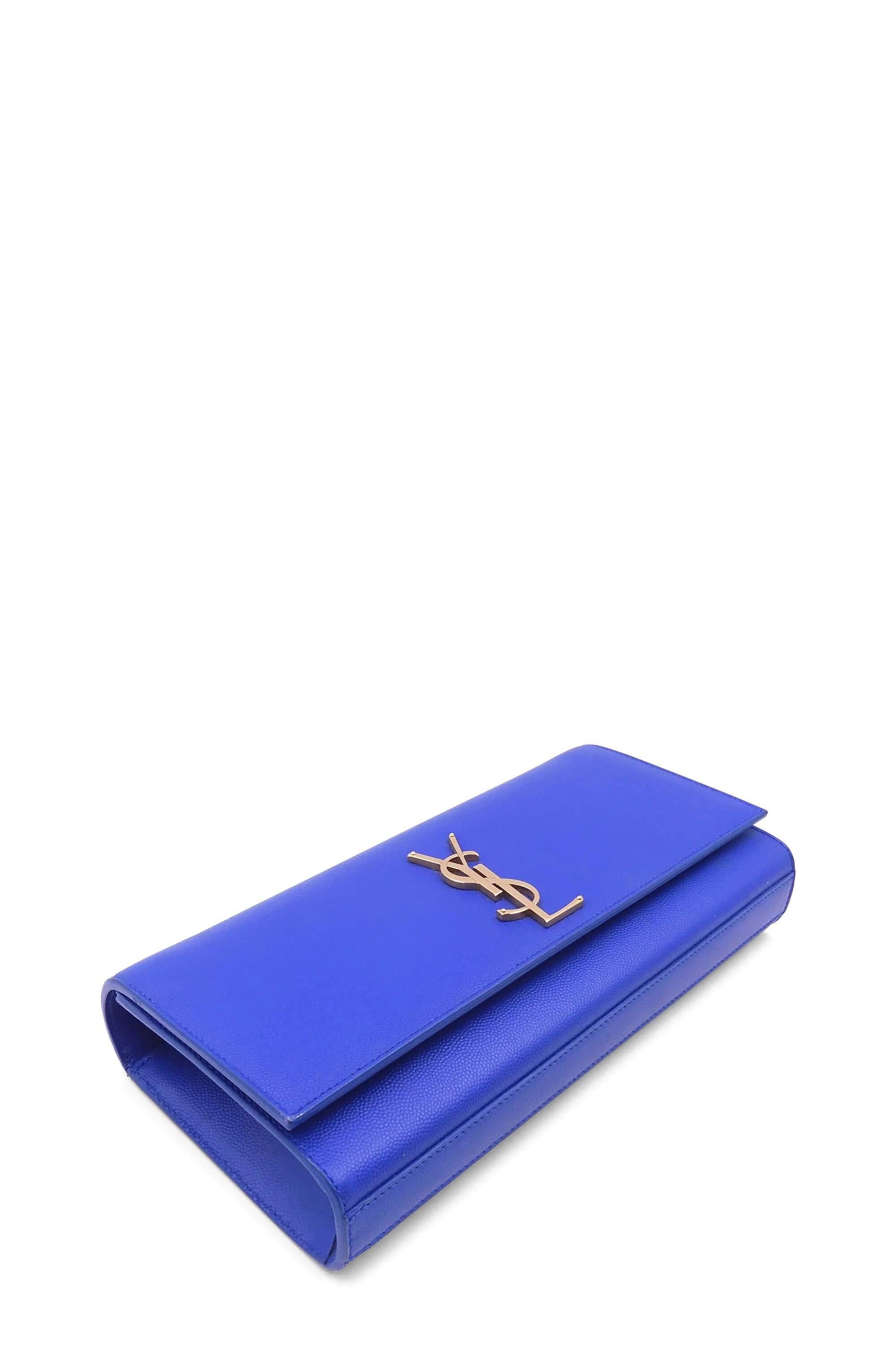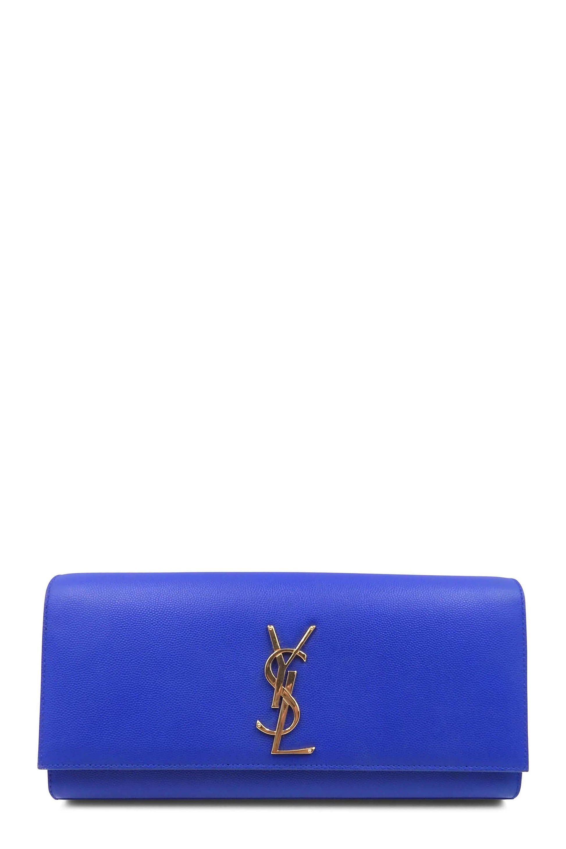 Masterfully crafted in beautiful blue grain de poudre textured calfskin leather, this clutch bag will complement any elegant outfit. Black canvas lines the interior, which also includes a slot pocket for smaller items. Gracing the front of the clutch is the interlocking YSL signature in gold-toned hardware, covering the magnetic snap closure.
