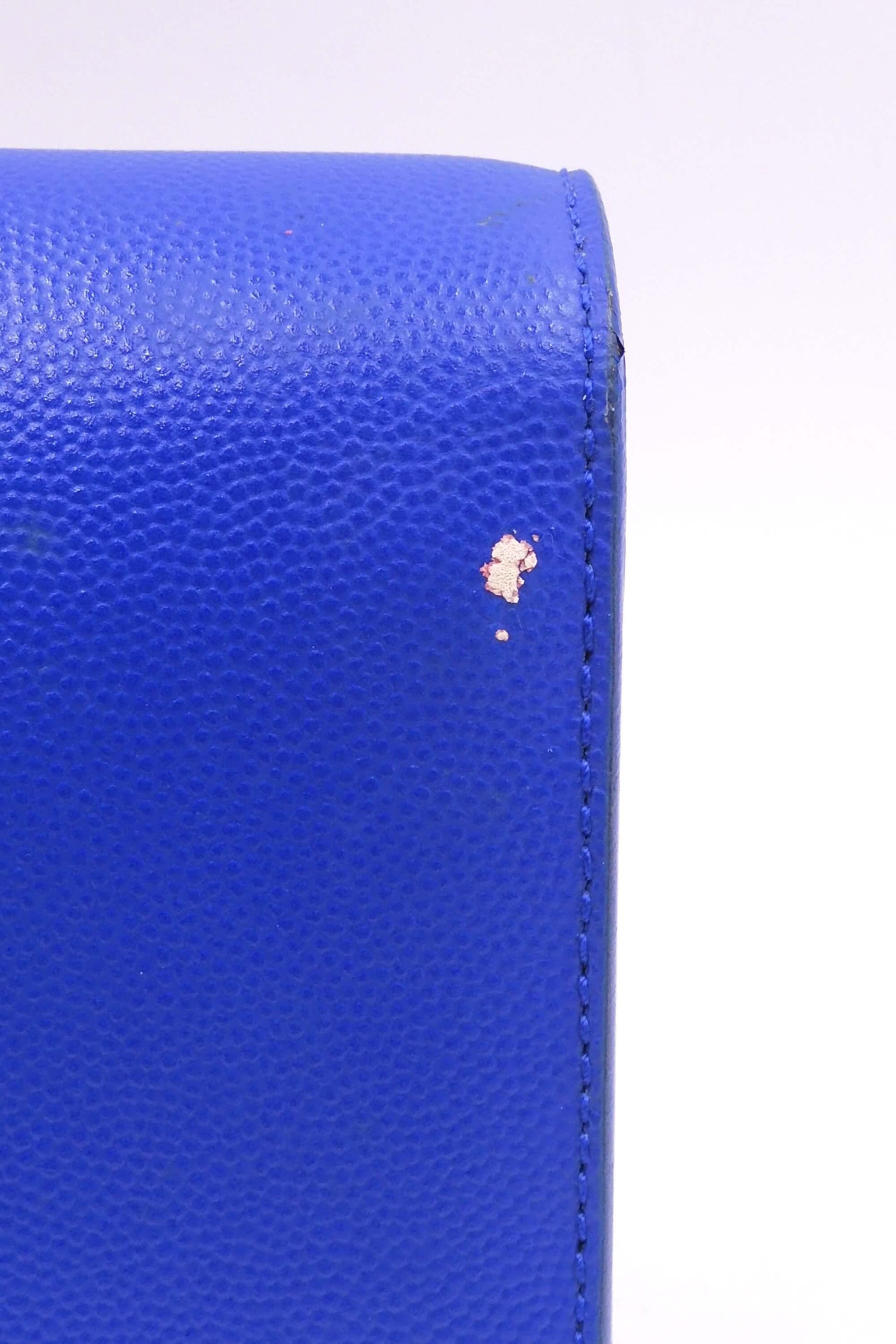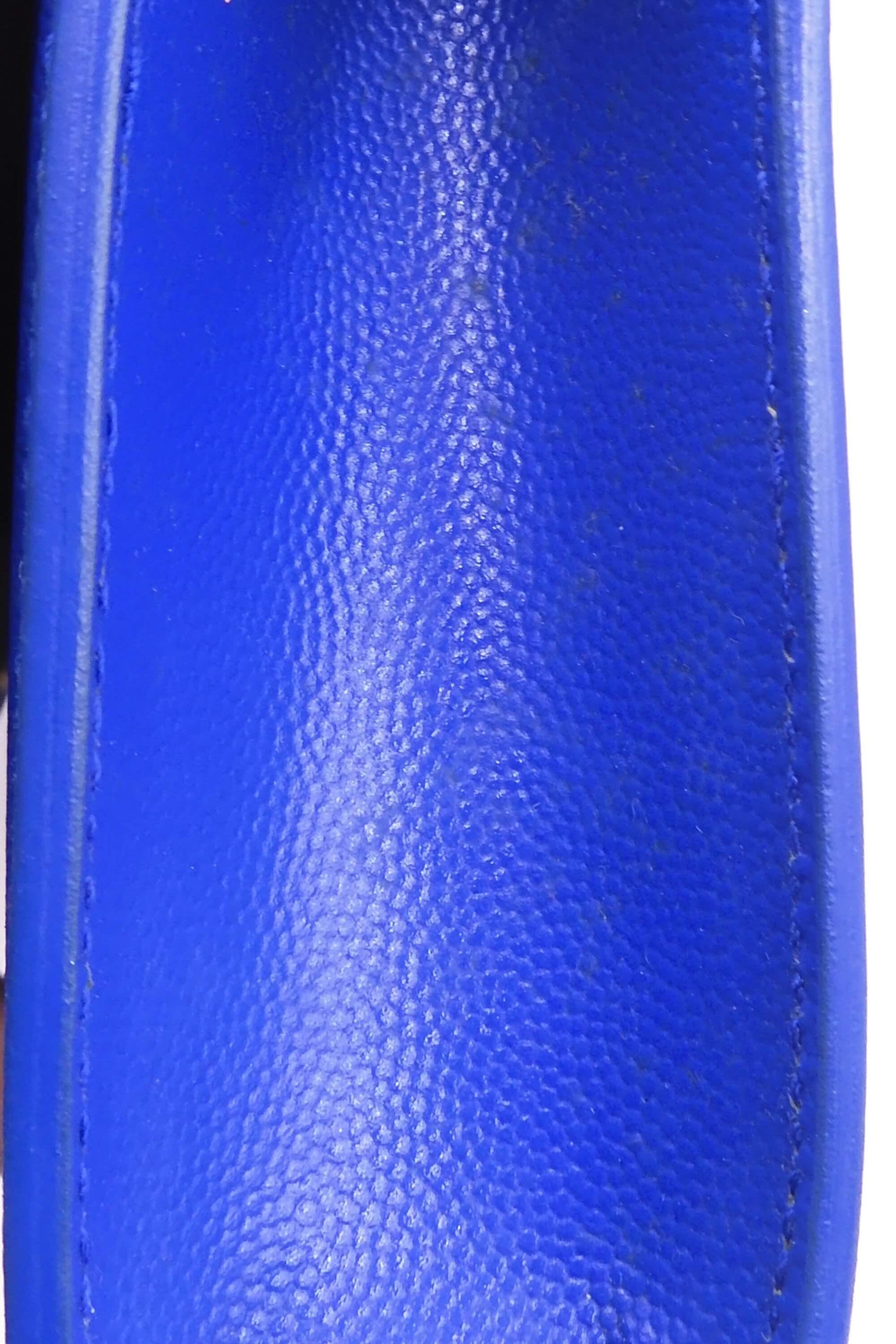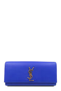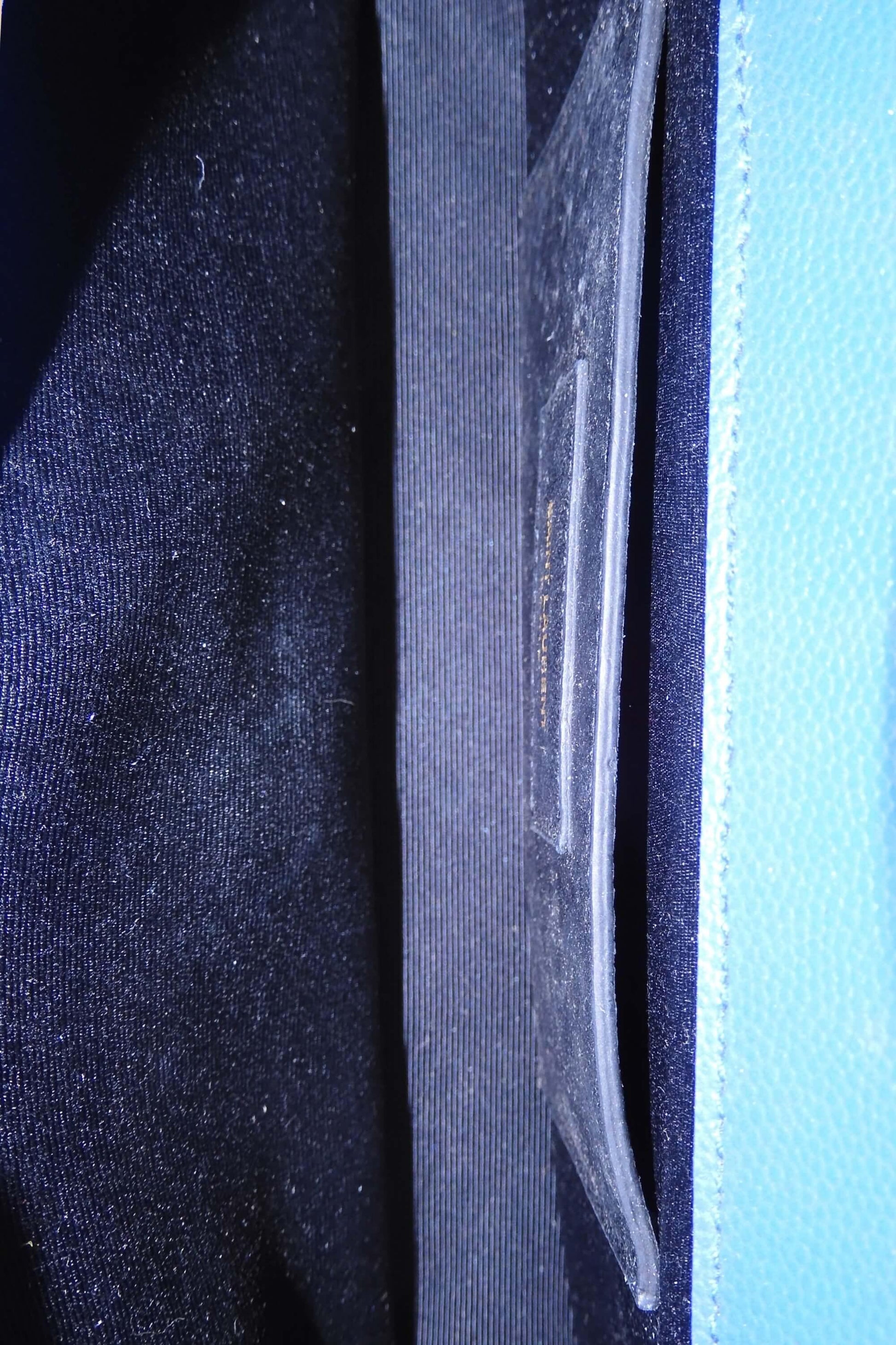 Masterfully crafted in beautiful blue grain de poudre textured calfskin leather, this clutch bag will complement any elegant outfit. Black canvas lines the interior, which also includes a slot pocket for smaller items. Gracing the front of the clutch is the interlocking YSL signature in gold-toned hardware, covering the magnetic snap closure.