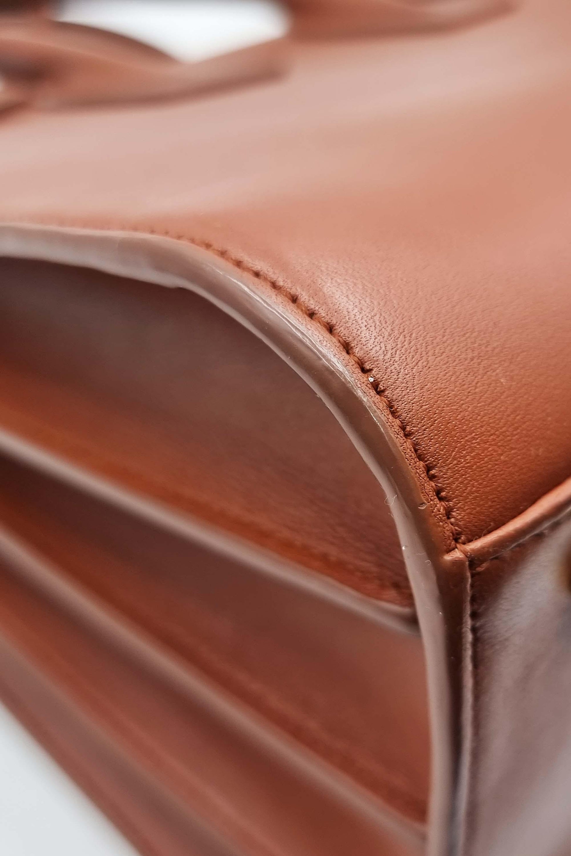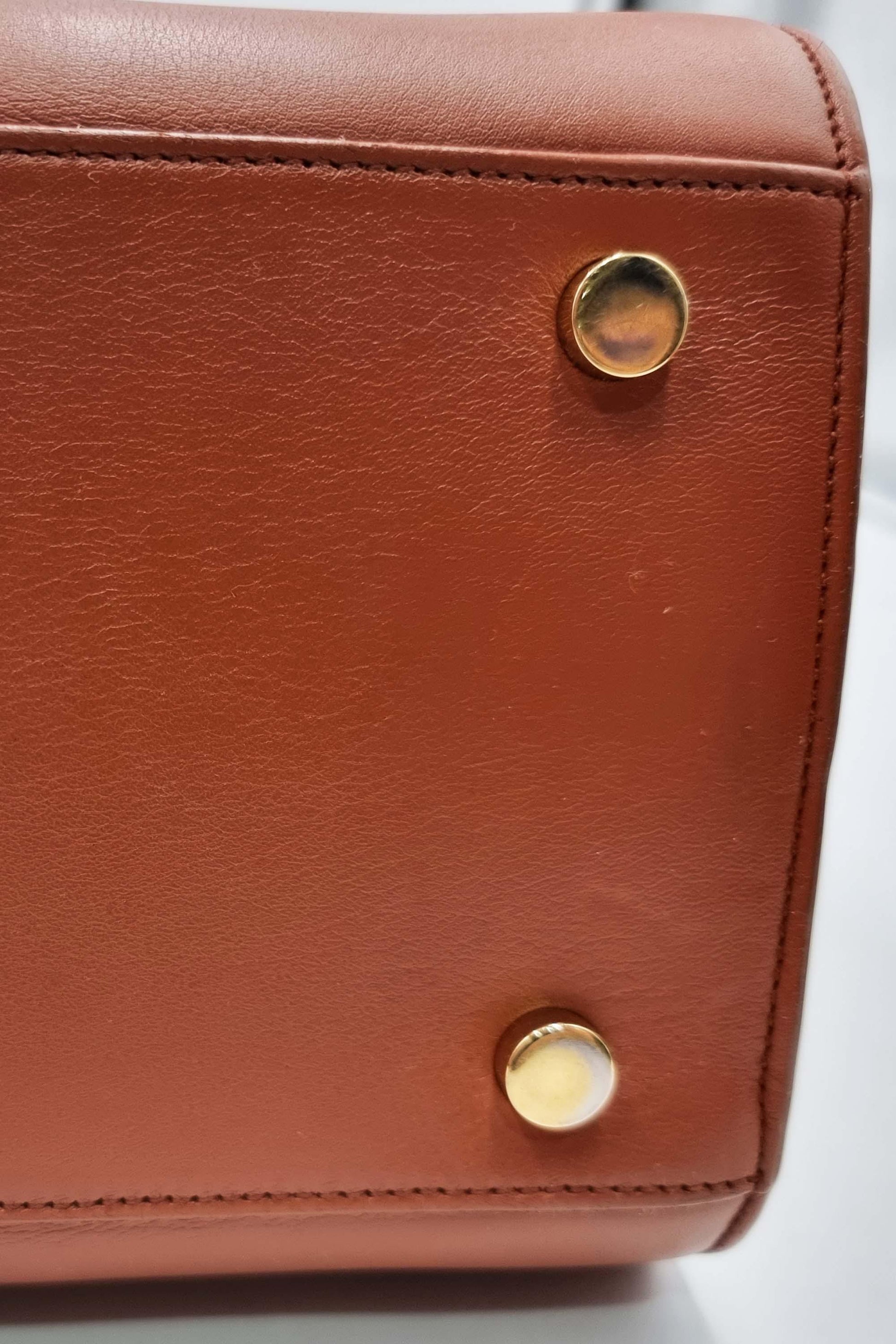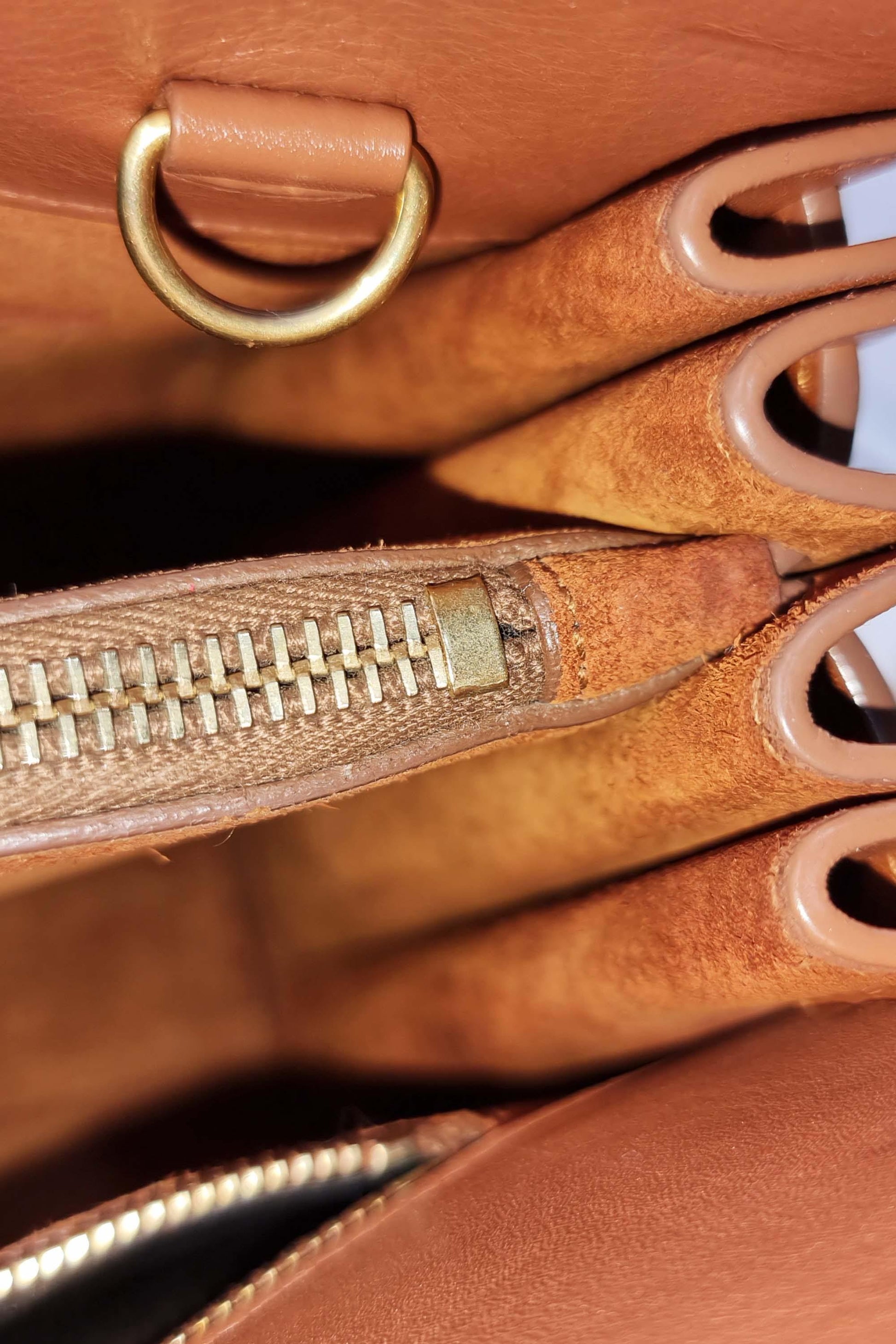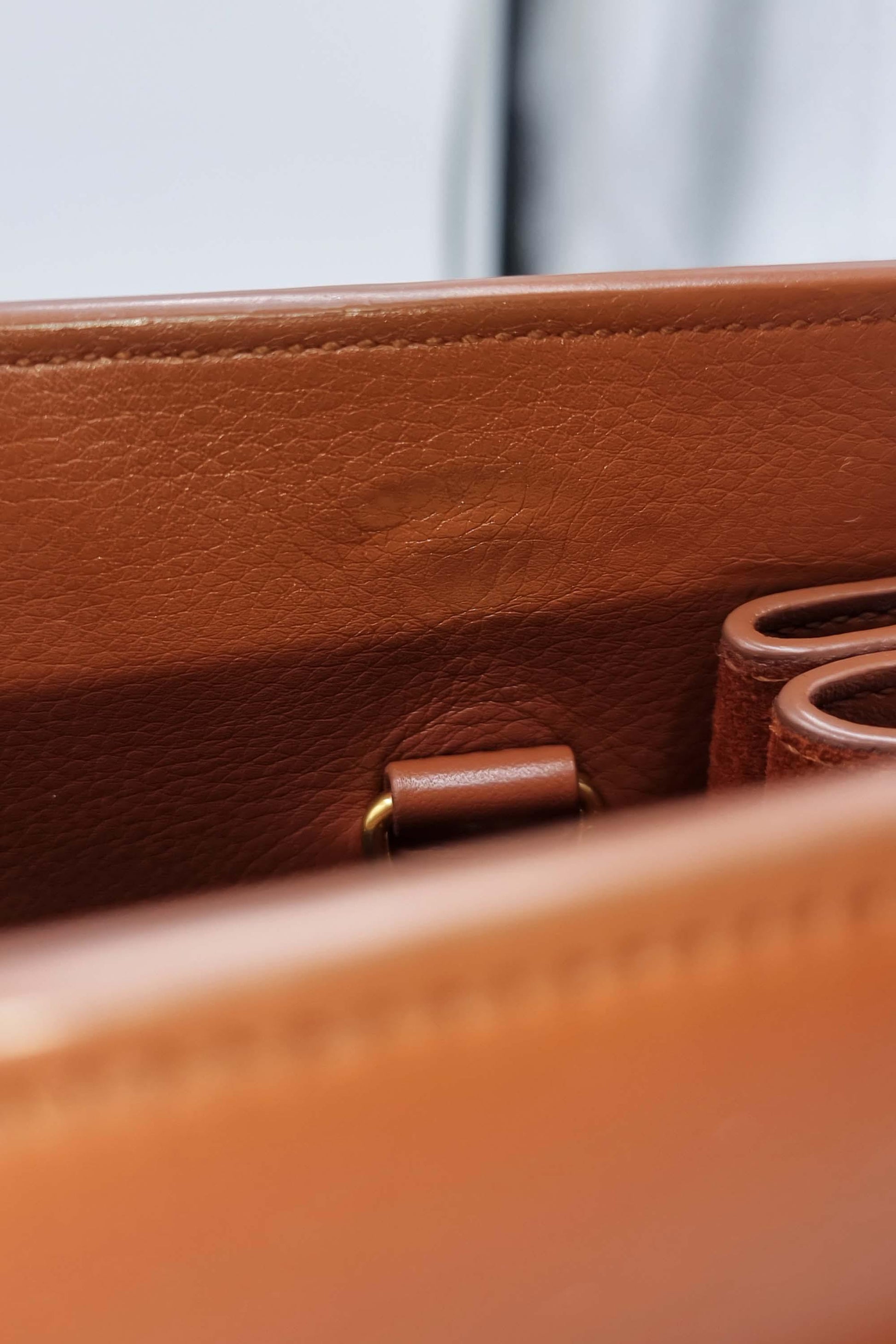 Exterior has minor leather creases & scratch. Zipper hardware have minor scratches. Metal feet have slight discolorations and scratches. Slight discolor lining and dent on the top leather interior.