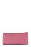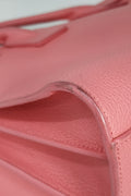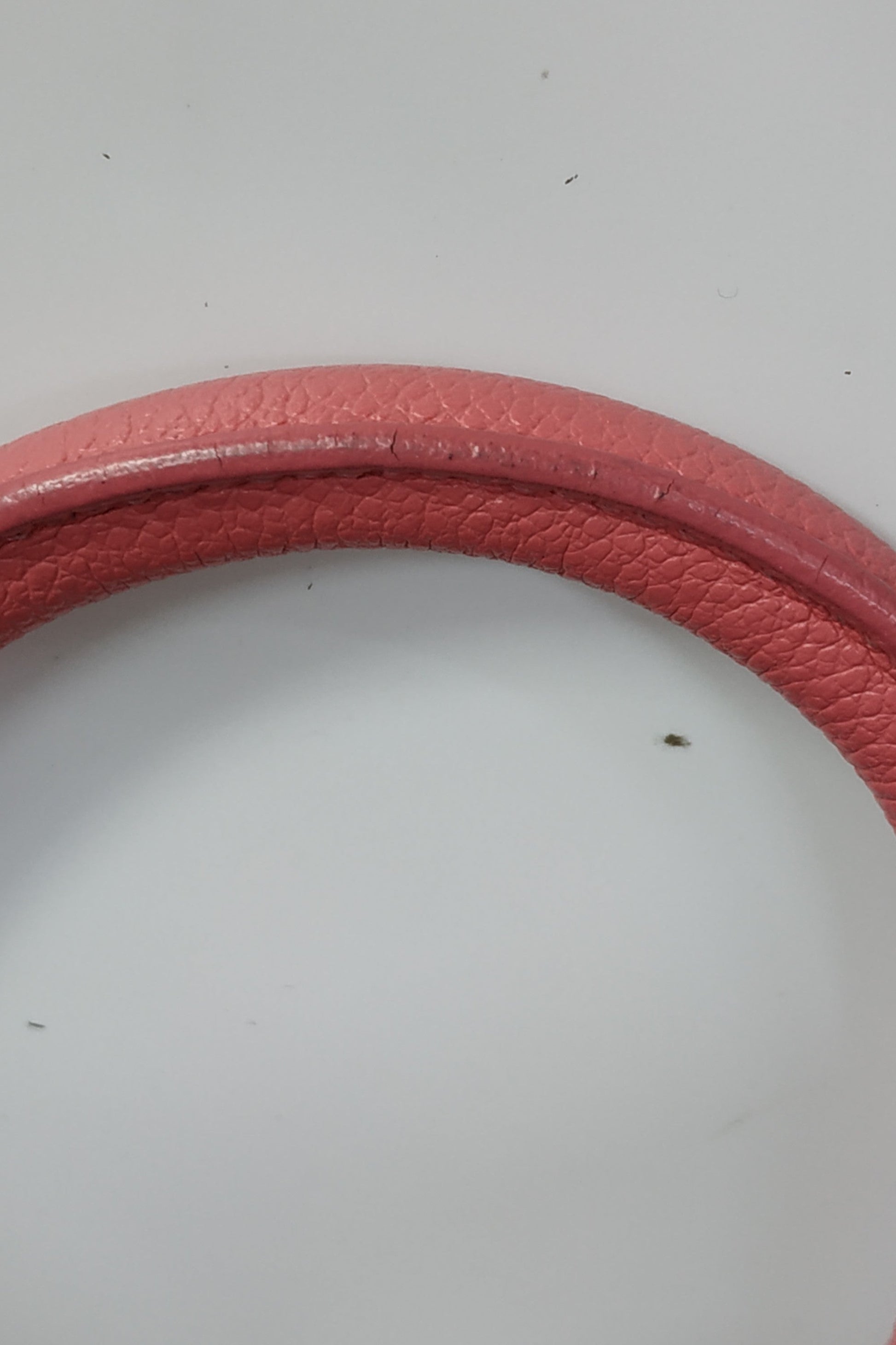 Bag out of shape. Discoloration on corners. Slight cracking on handle edging. Interior has pen ink stains.