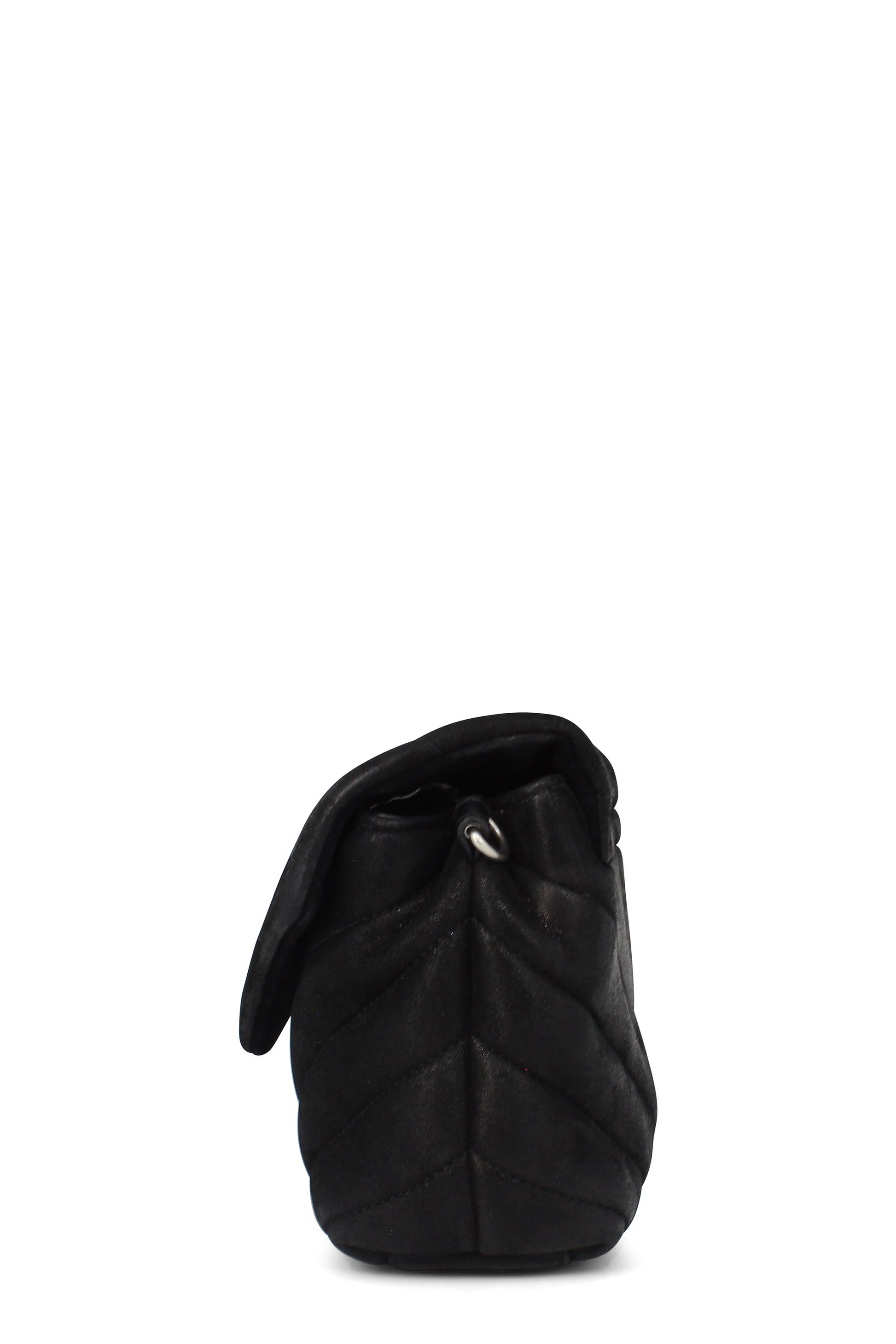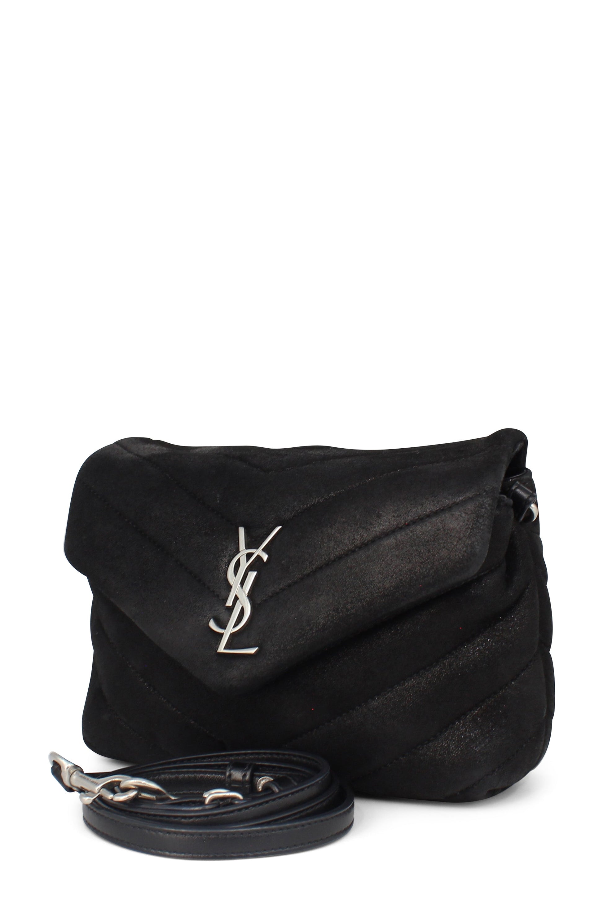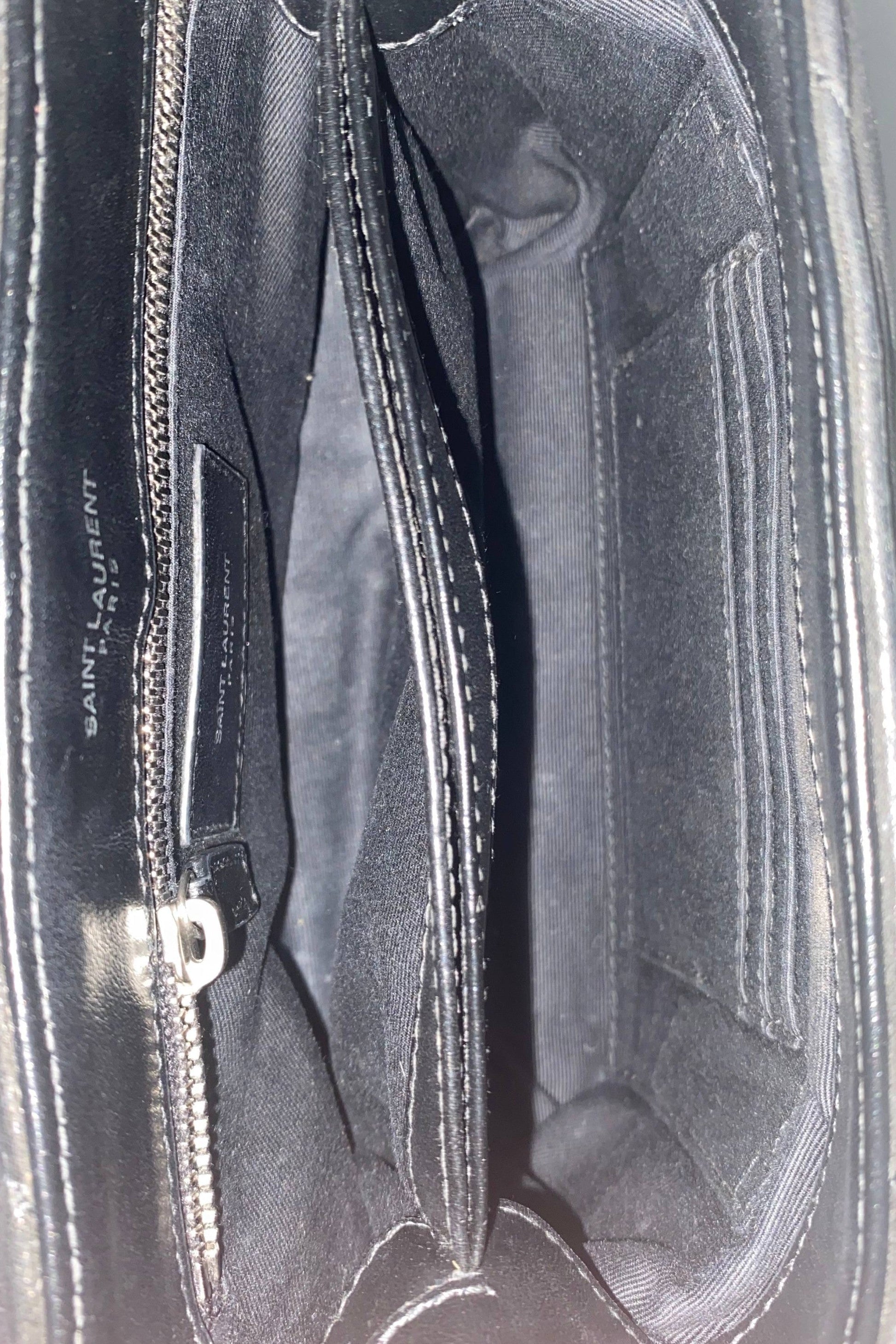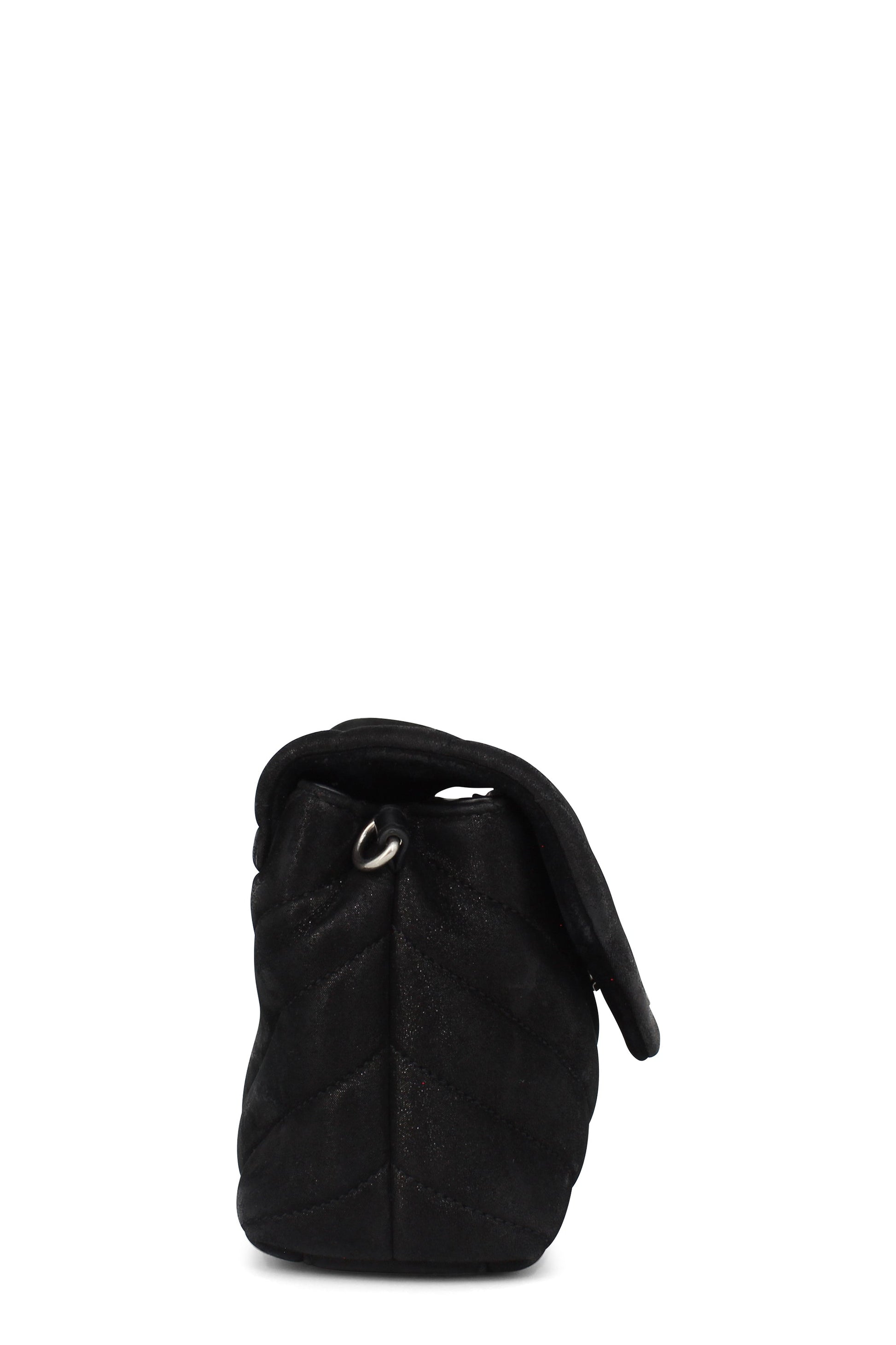 NOTE: THIS SALE ITEM CANNOT BE RETURNED, EXCHANGED, OR REFUNDED. Black matelassé leather Saint Laurent Loulou Toy bag with silver-tone hardware, single detachable flat shoulder strap with peg-in-hole adjustment, optional wrist strap, logo adornment at front, three interior compartments, black grosgrain lining, three card slots, dual pockets at interior walls; one with zip closure and magnetic snap closure at front flap. The size guide is approximate and may vary.