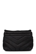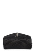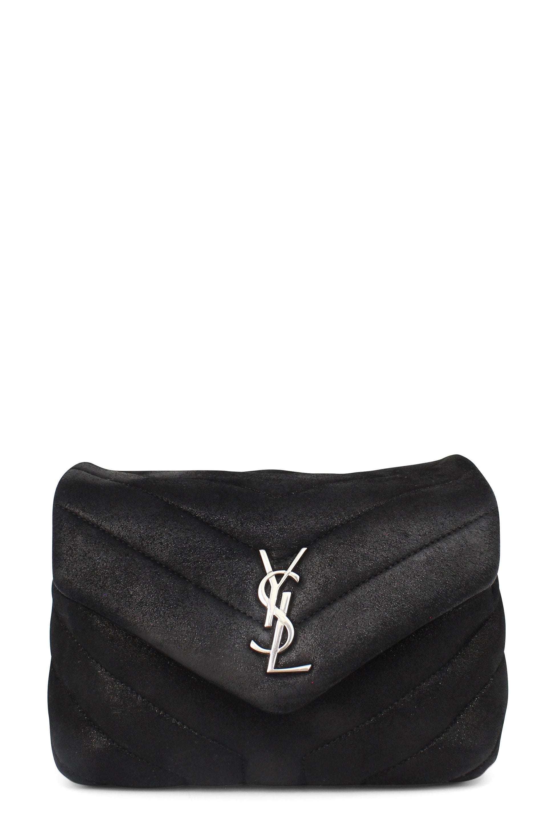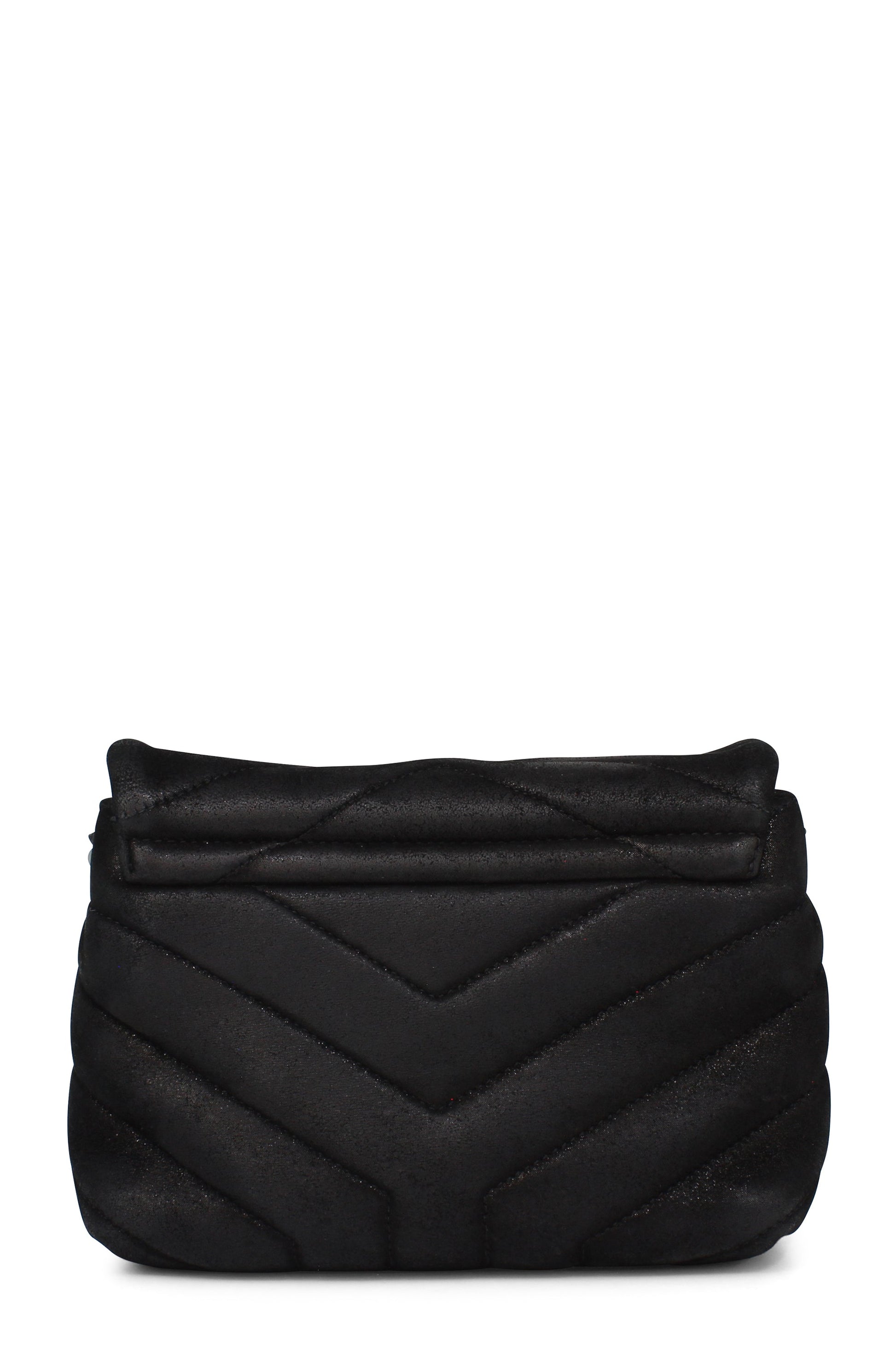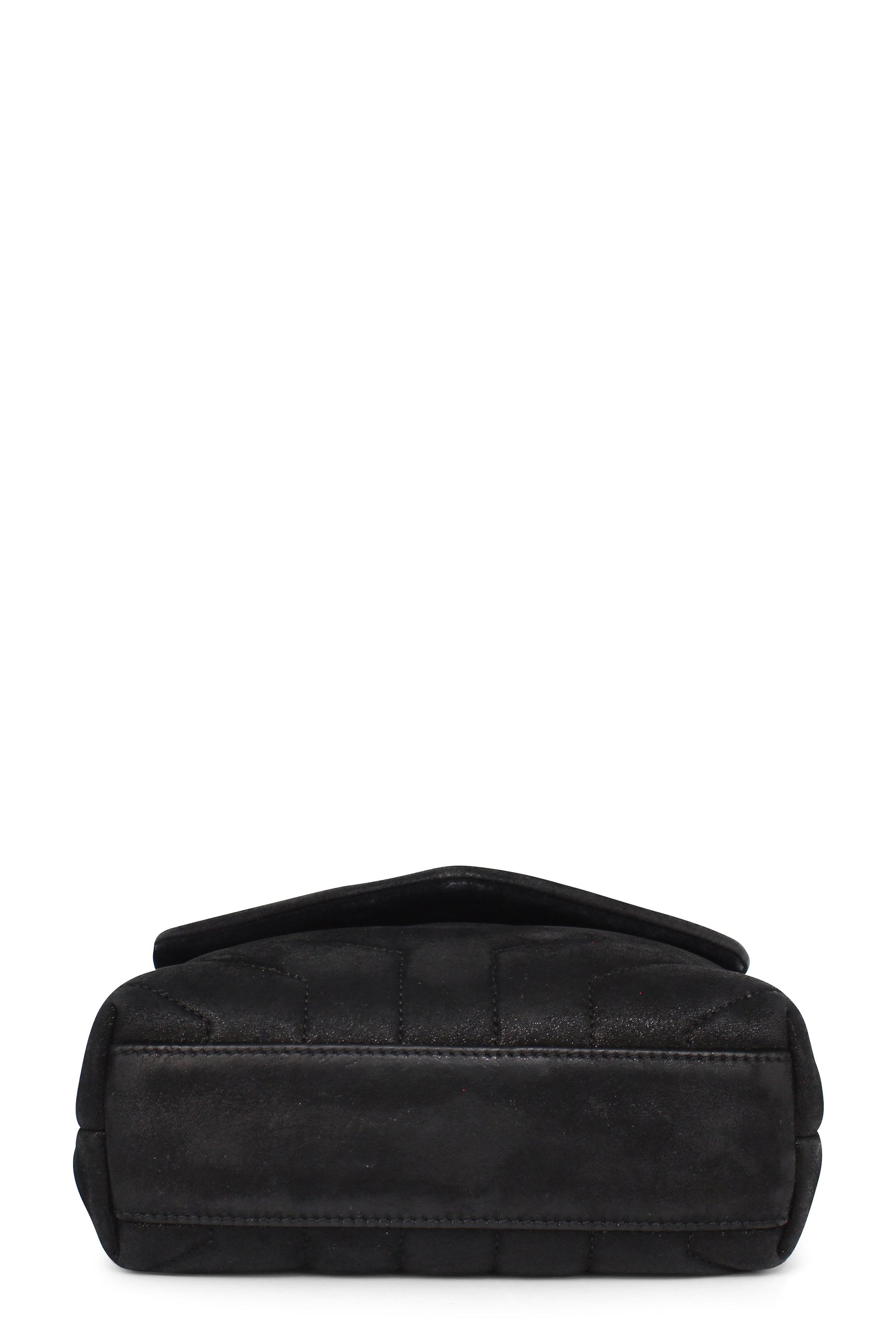 NOTE: THIS SALE ITEM CANNOT BE RETURNED, EXCHANGED, OR REFUNDED. Black matelassé leather Saint Laurent Loulou Toy bag with silver-tone hardware, single detachable flat shoulder strap with peg-in-hole adjustment, optional wrist strap, logo adornment at front, three interior compartments, black grosgrain lining, three card slots, dual pockets at interior walls; one with zip closure and magnetic snap closure at front flap. The size guide is approximate and may vary.