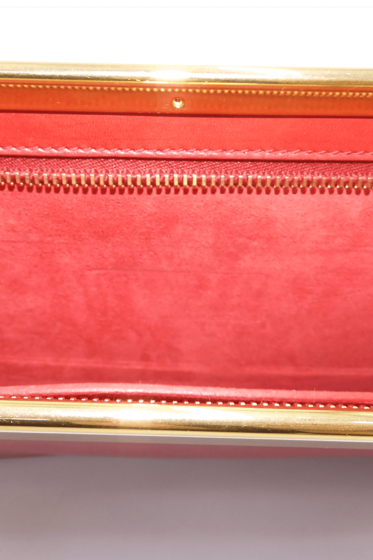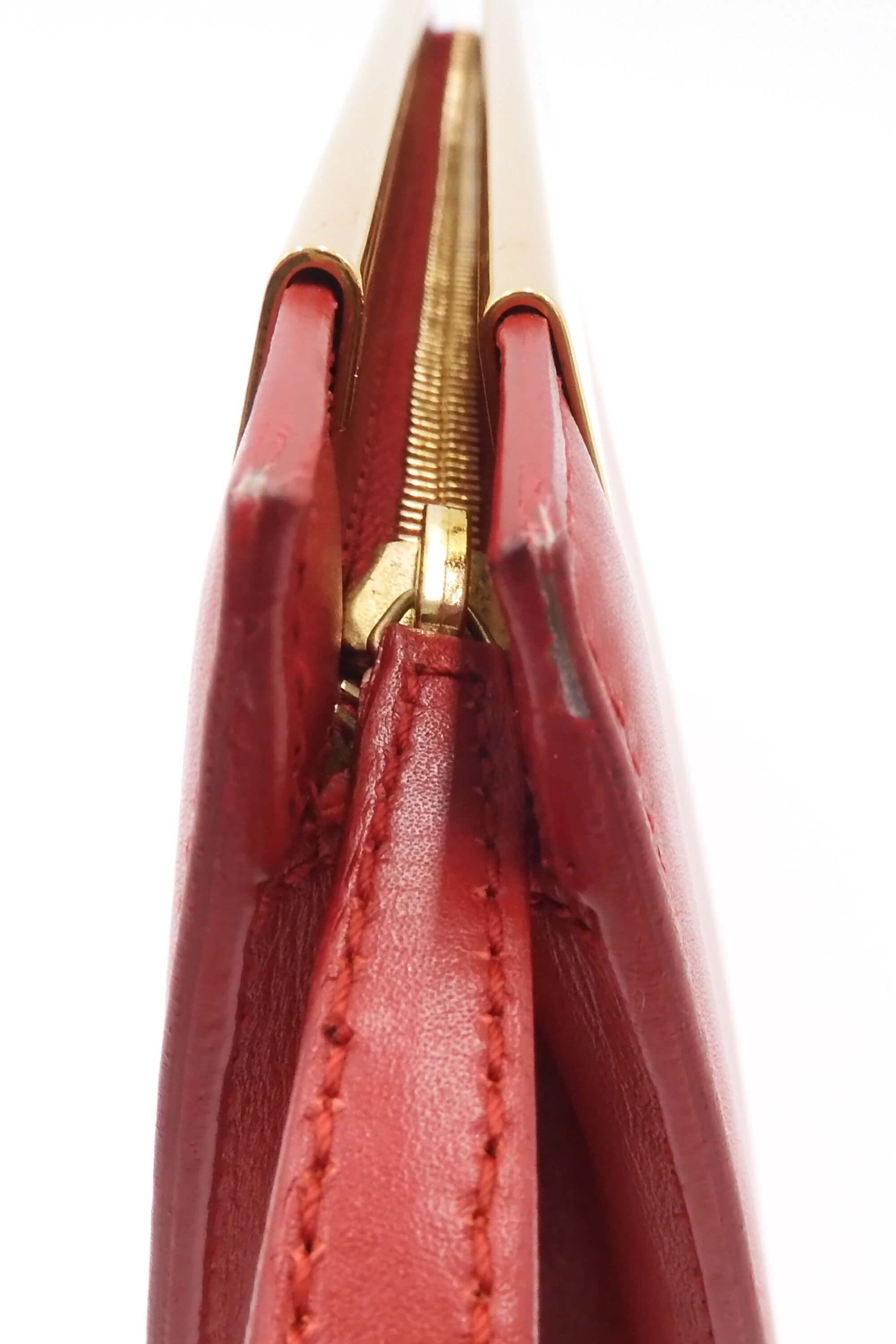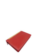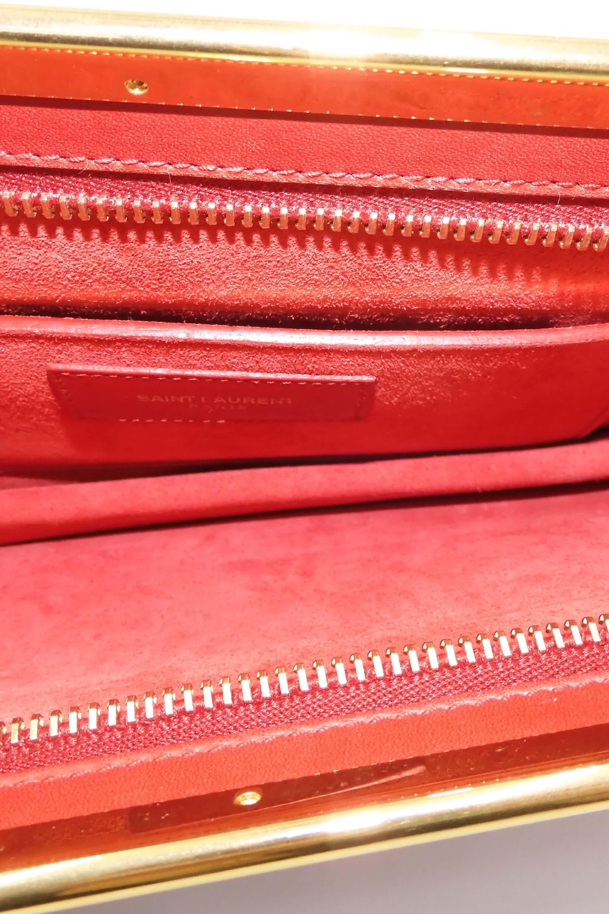 Sleek and minimalist Lutetia clutch from Saint Laurent in classic Red. Crafted in calfskin leather and designed with a top frame with 'SAINT LAURENT' engraved. Features a top zip closure and the interior is lined in suede with a slip pocket.