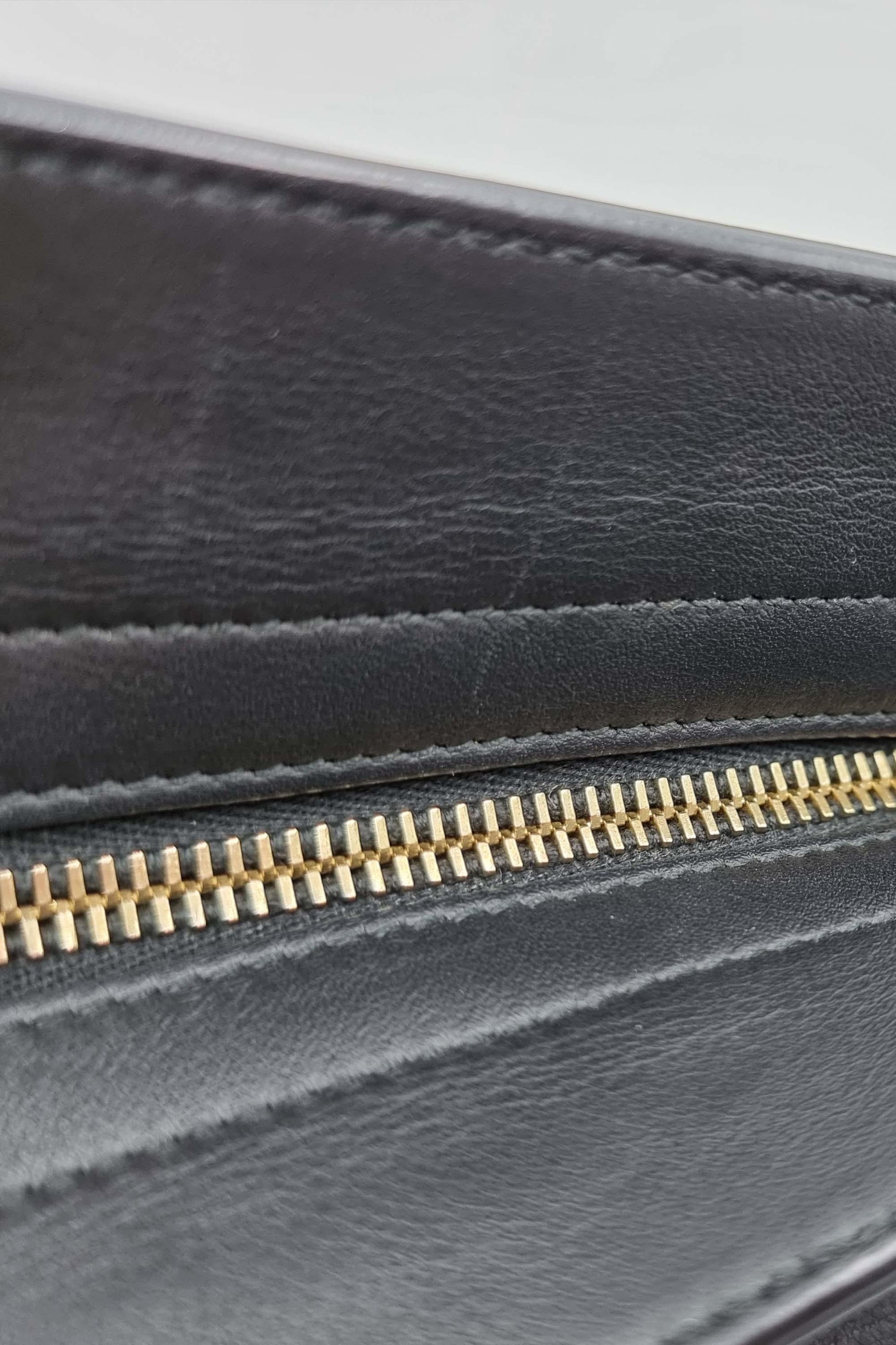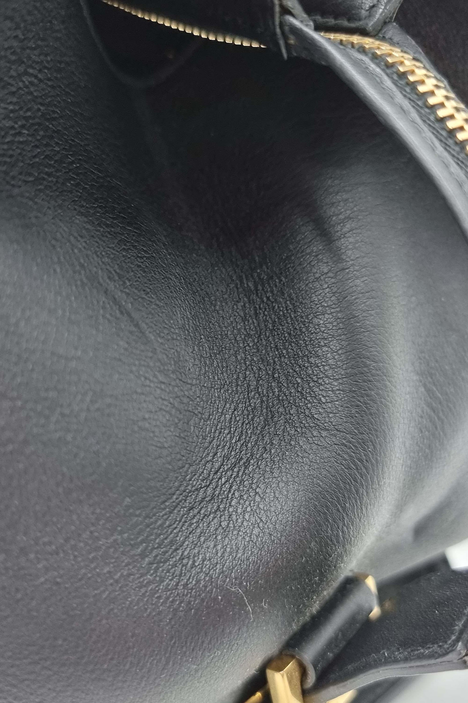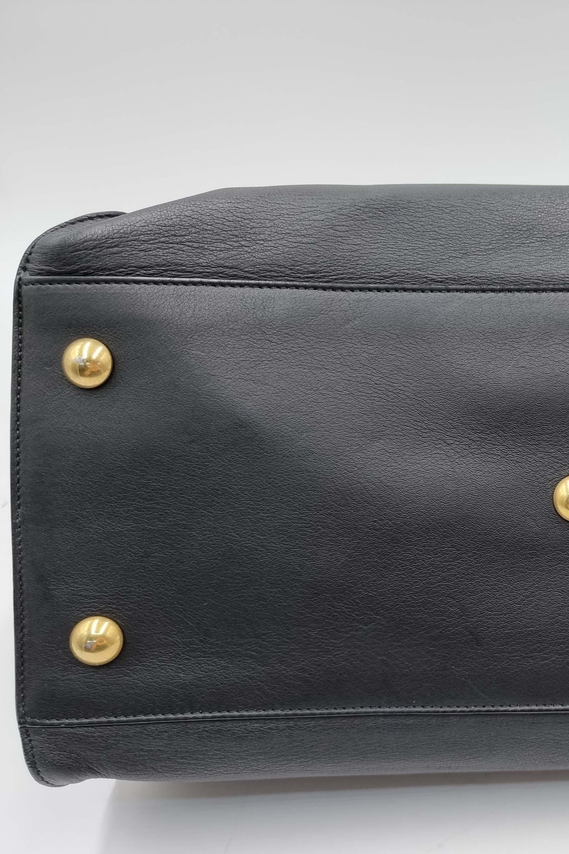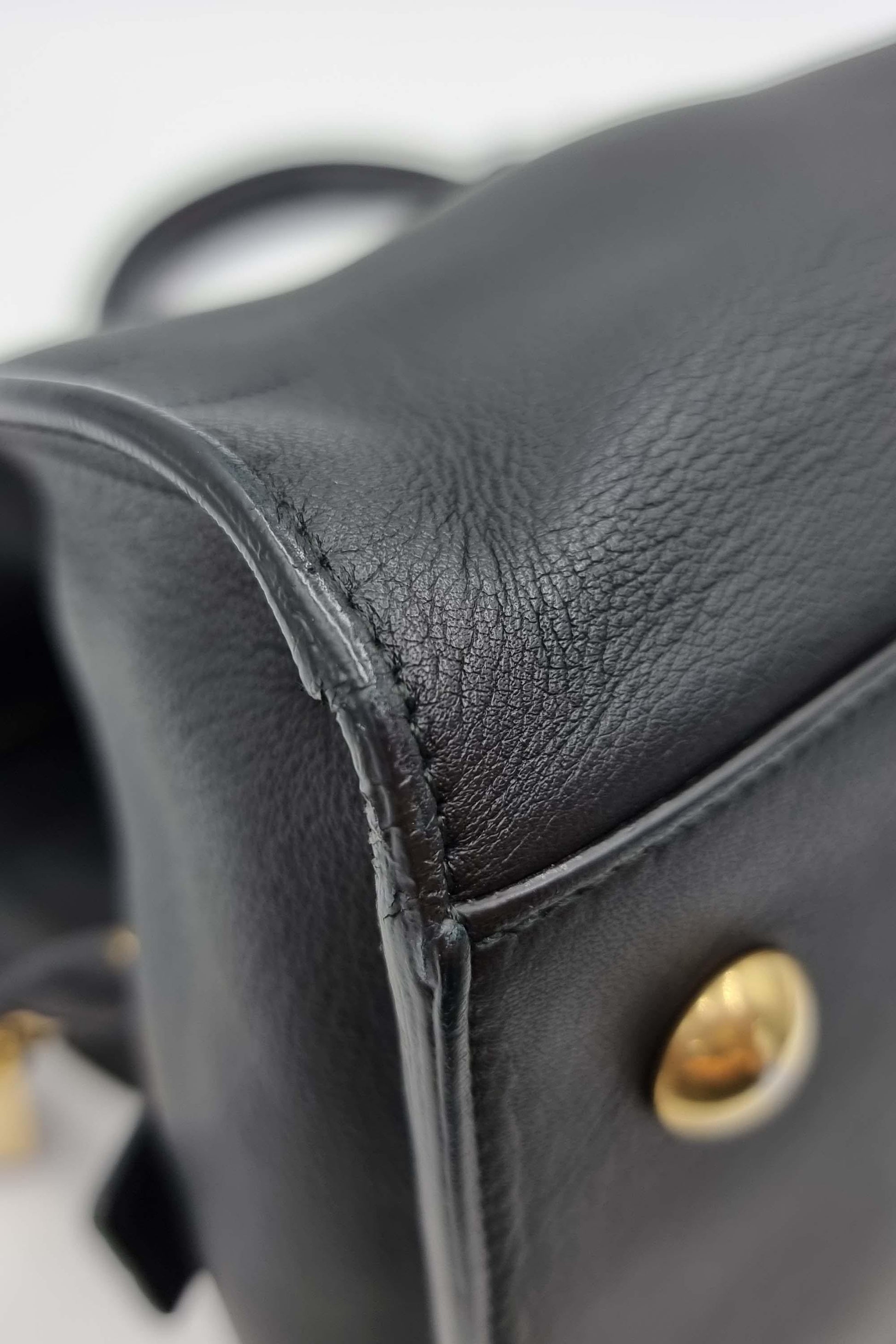 Item is moderately out of shape. Exterior front, back, bottom, interior lining, logo hardware and studs are scratched. Exterior corners are peeling. Studs have discoloration. Exterior front, back, sides, bottom, interior lining, and zipper pull have creases. Exterior corners and interior lining are stained with transfer of colour.