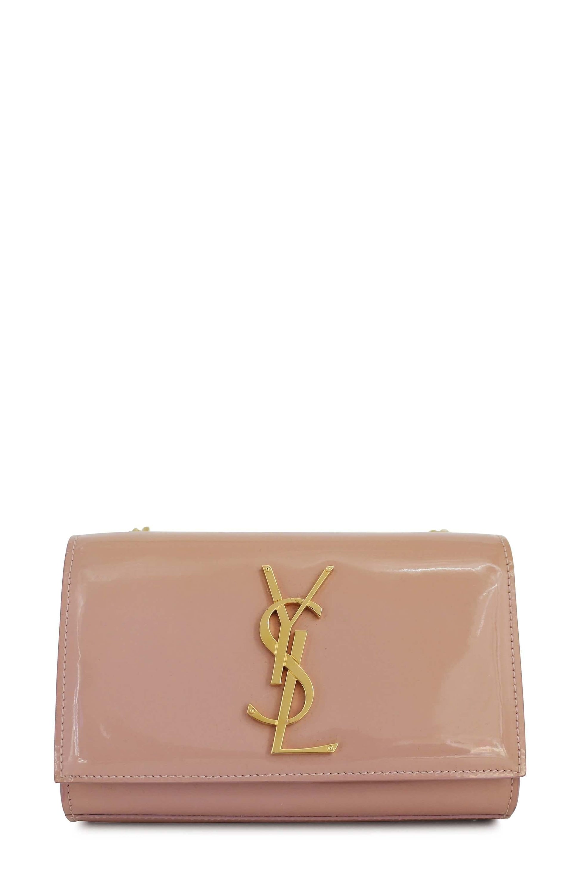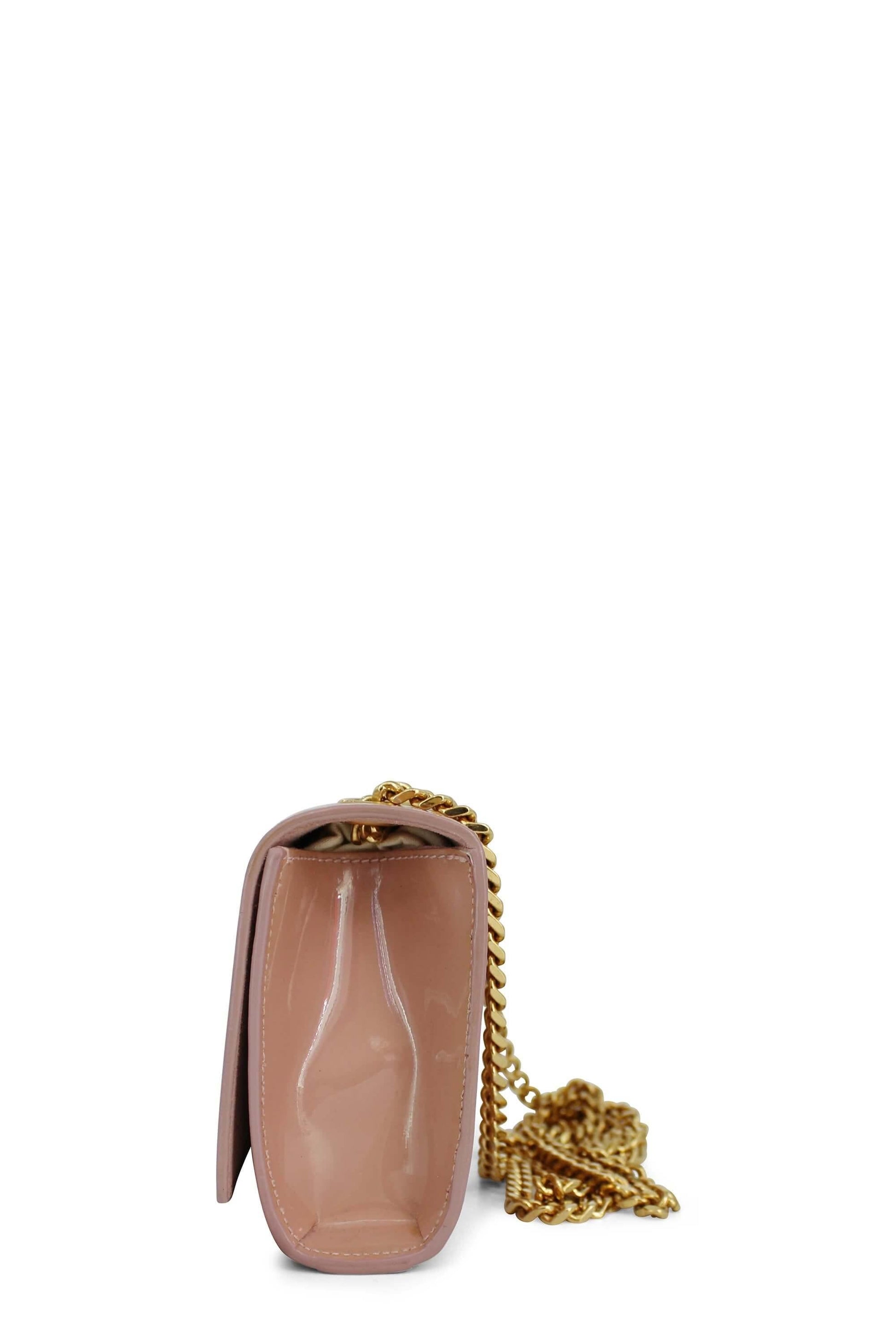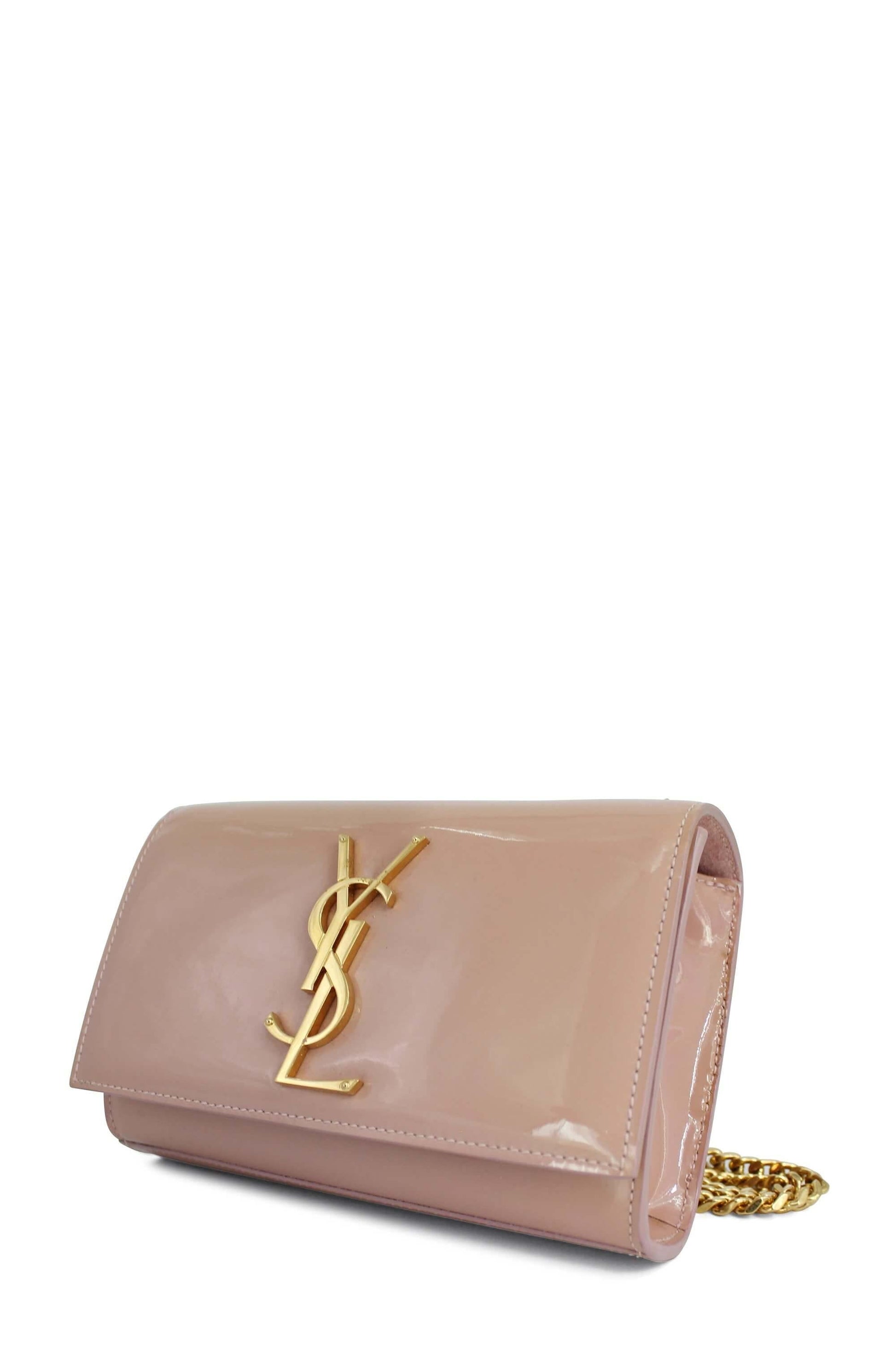 This stylish bag is crafted of high gloss patent leather in pink. The bag features a full frontal flap with a classic gold YSL logo and a gold chain cross-body strap. The flap opens to a matching pink suede interior with a flat pocket.