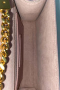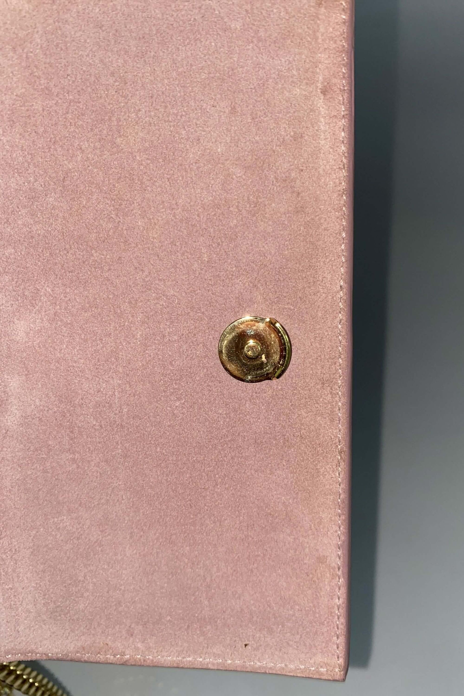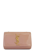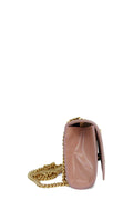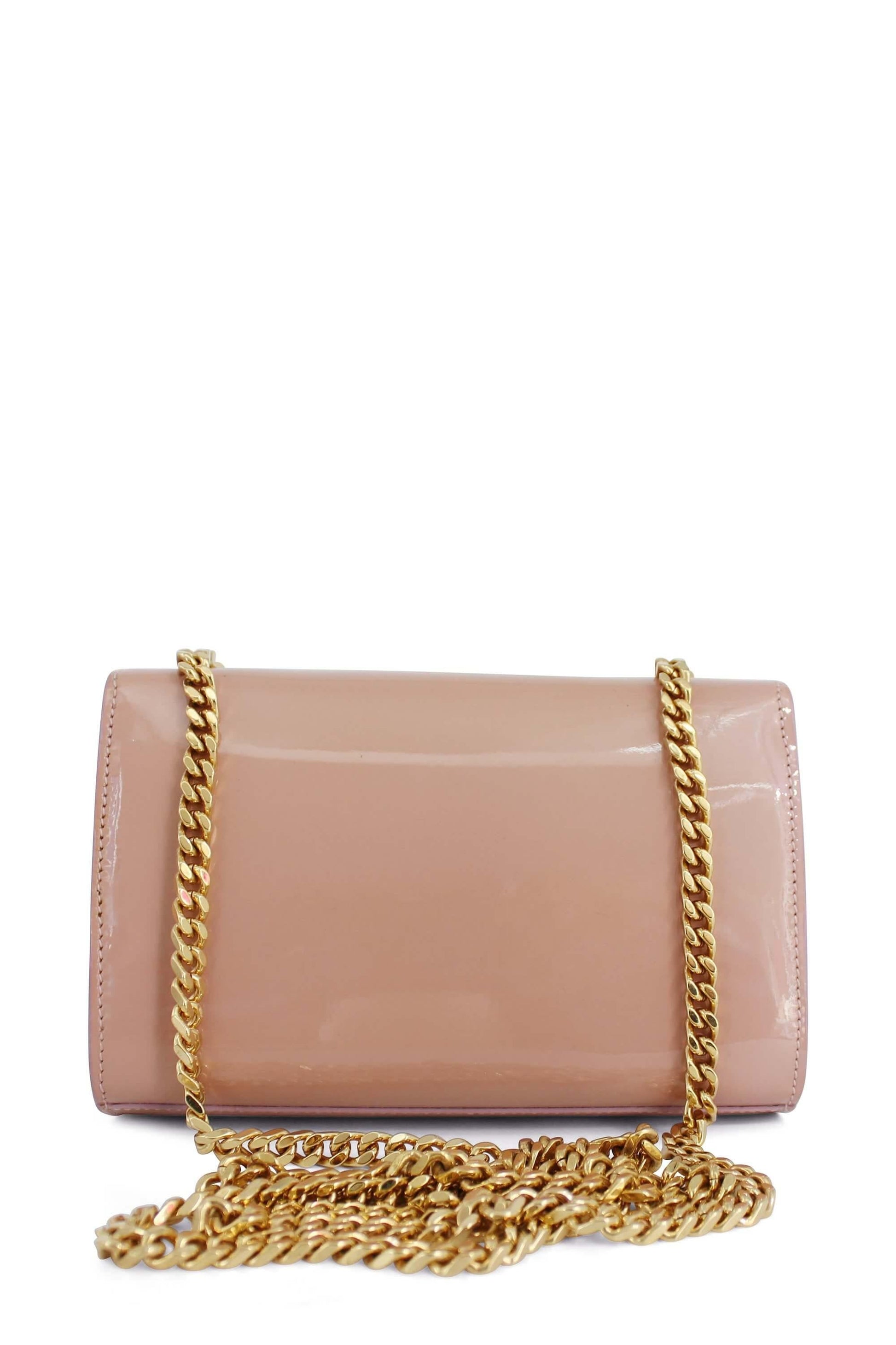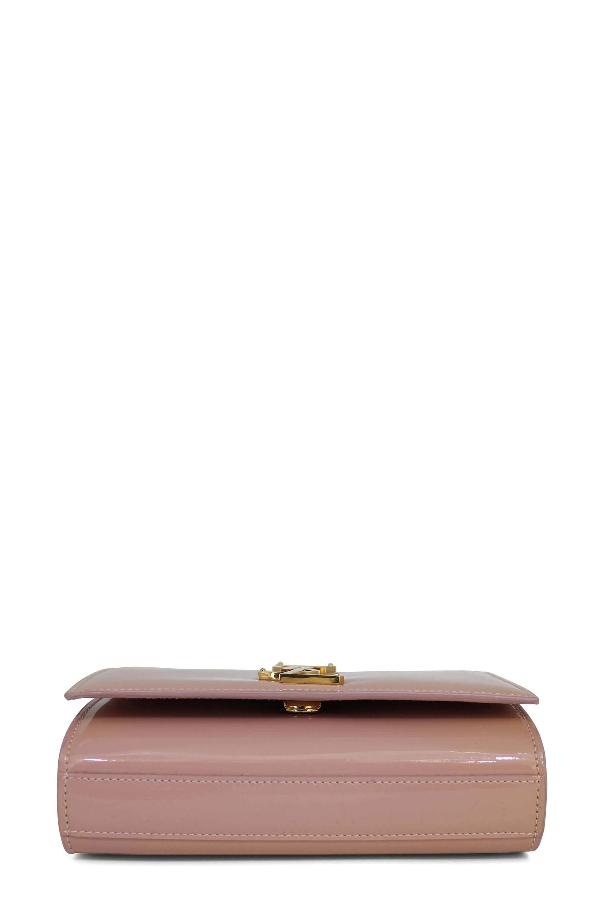 This stylish bag is crafted of high gloss patent leather in pink. The bag features a full frontal flap with a classic gold YSL logo and a gold chain cross-body strap. The flap opens to a matching pink suede interior with a flat pocket.