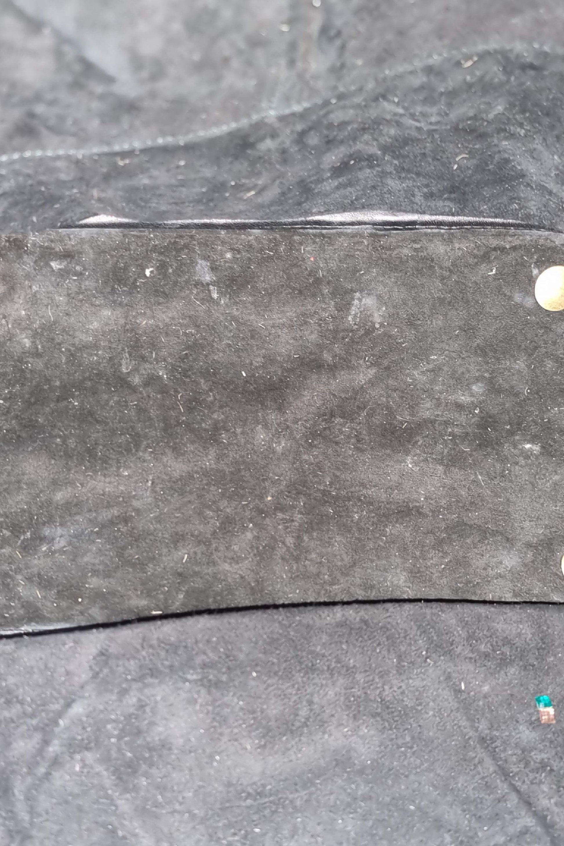 Exterior front is peeling. Bottom has creases. Interior lining and studs are scratched and have discoloration.
