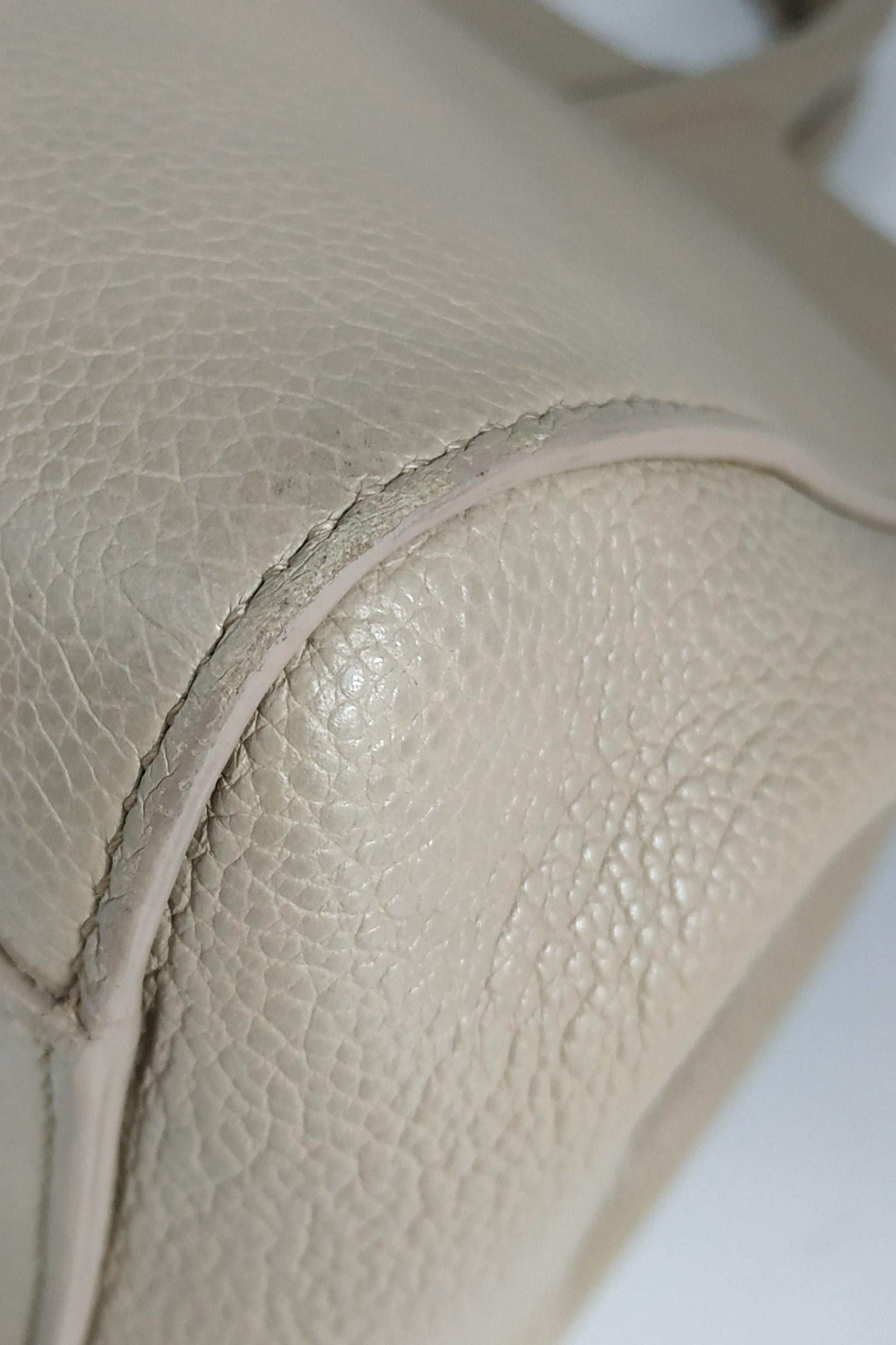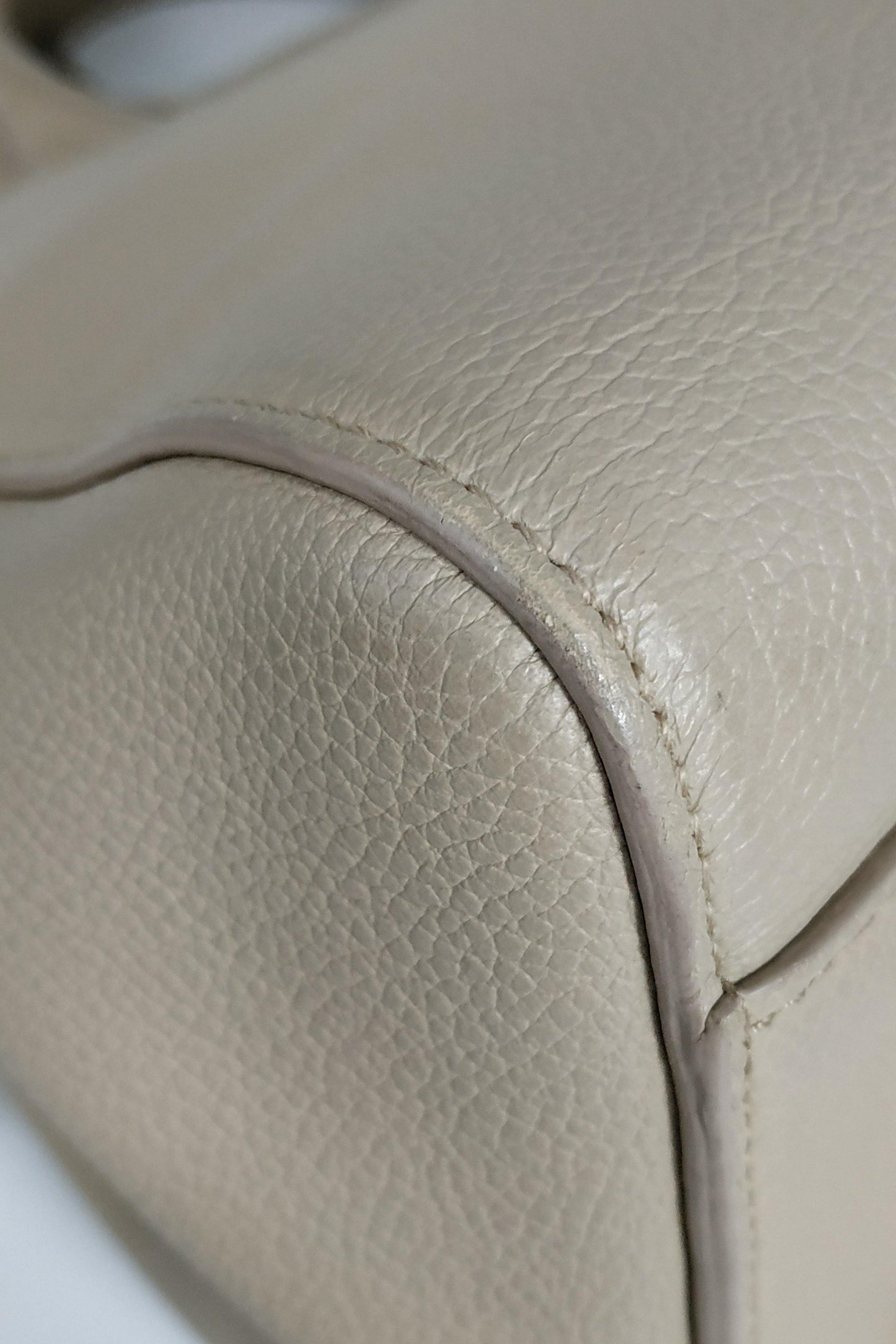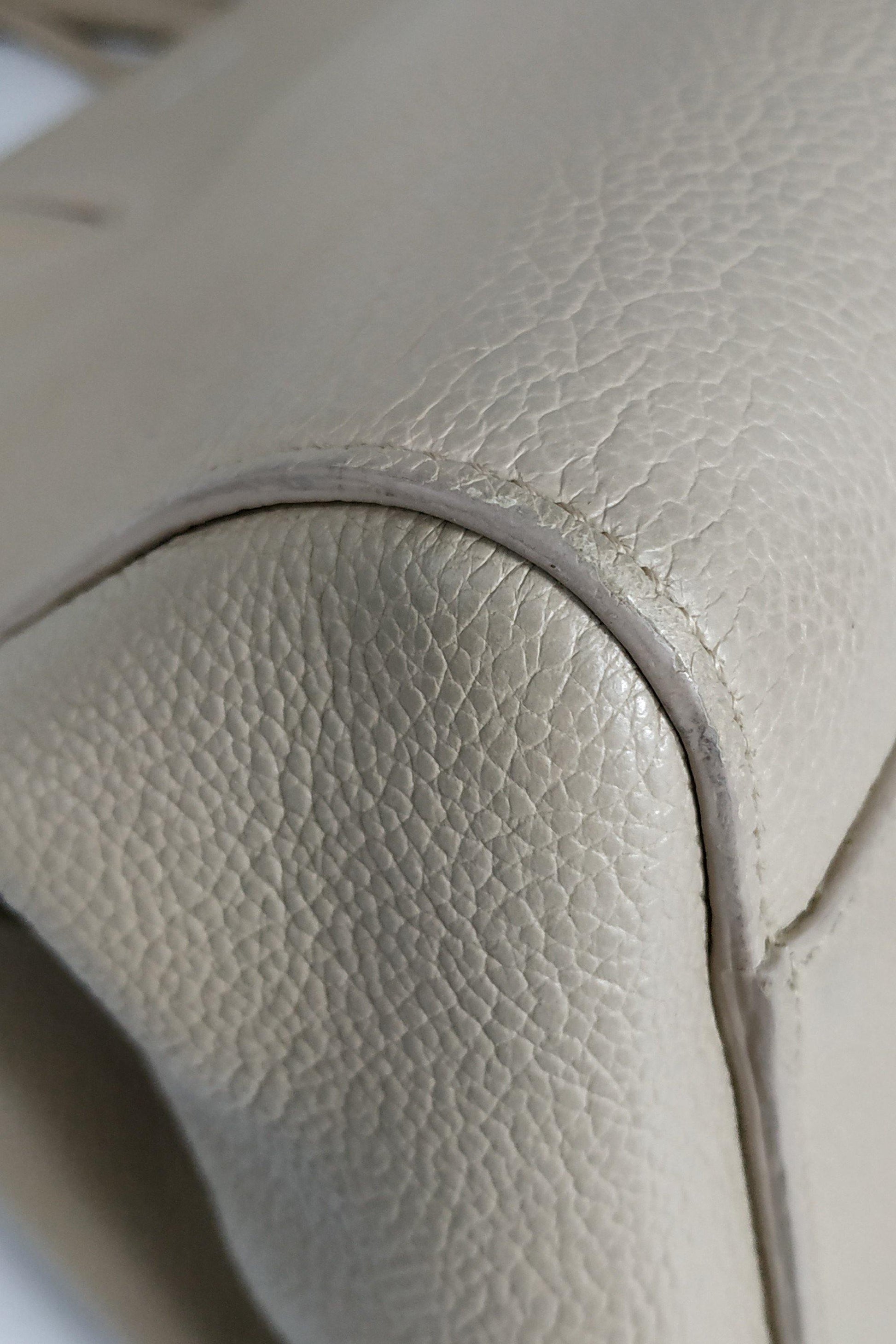 Corners slightly worn. Handle edging cracking. Slight crease at the bag. Stains on interior.