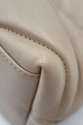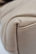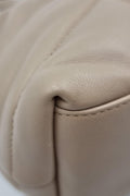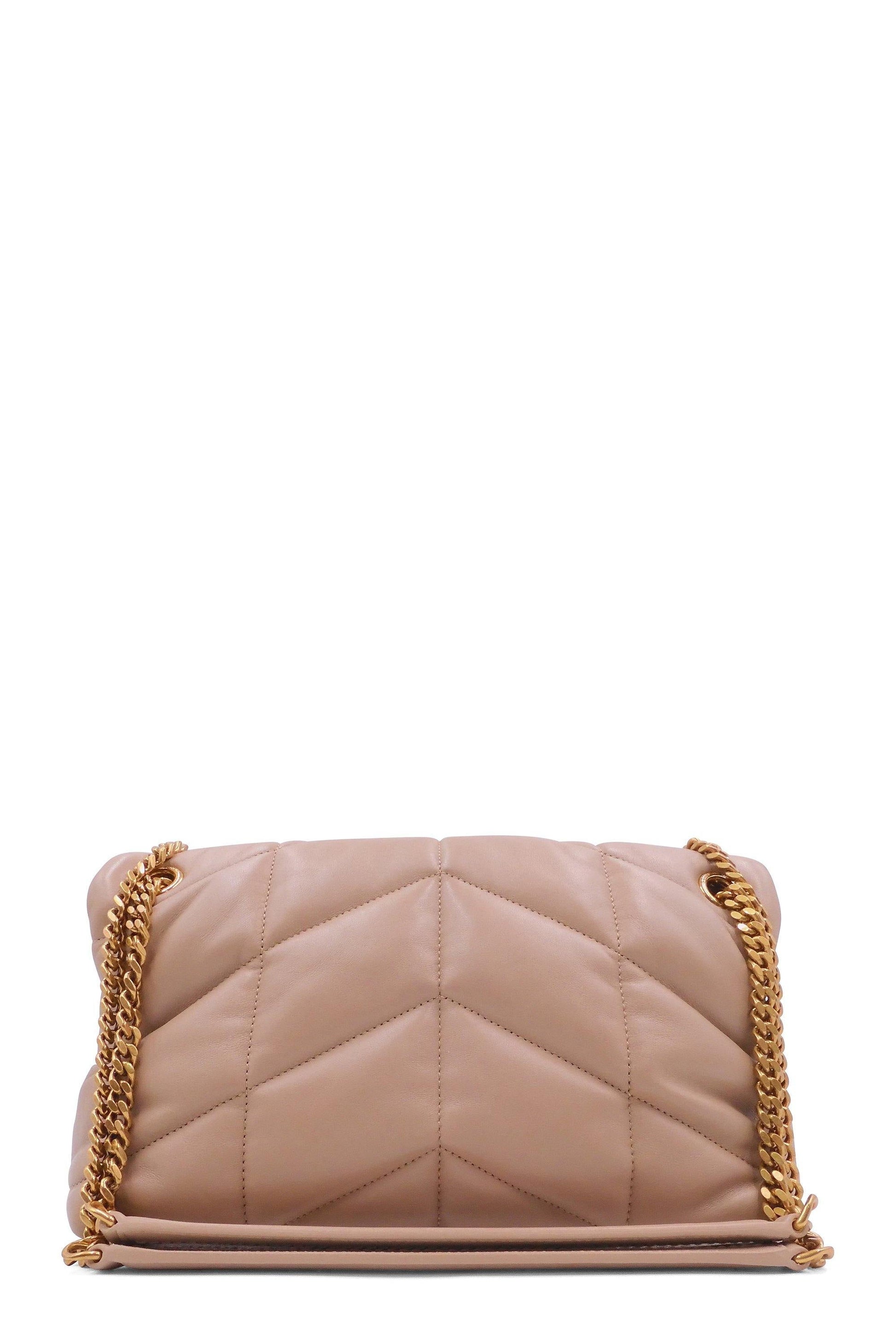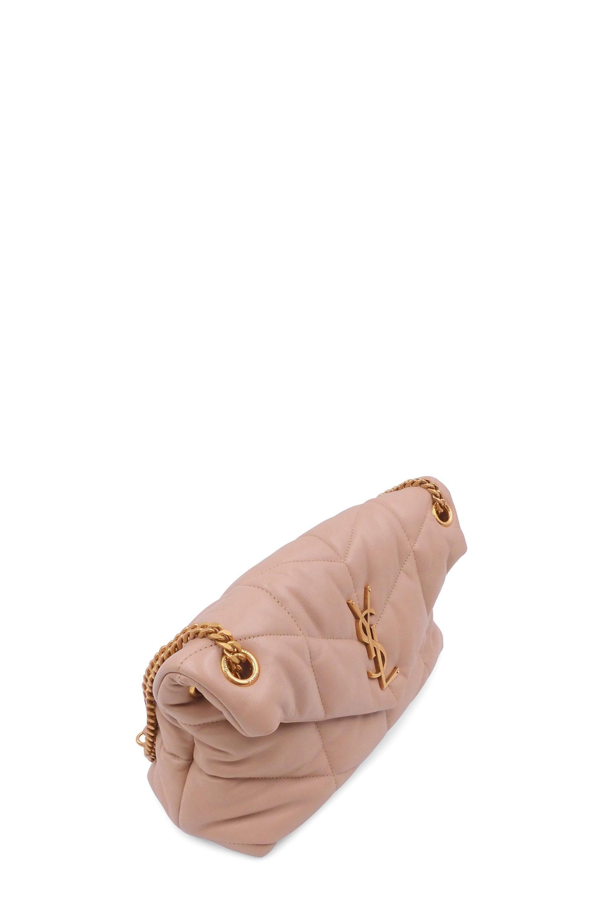 This Saint Laurent Small Loulou Puffer Bag features a smooth nude leather body with gold tone logo plague and chain-link shoulder strap. The foldover top with magnetic fastening opens to a fabric lining with a zippered pocket.