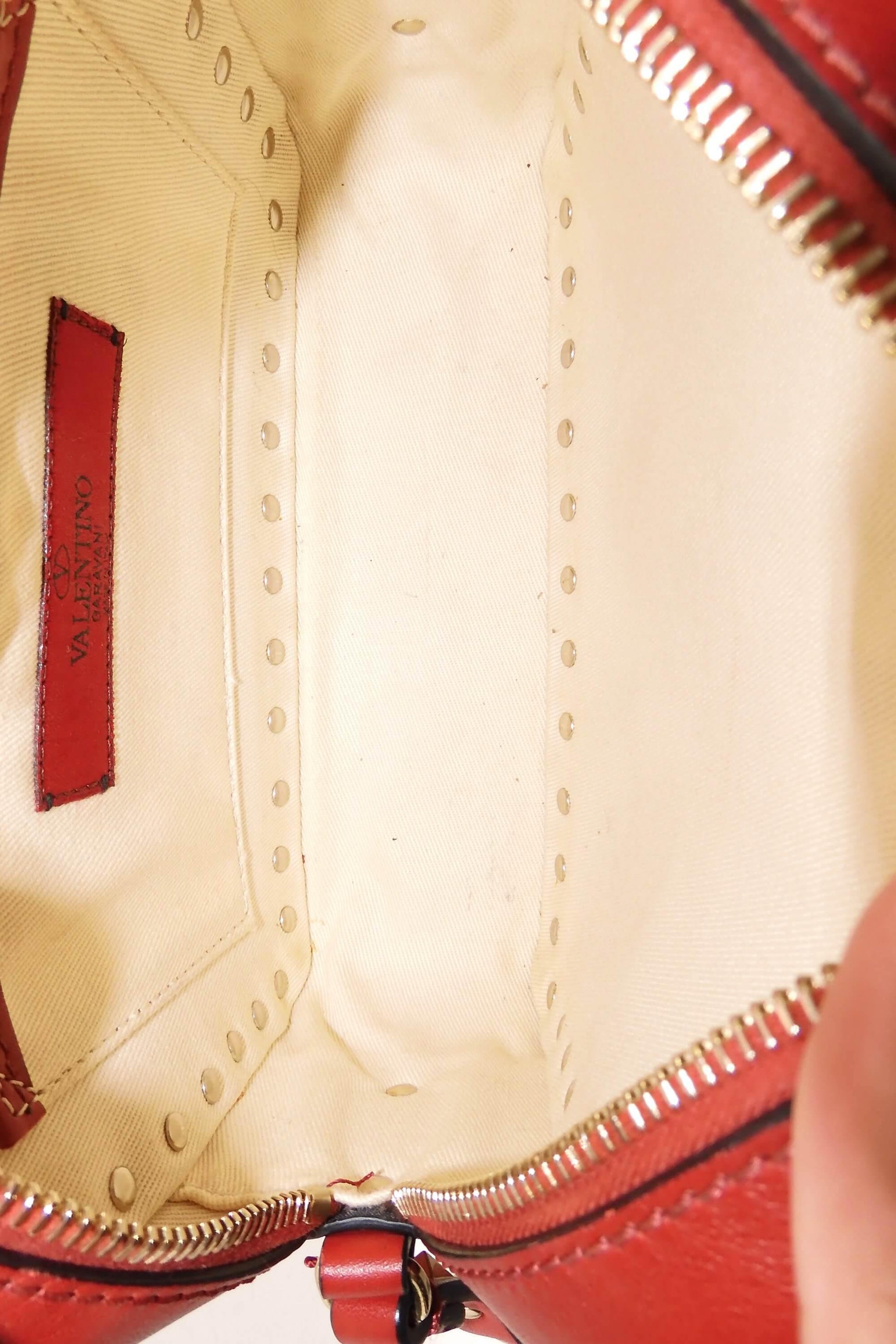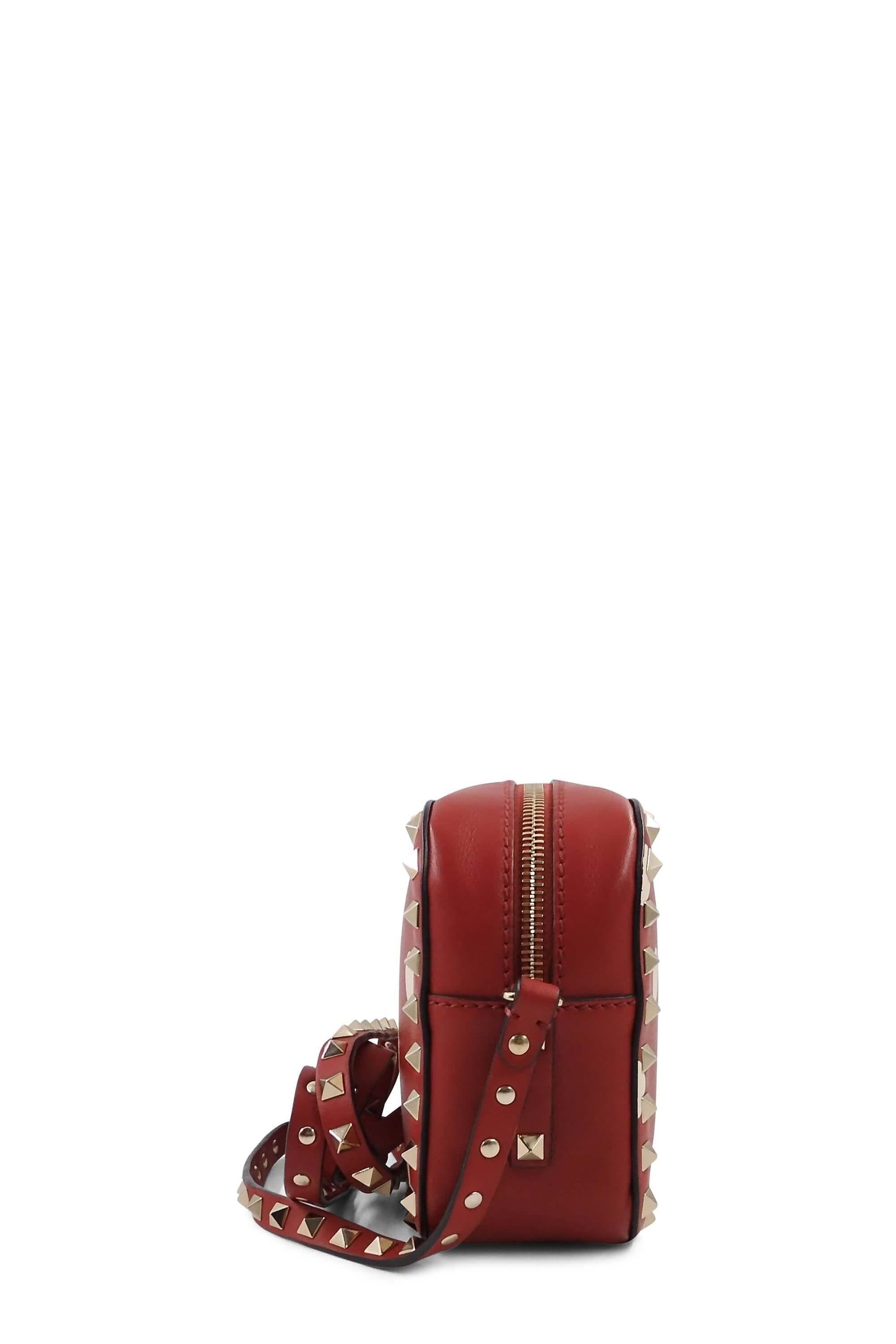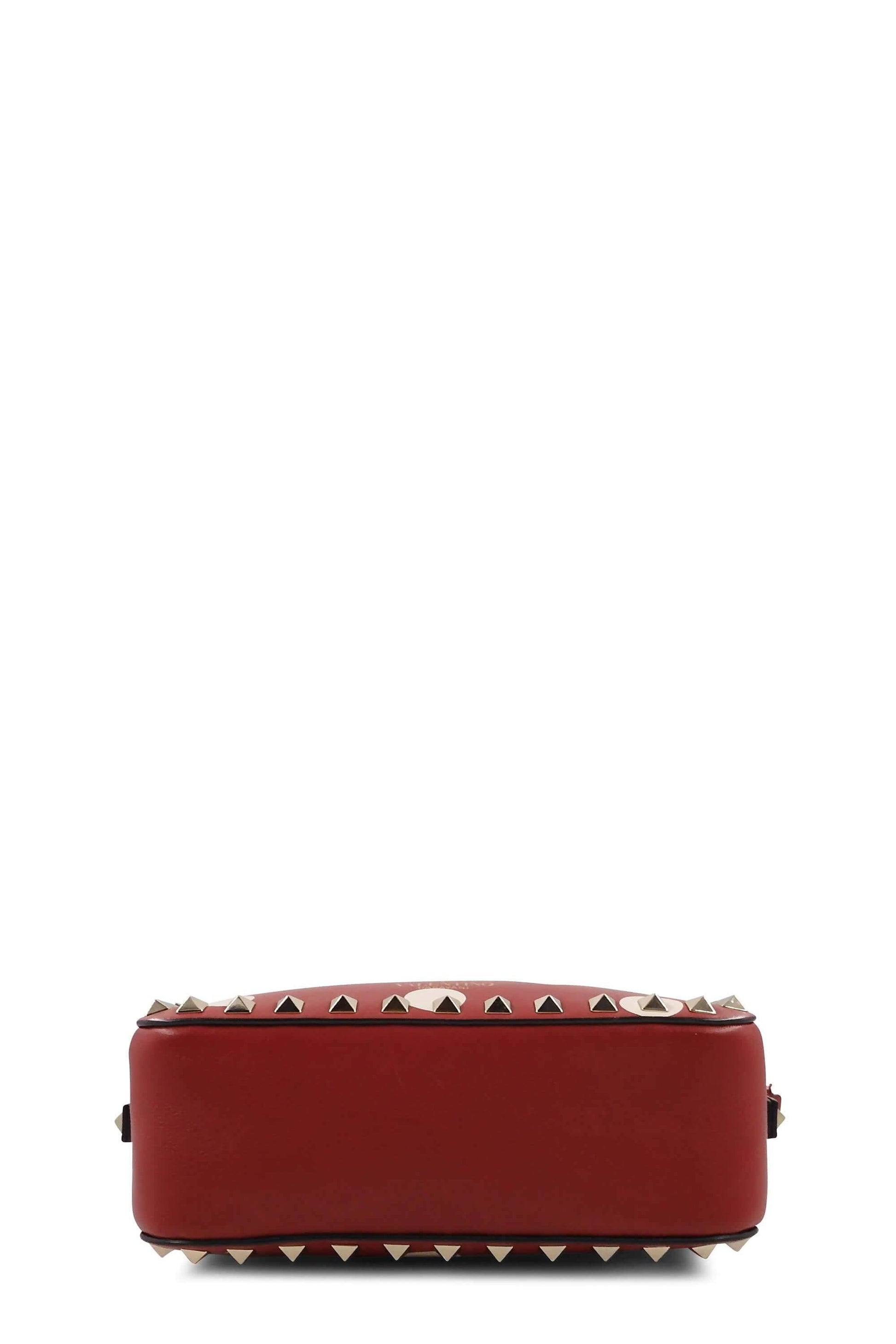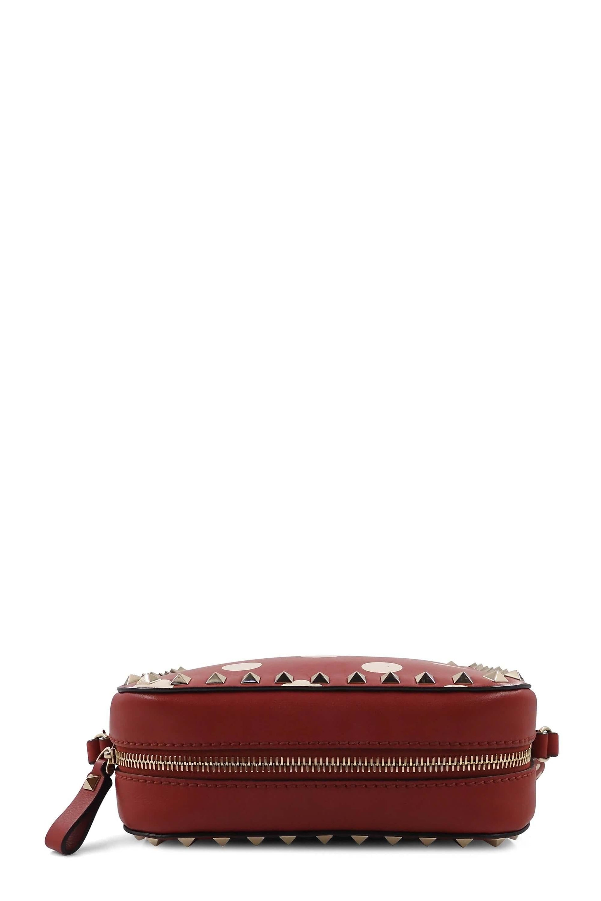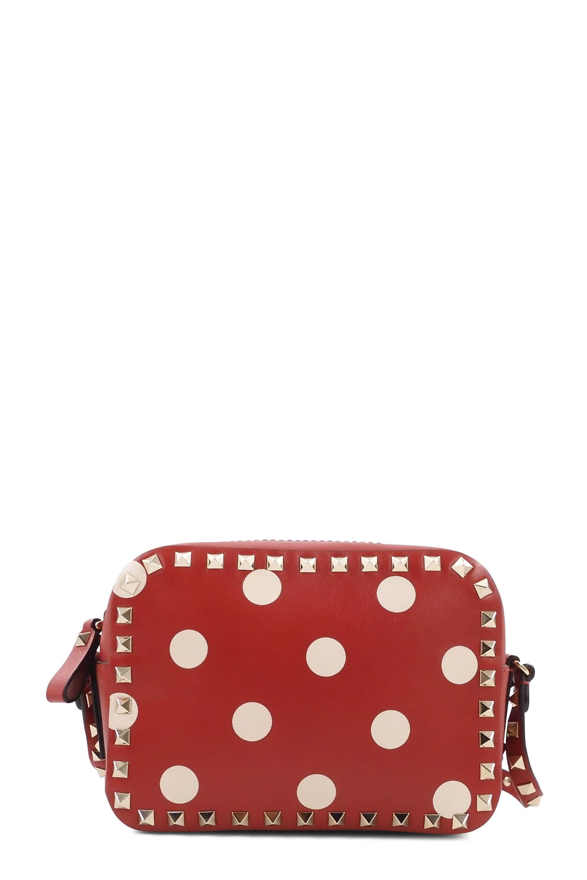 DELICATE Treat it gently and with extra care. Red leather Valentino Rockstud Camera crossbody bag with polka dot print throughout, gold-tone hardware, signature pyramid studs at throughout exterior, single flat adjustable shoulder strap, creme woven lining, single slip pocket at interior wall and zip closure at top. The size guide is approximate and may vary.