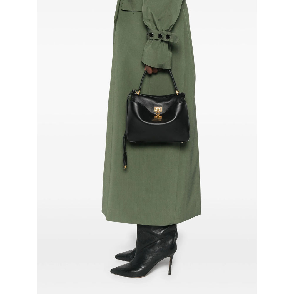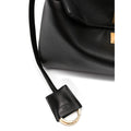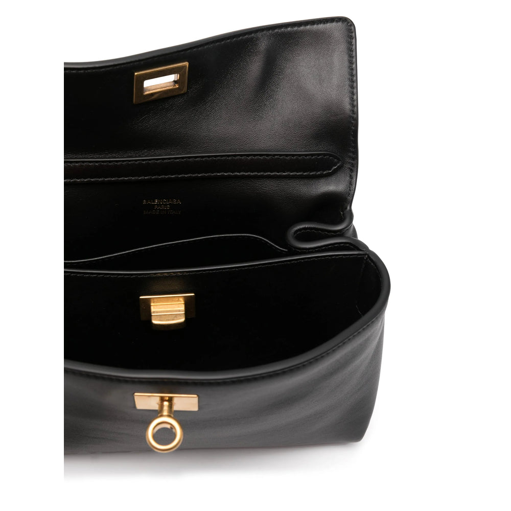 black calf leather smooth grain twist-lock fastening single flat top handle detachable shoulder strap foldover top engraved logo keyring attachment metal feet two rear flap pockets partitioned compartment internal logo stamp This piece comes complete with a protective dust bag.