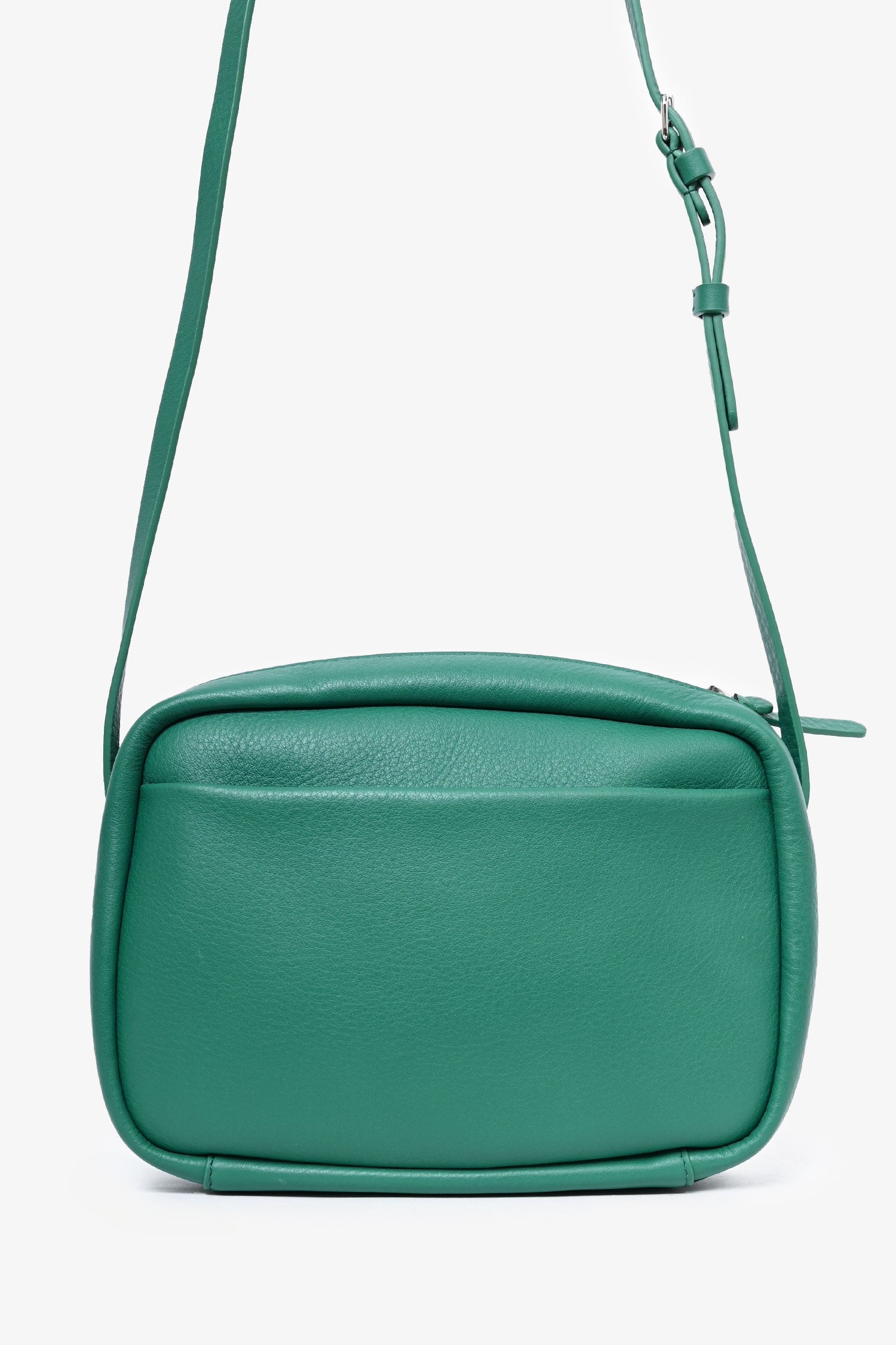 Balenciaga Green Leather 'Everyday' Crossbody Bag. Top zip closure. Black leather interior. Single interior wall slip pocket. Silver-tone hardware.
