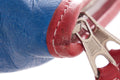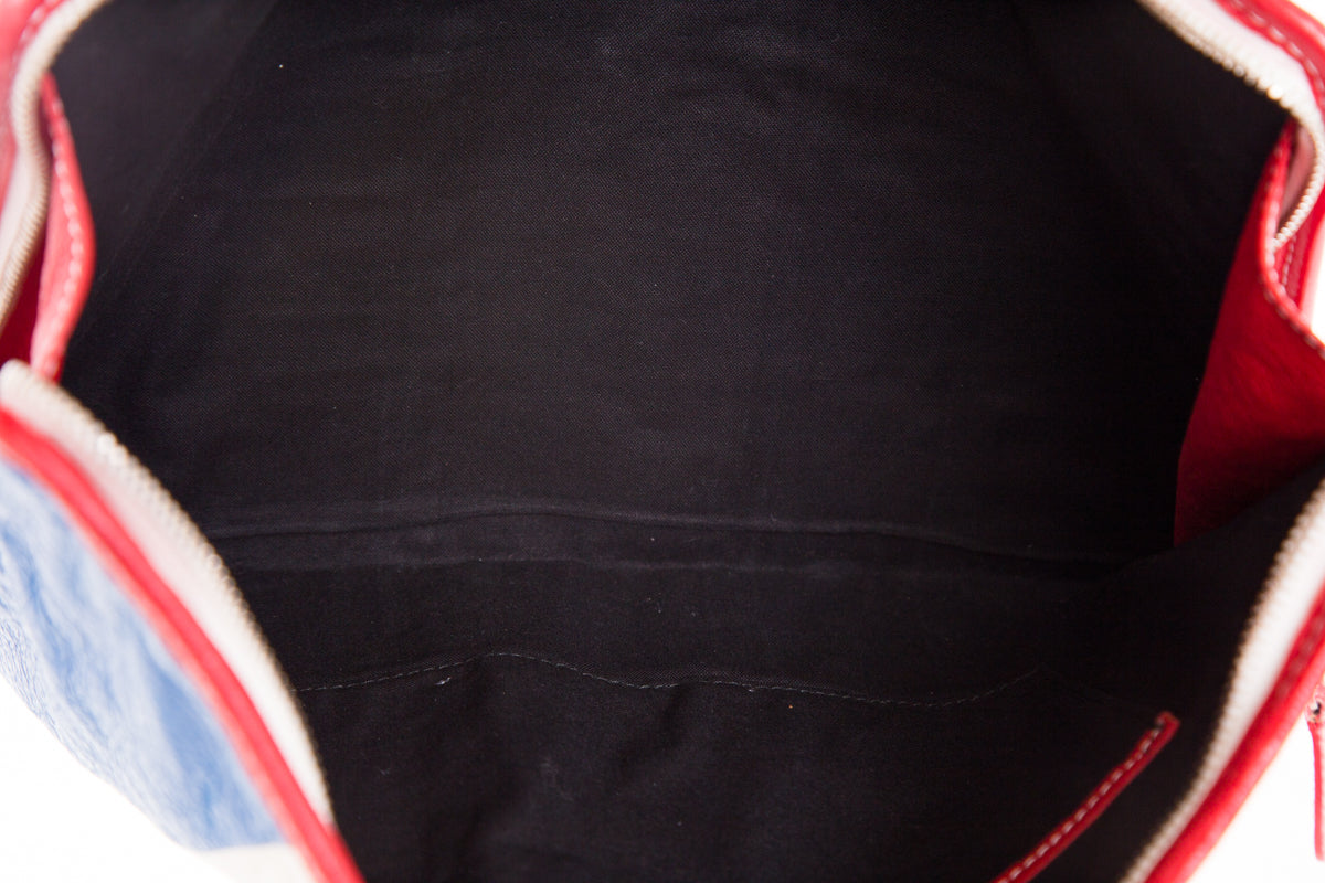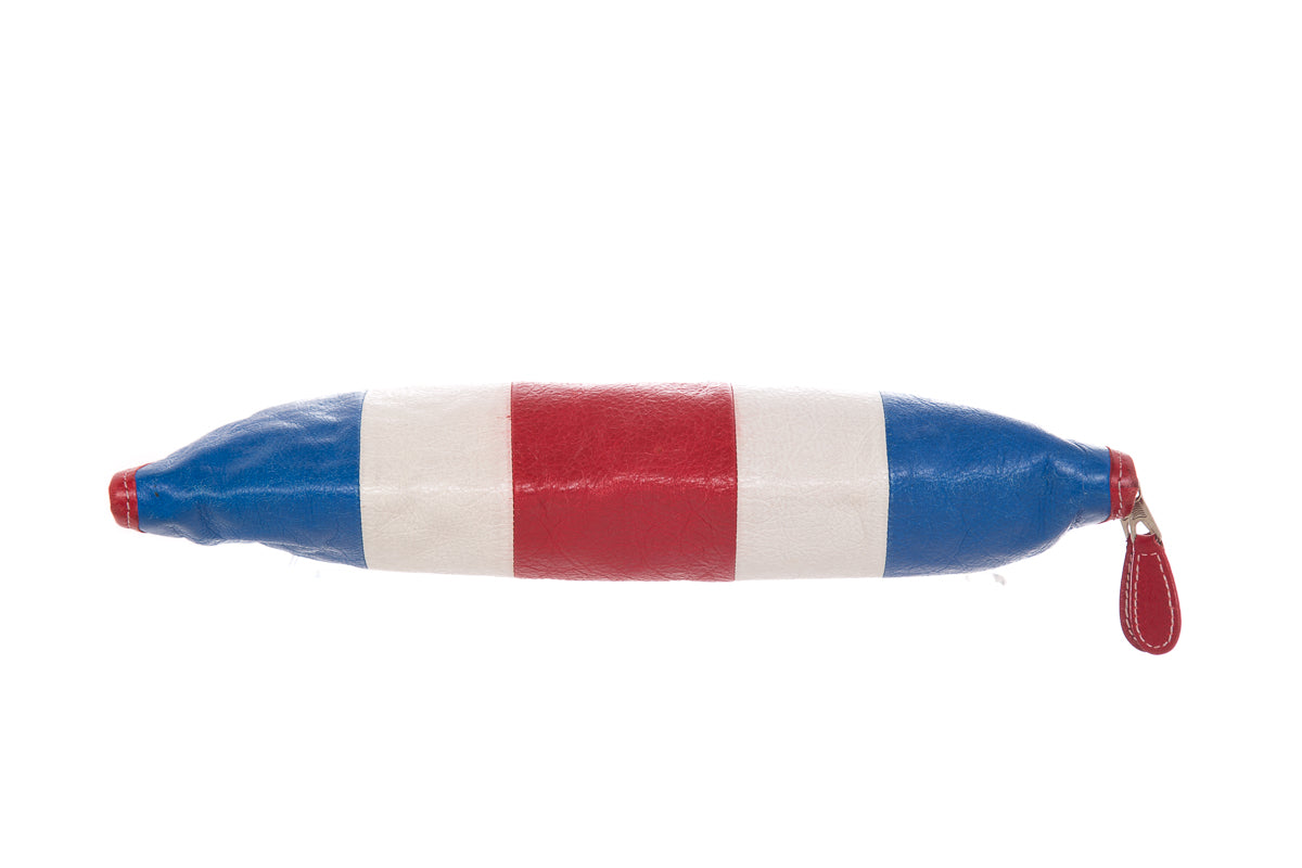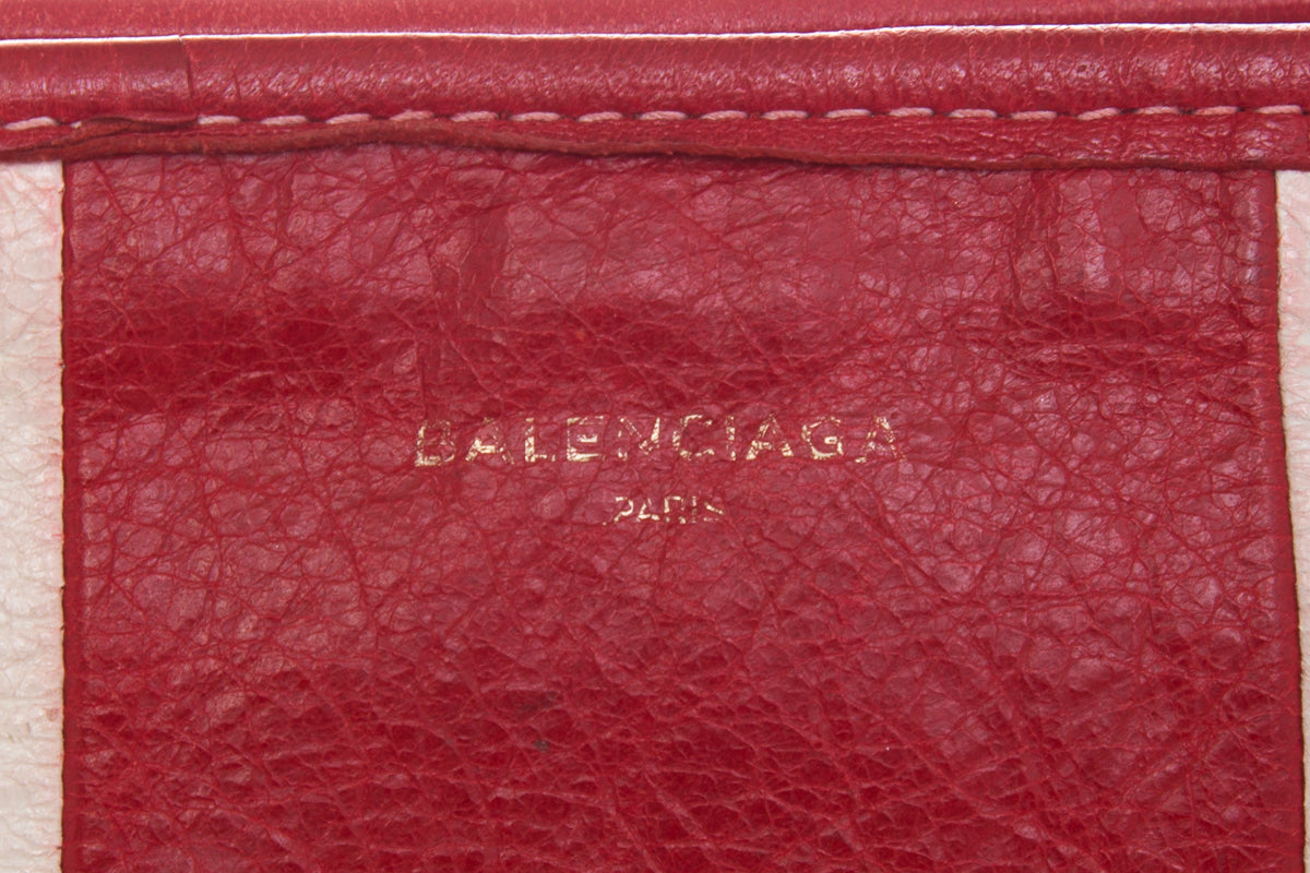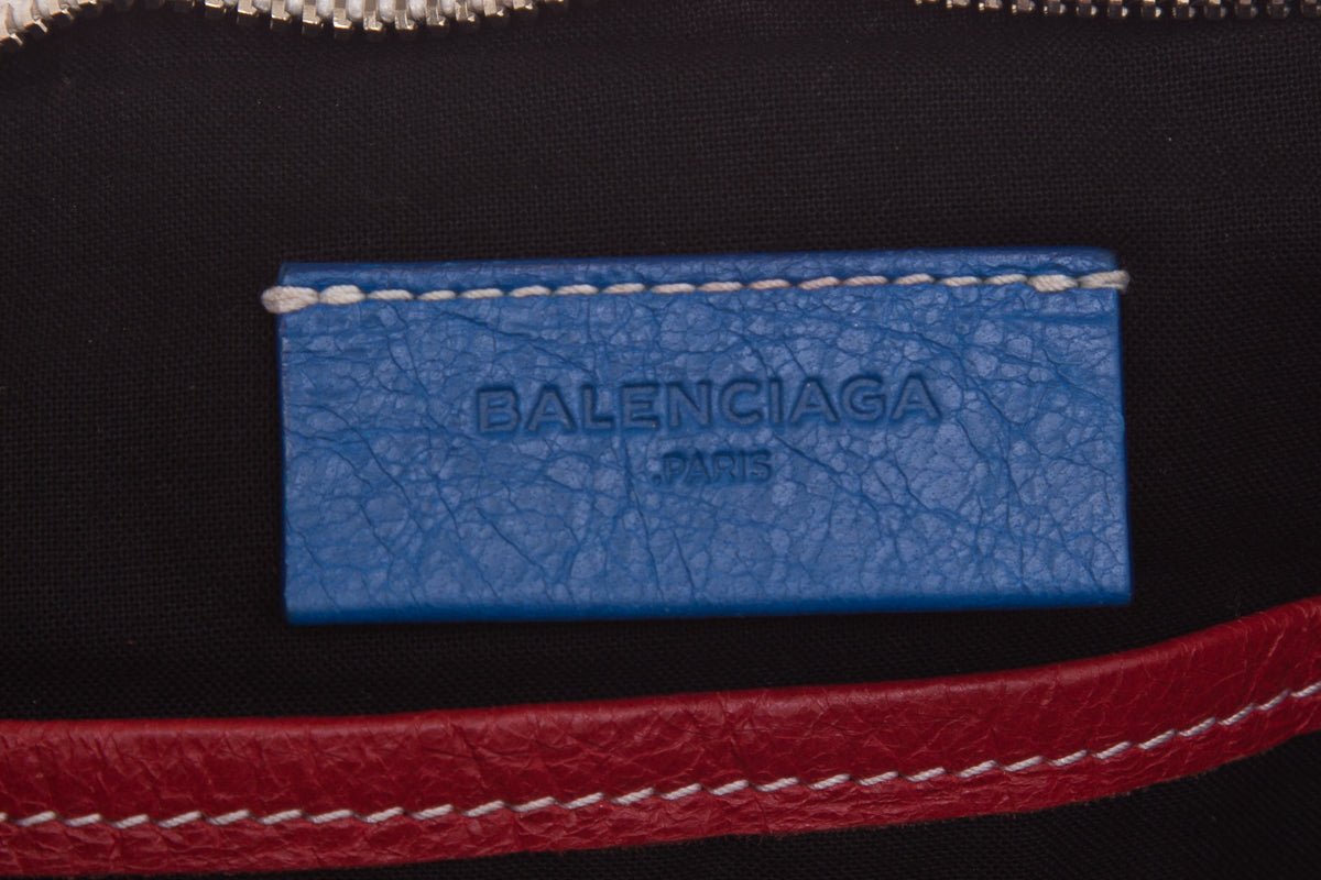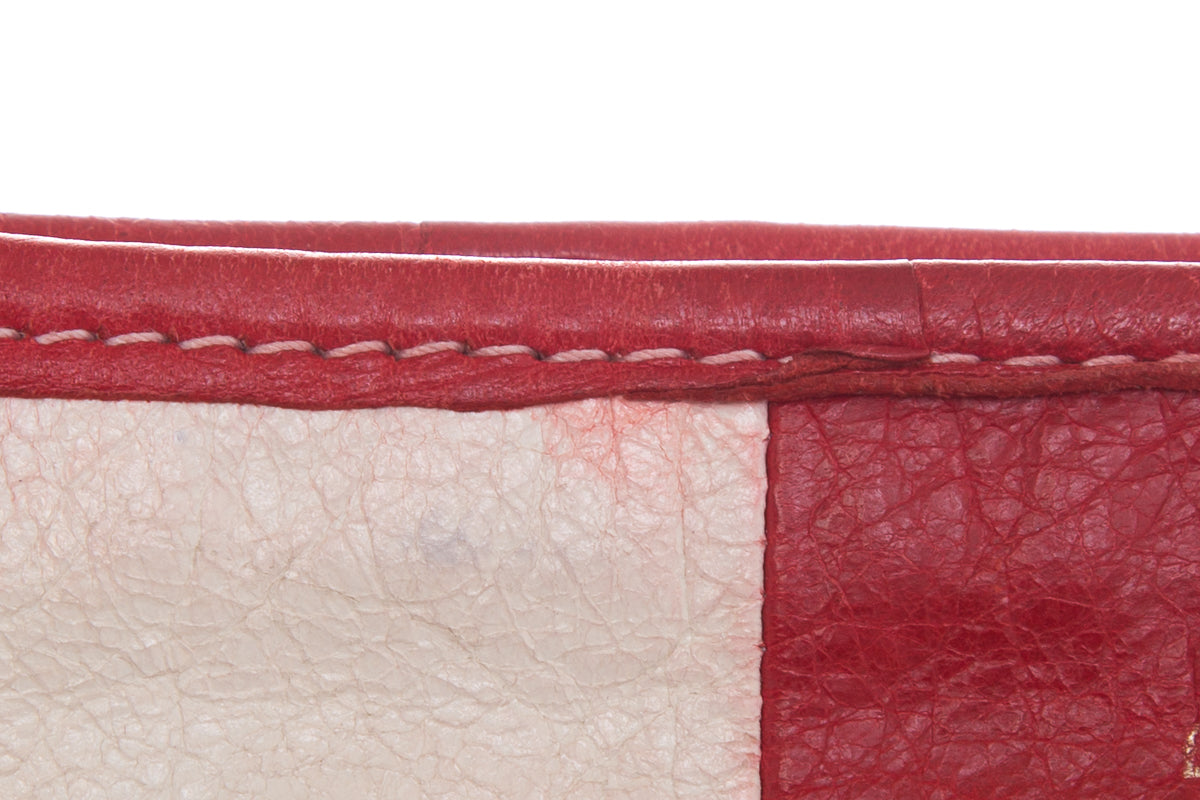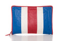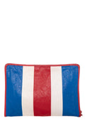 Balenciaga Red, White and Blue Leather Clutch with zip around closure. This item is in good condition; some wear on corners and fading to brand stamp.