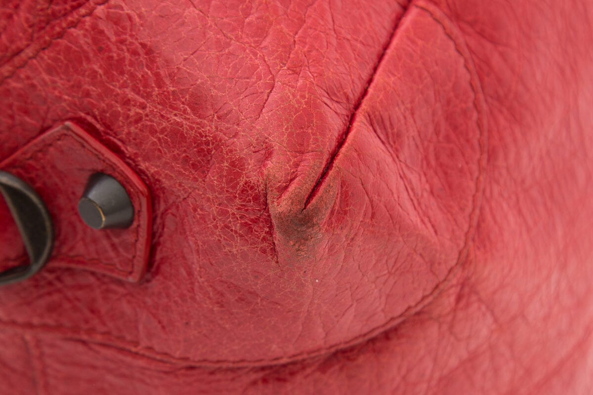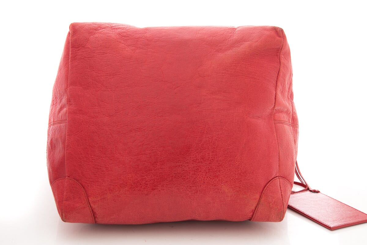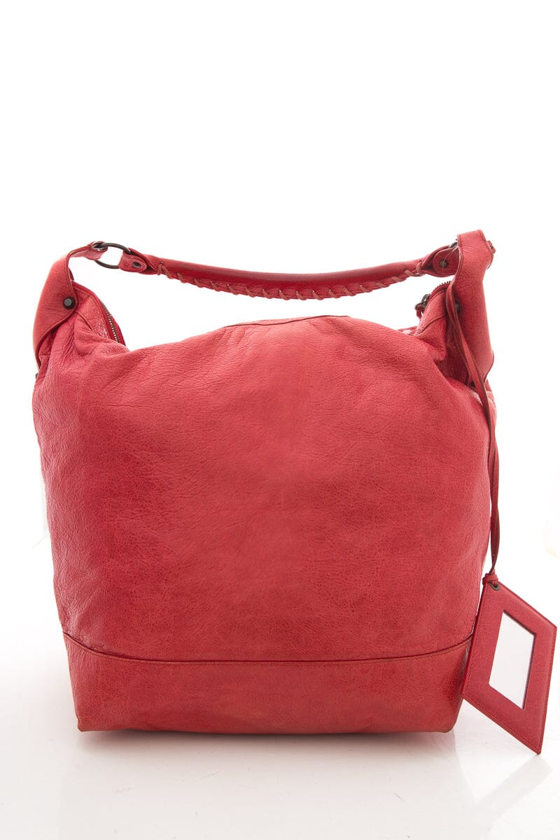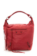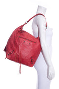 Balenciaga Red Day Leather Studs Hobo. This item is gently loved; some discoloring on leather and fraying on edges of handles.