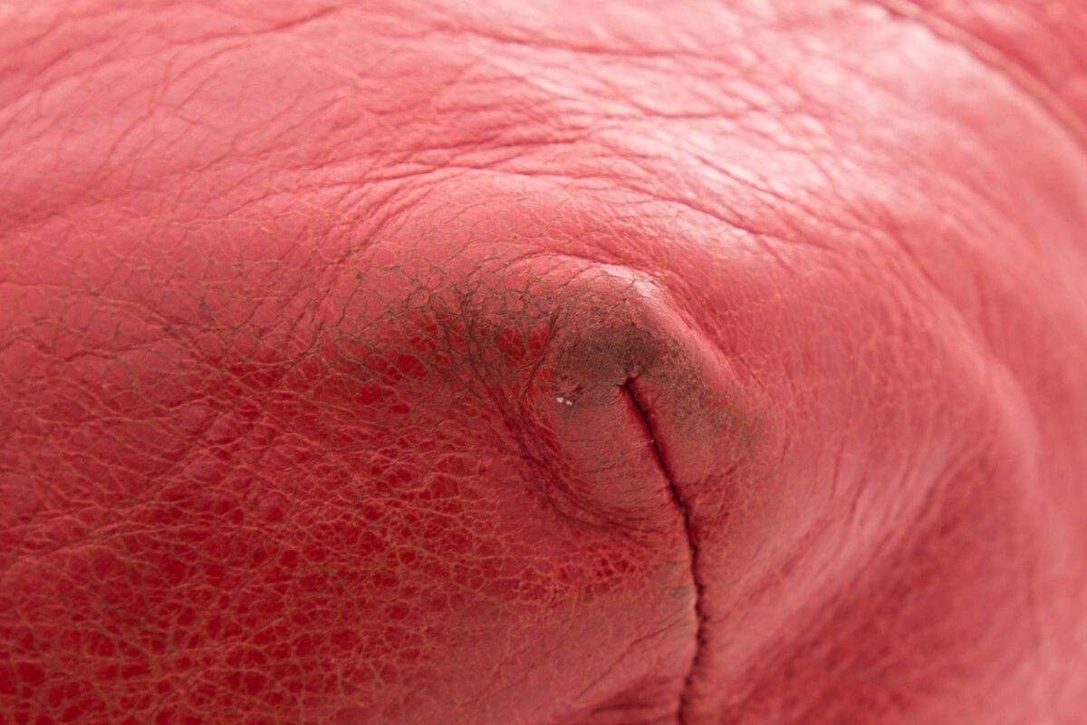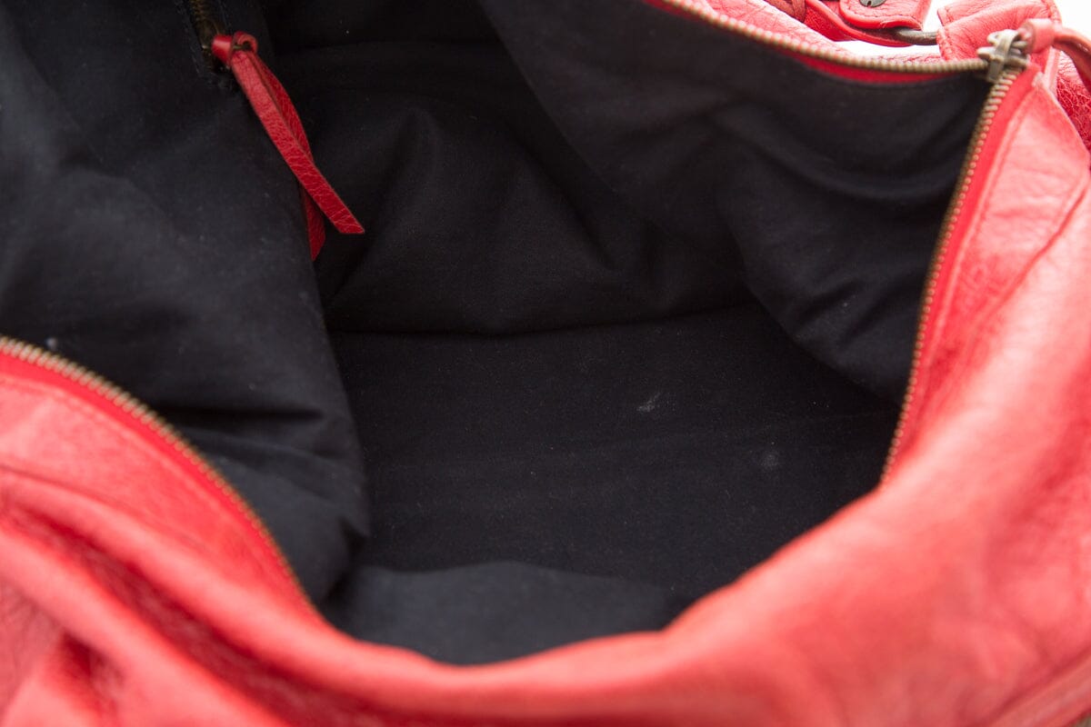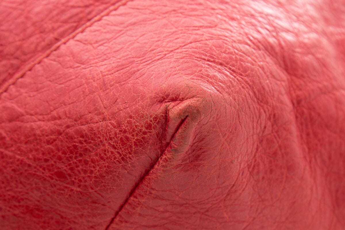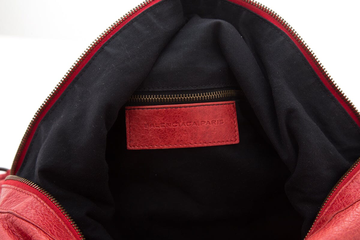 Balenciaga Red Day Leather Studs Hobo. This item is gently loved; some discoloring on leather and fraying on edges of handles.