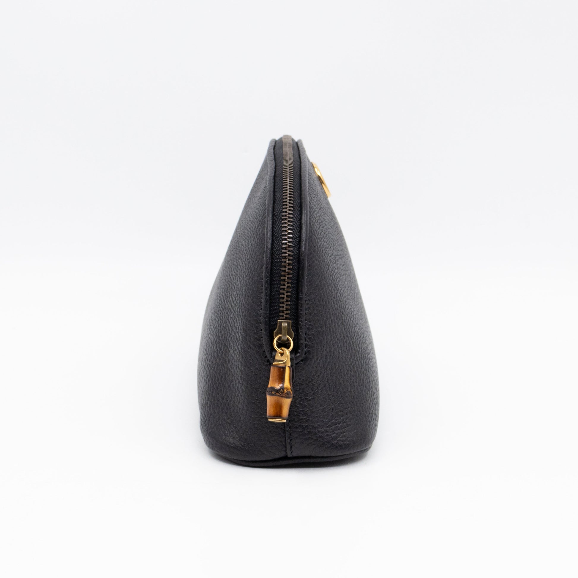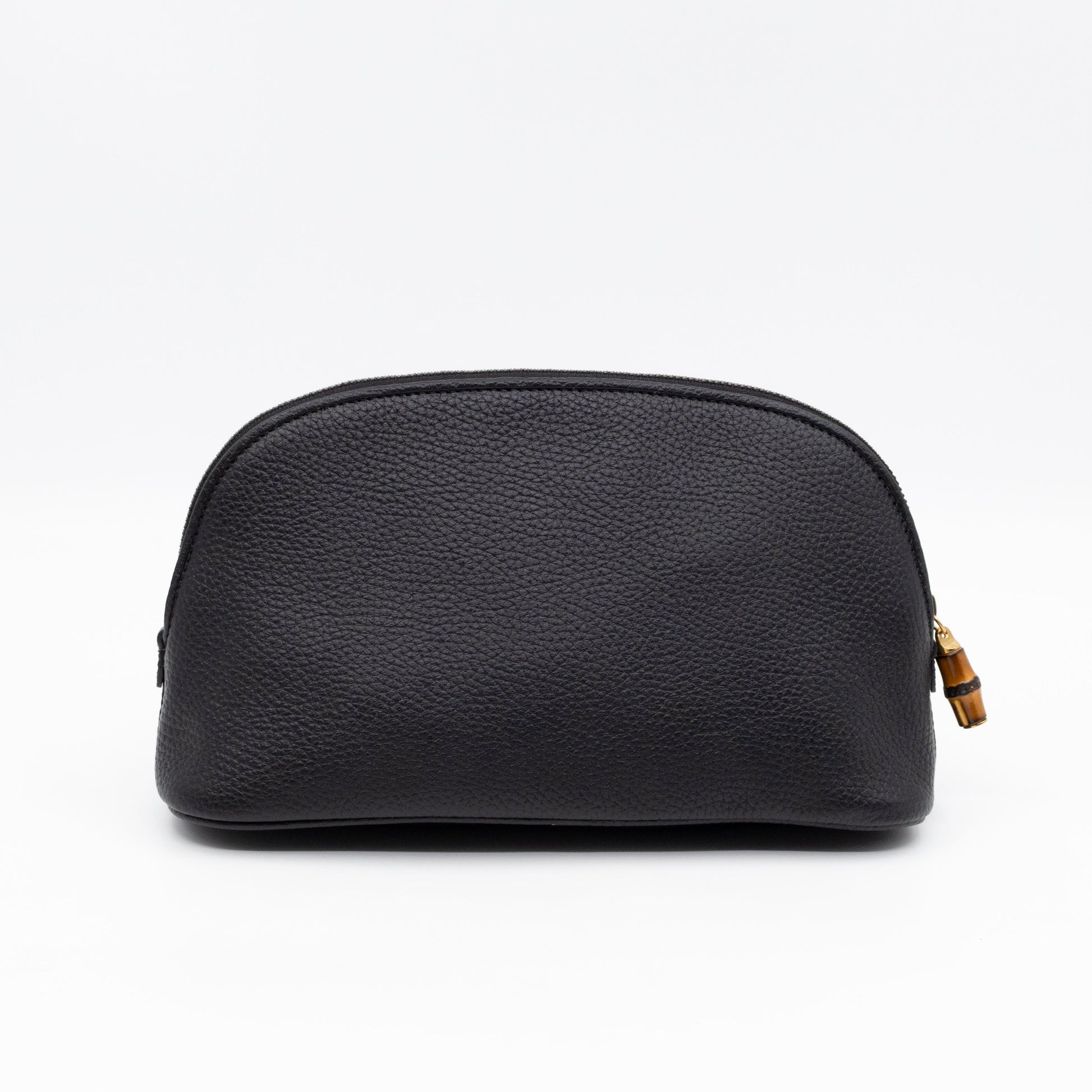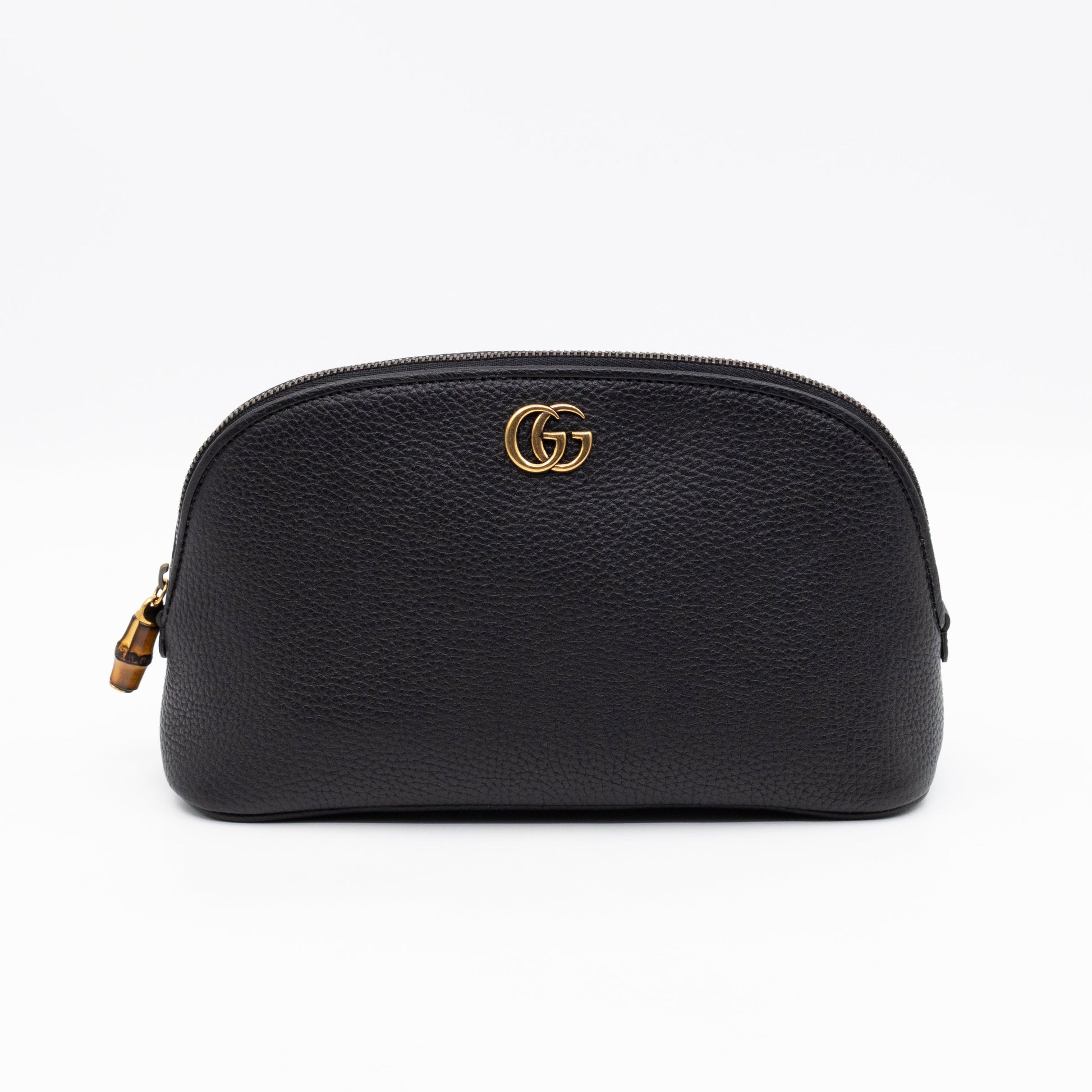 This is a Gucci Bamboo-Puller Double G beauty case. Made in black leather with gold-tone hardware. On the front has a GG gold-tone logo in front. On the top has a zip closure with bamboo puller to keep case close. Inside matching nylon interior.