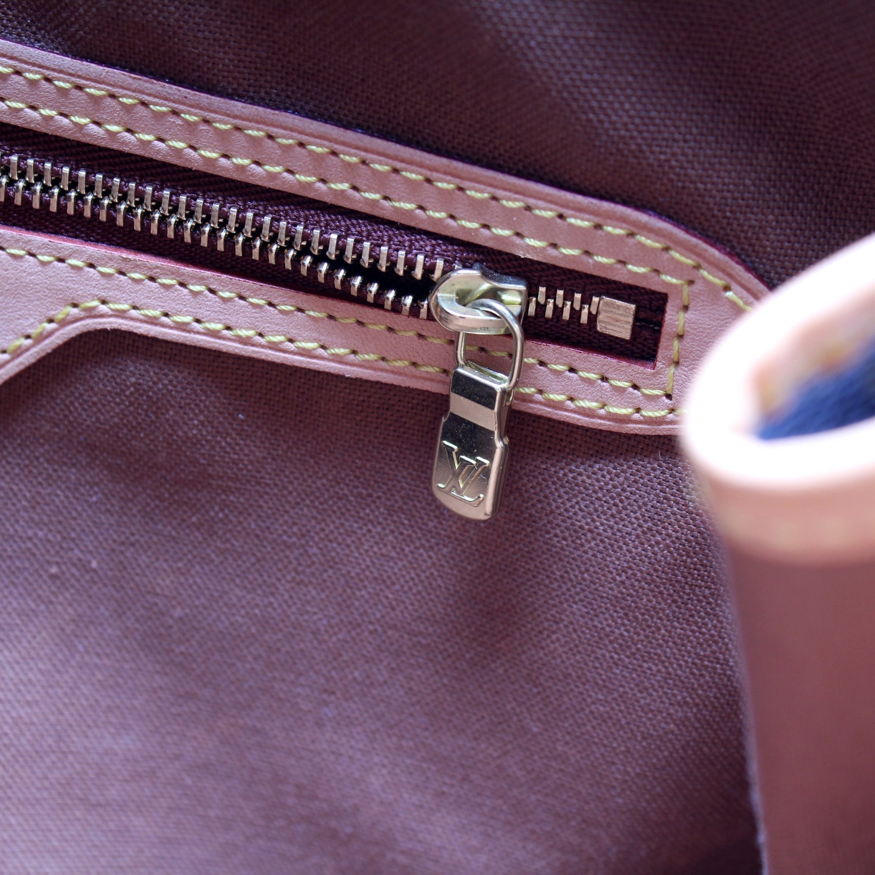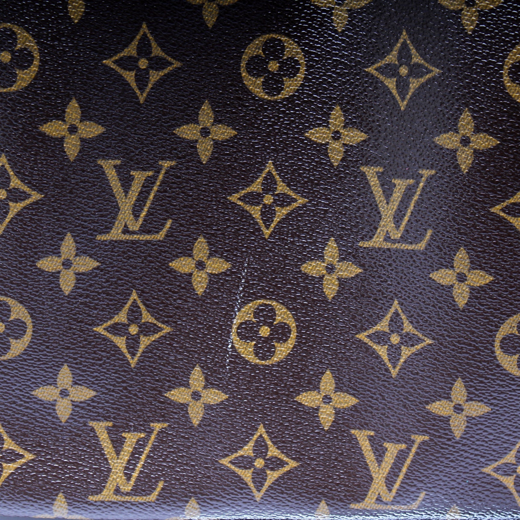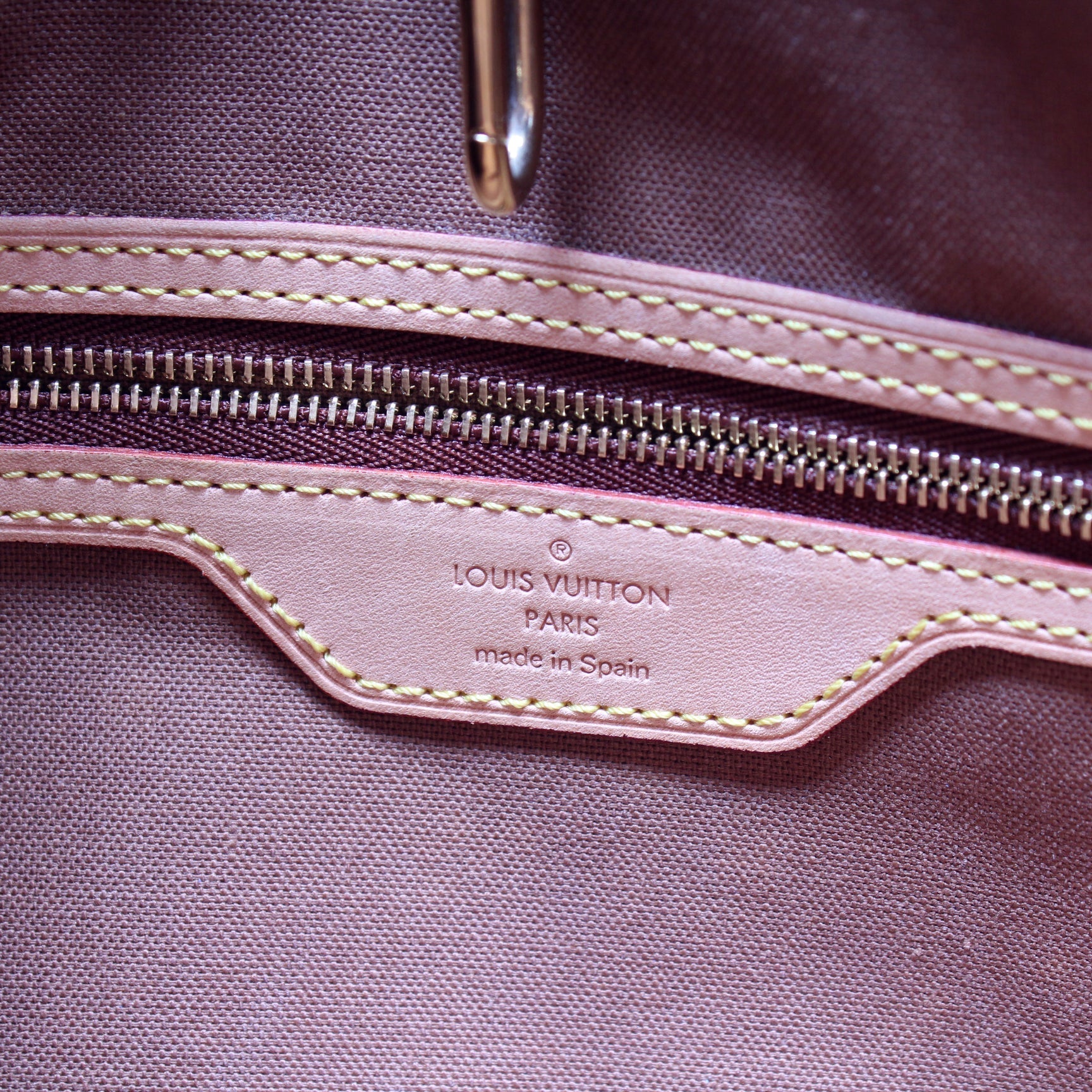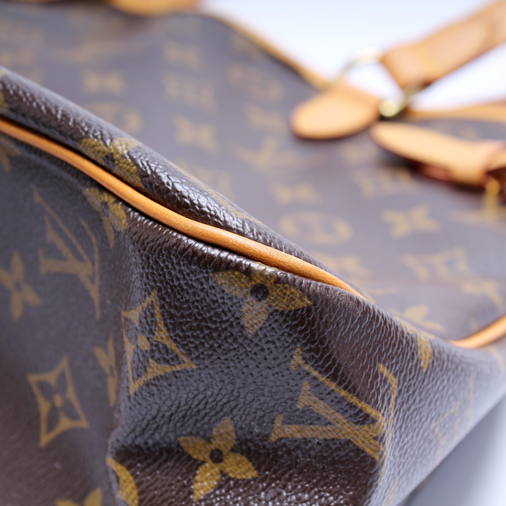 Exterior: The exterior coated canvas is free from any rips or cracks. The leather trim shows minor signs of wear and discoloration.
