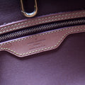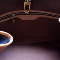 Exterior: The exterior coated canvas is free from any rips or cracks. The leather trim shows signs of wear and discoloration. The corners show minor wear.