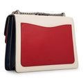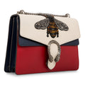 A true statement piece that every woman with an eccentric sense of style needs in her wardrobe. Carefully crafted from red, blue and white leather, this bag features Gucci's signature bee embellished on the front flap. Complimented with silver tone hardware and Gucci's classic Dionysus tiger plaque, this bag is sure to make all heads turn wherever you go. Given its bright colour palette and unique detailing, this bag is best suited with a monochrome or neutral-toned outfit to further accentuate it. Wear this Dionysus with a pair of simple black trousers and a silk blouse for a dressier look or dress it down with a pair of white jeans and a basic top for a more casual look. Wherever you go and regardless of what you wear this piece with, you'll be sure to have all eyes on you.