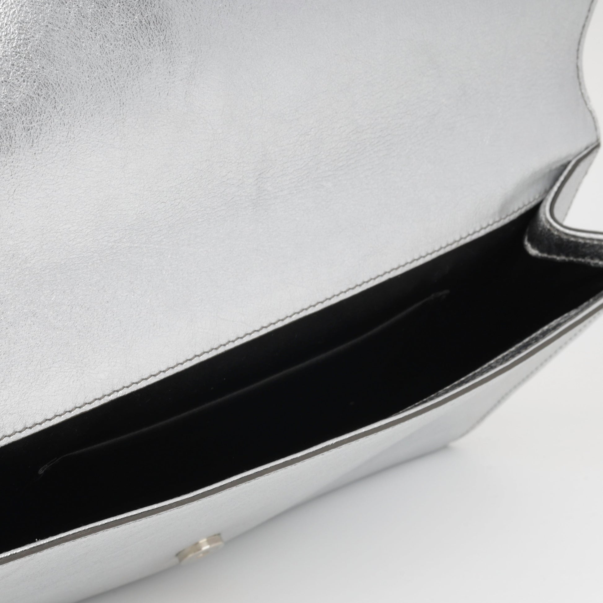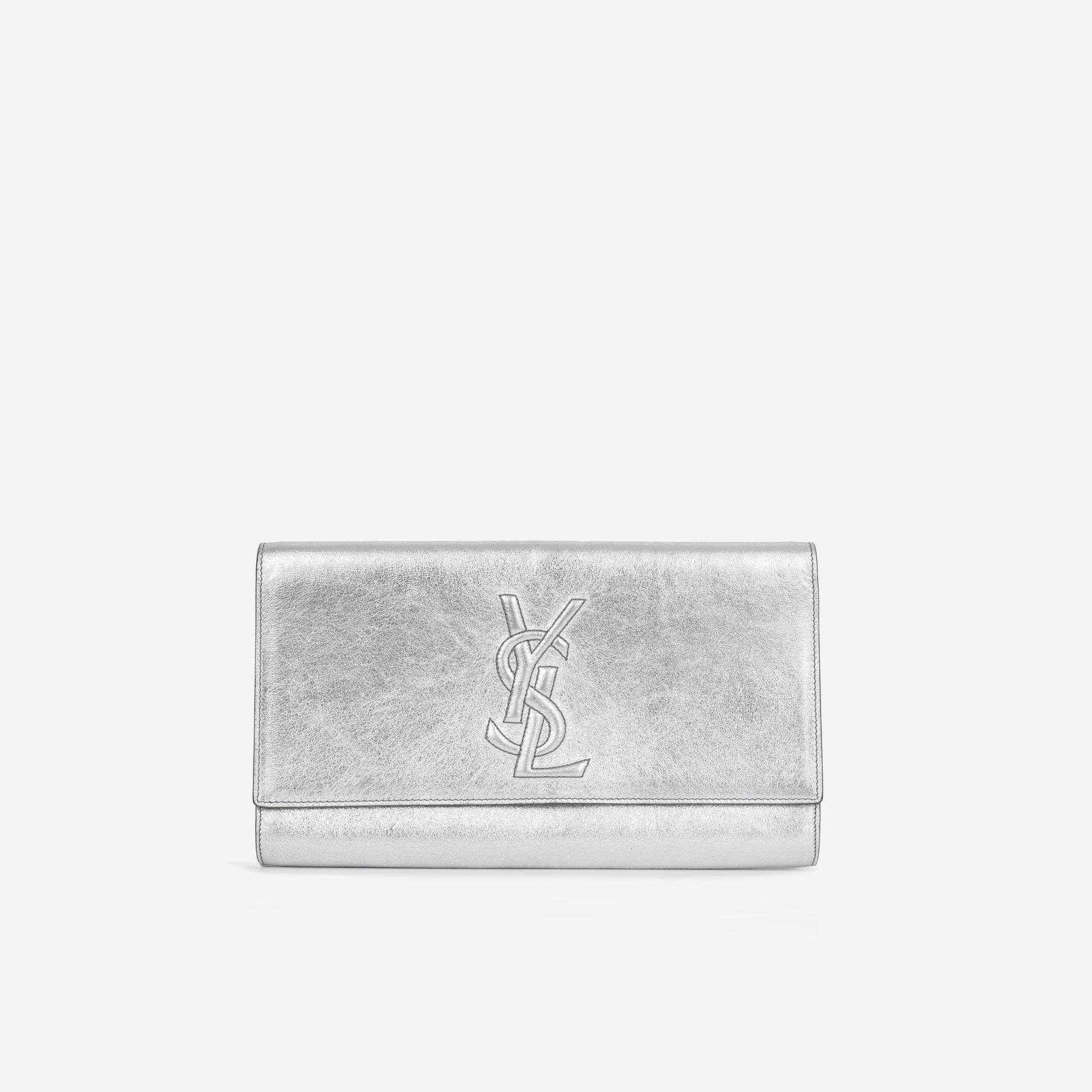 Introducing the Belle De Jour Wallet Clutch, Saint Laurent, crafted from silver crumpled calfskin leather. This elegant accessory combines sophistication with practicality, featuring a compact design perfect for carrying essentials. With its timeless appeal and iconic YSL logo, the Belle De Jour adds a touch of glamour to any ensemble, making it a must-have for fashion-forward individuals.