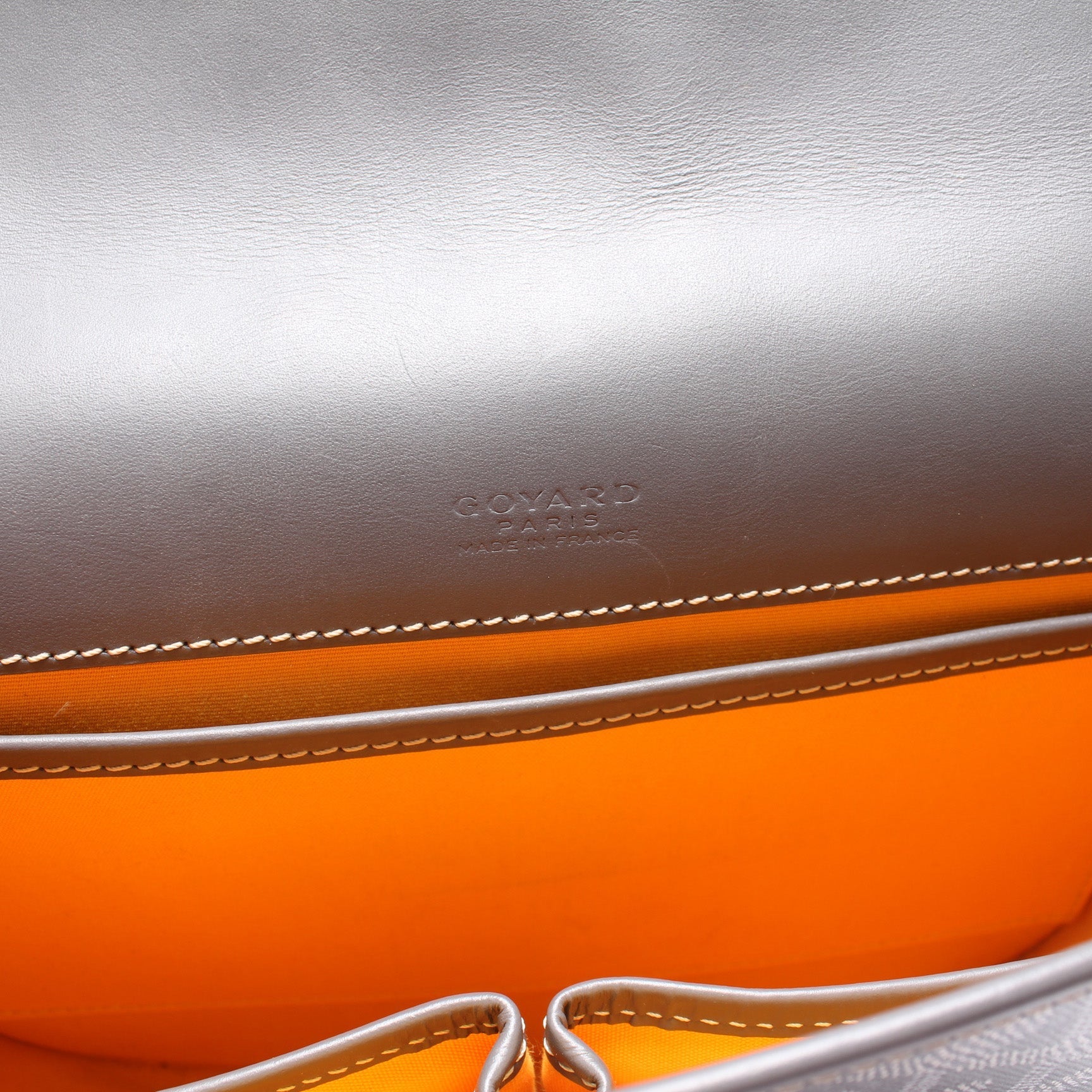 Interior: The interior shows light staining. The interior features three open pockets.