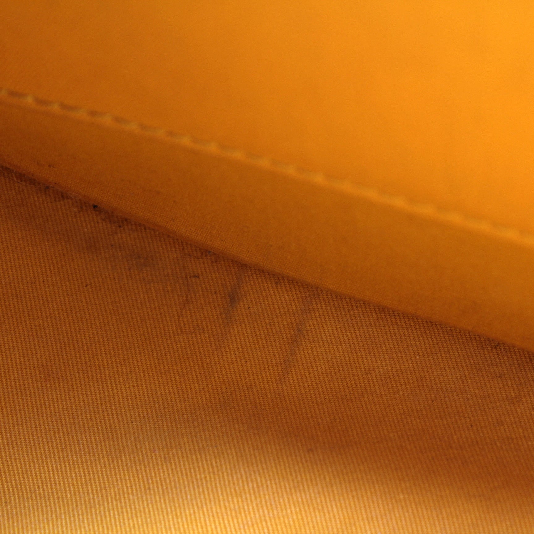 Exterior: The exterior coated canvas is free of any rips or cracks. The leather trim shows light wear throughout. The exterior features one open pocket.
