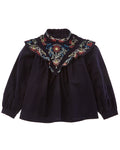 - Embroidered Top In Navy With Stand Collar, Embroidered Detailing, Ruffle Trim And Button Cuffs