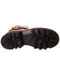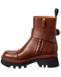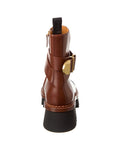 - Owena Leather Bootie In Brown Leather And Gold-Tone Hardware With Buckle Accent And Pull-On Tab