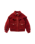 - Wool-Blend Jacket In Red With Spread Collar, Ruffle Detailing And Four Front Pockets