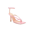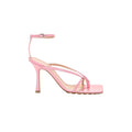 The Bottega Veneta Stretch Heeled Sandal is crafted from supple pink lambskin and features a sleek stiletto heel. This sandal combines vibrant color with a sophisticated design, reflecting the brand's dedication to luxury and contemporary style.
