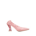 The Bottega Veneta Glitter Heel Almond Pump is crafted from soft pink lambskin and features a distinctive flared heel with glitter detailing. This pump combines an elegant color with a touch of sparkle and a refined almond toe, showcasing the brand's dedication to luxurious materials and modern design.