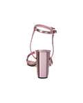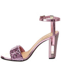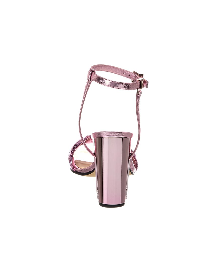 - Delfina Sequin & Leather Sandal In Pink Sequins And Leather And Gold-Tone Hardware With Cutout Heel