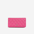 A sleek and sophisticated travel essential. Crafted from luxurious quilted pink lambskin leather in a striking pink hue, this compact holder combines elegance with practicality. Its bifold design offers convenient storage for cards, notes, and coins , while the sumptuously smooth interior ensures protection and style in equal measure.
