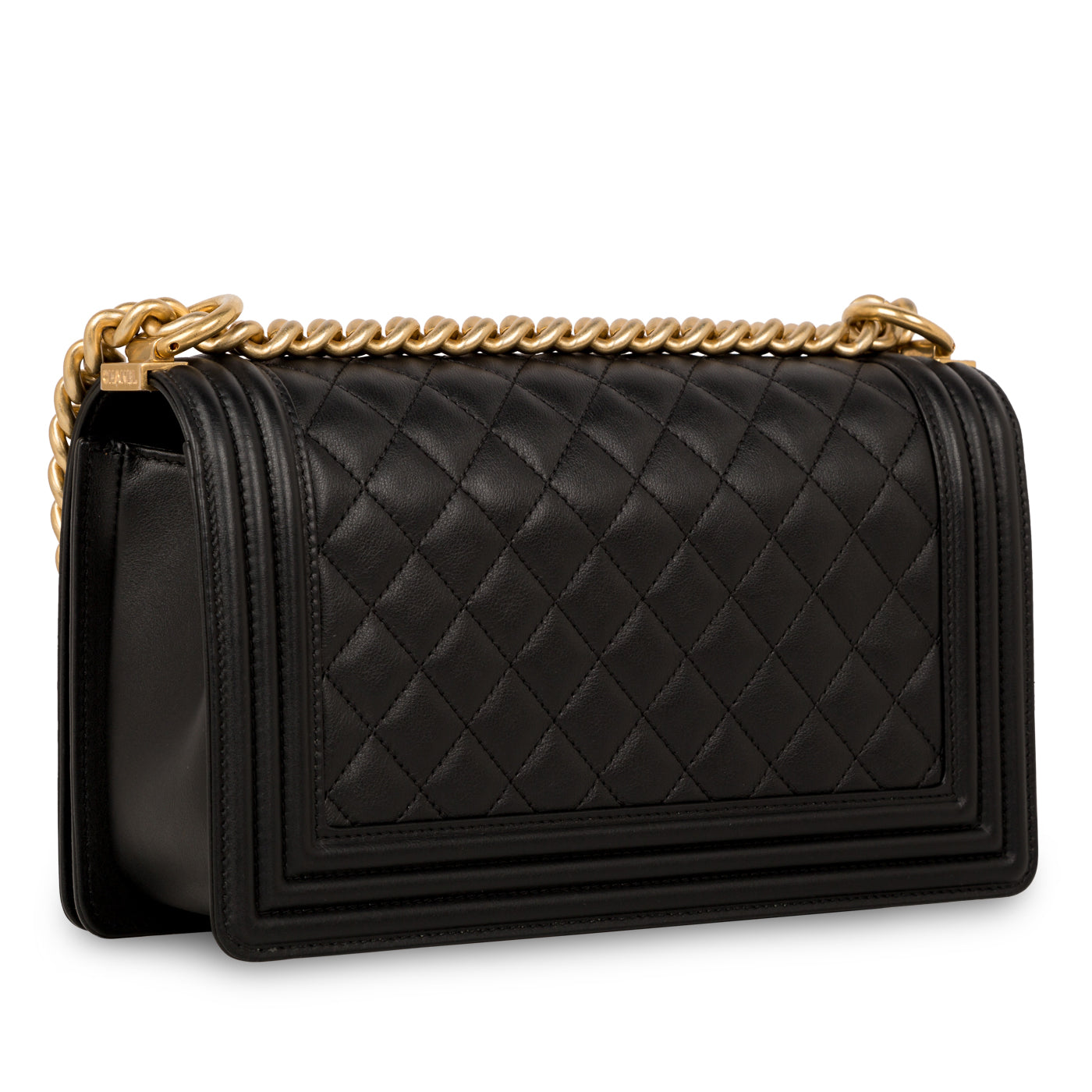 Chanel presents one of its highly-acclaimed and most sought after bags, the Chanel Boy Bag in size Old Medium in the wonderful and limited combination of Deep Navy Lambskin Leather and Antique Gold Hardware. As designed by Karl Lagerfeld, the Boy Bag collection was established to embody boyish charm and femininity.