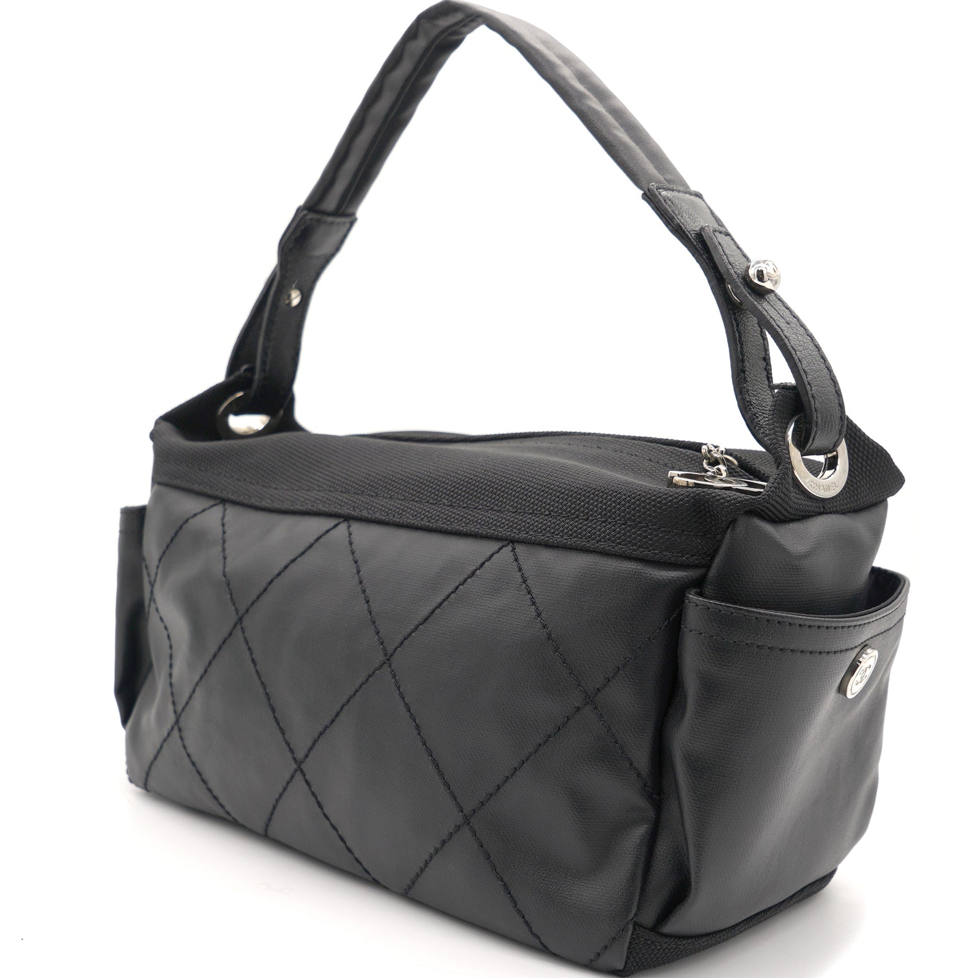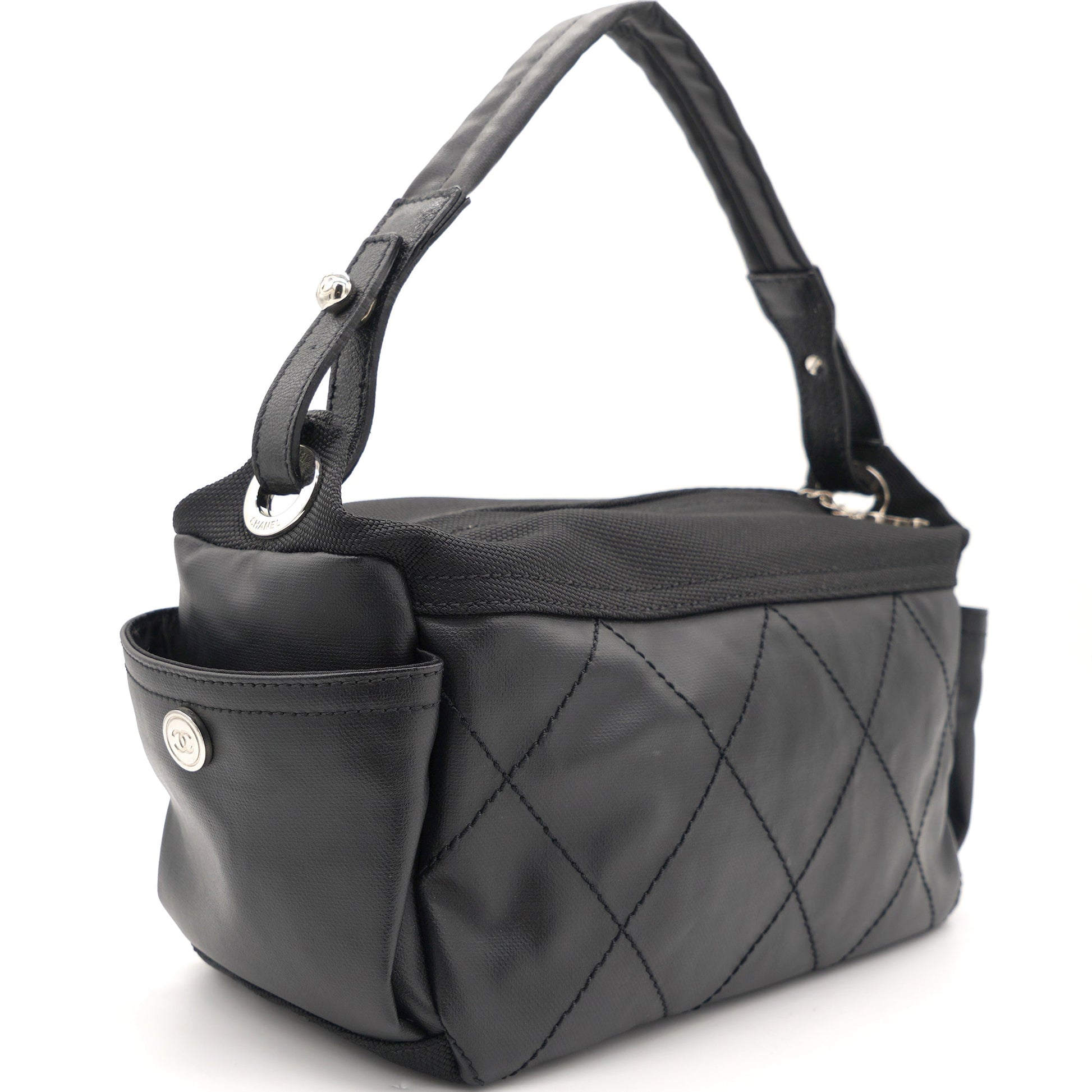 | Chanel's Paris Biarritz Hobo is designed in a black-coated canvas body detailed with quilting. It comes with a top zipper, side pockets for easy access and a top shoulder strap. The spacious interior can hold all your essentials with great ease. It makes a perfect weekend or evening-outing bag. | Material: Leather; Canvas Lining: Textile Hardware: Silver-color Finish Metal Accessories: Card; Dust Bag; Receipt Serial Number: 11314114 Material: 2006 | ![]() |