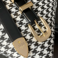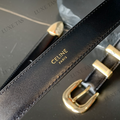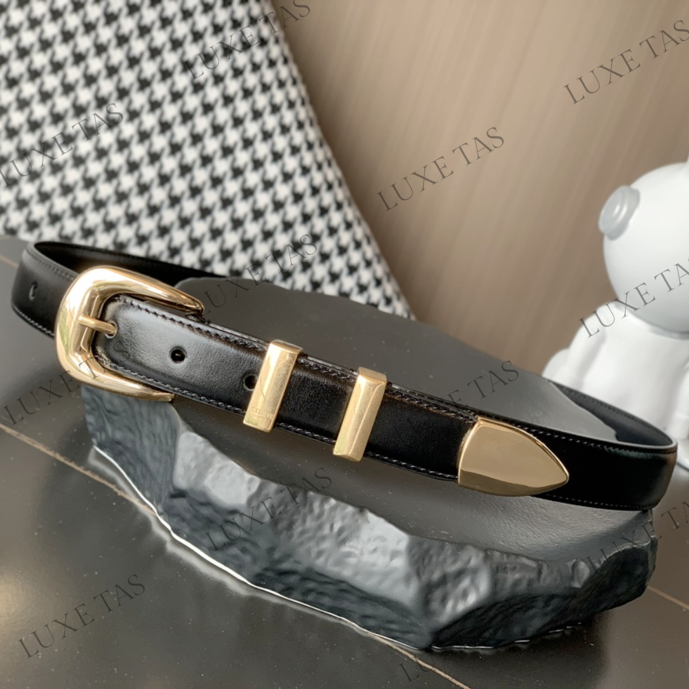 Presenting the stunning Taurillon Middle-Waist Belt featuring a captivating gold finishing. This belt exudes a touch of Western charm with its distinctive Western buckle, complemented by two metal loops and a metal tip. The Celine Paris logo is elegantly engraved on the bottom of the first loop, adding a subtle yet stylish detail. Crafted with precision and finesse, this belt is a must-have accessory to elevate any ensemble. Experience the timeless appeal of C.eline with this remarkable piece.