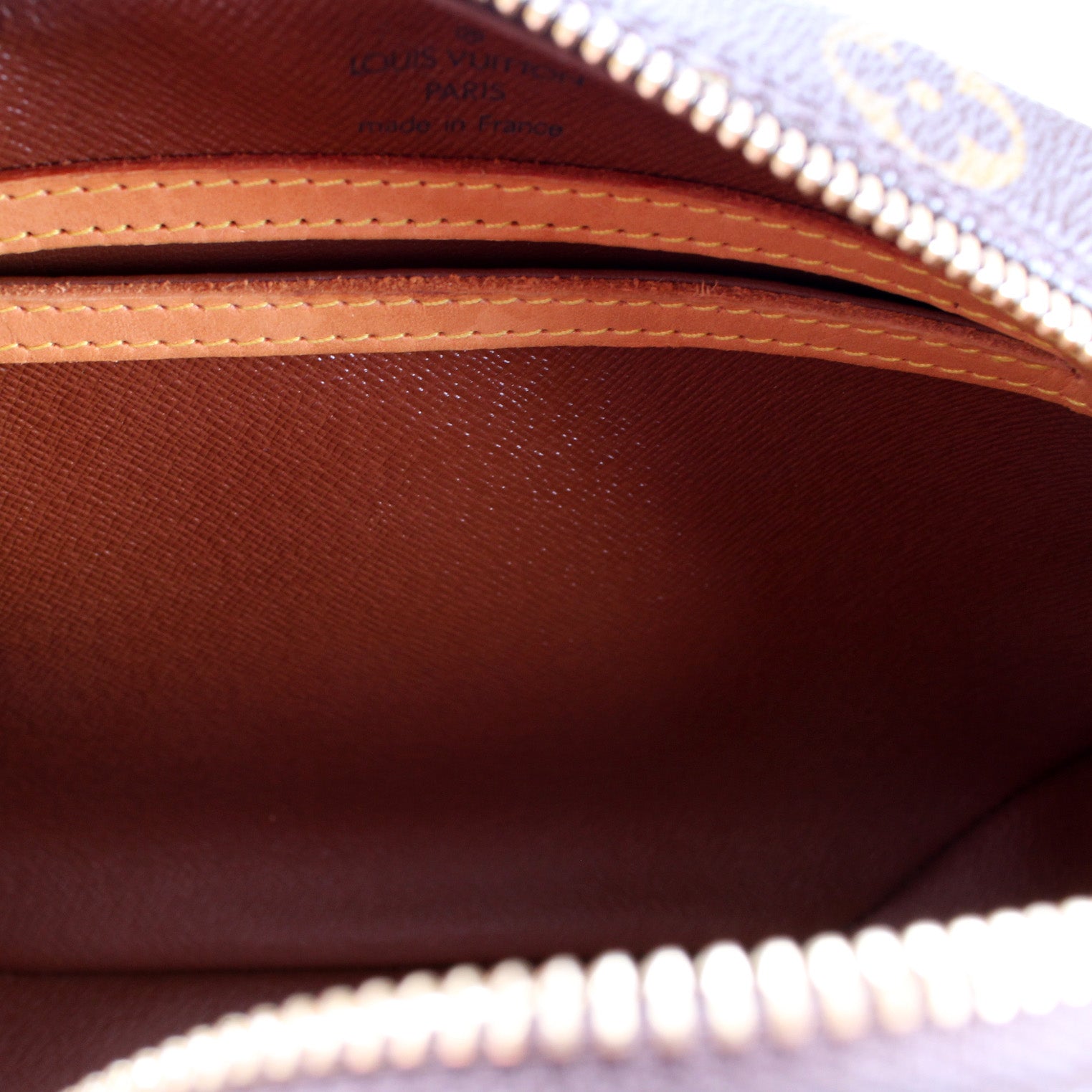 Exterior: The exterior coated canvas is free of any rips or cracks. The corners and leather details show wear and discoloration. The exterior features one open pocket.