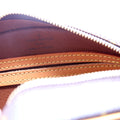Exterior: The exterior coated canvas is free of any rips or cracks. The exterior features one open pocket. The leather trim shows minor discoloration and wear.