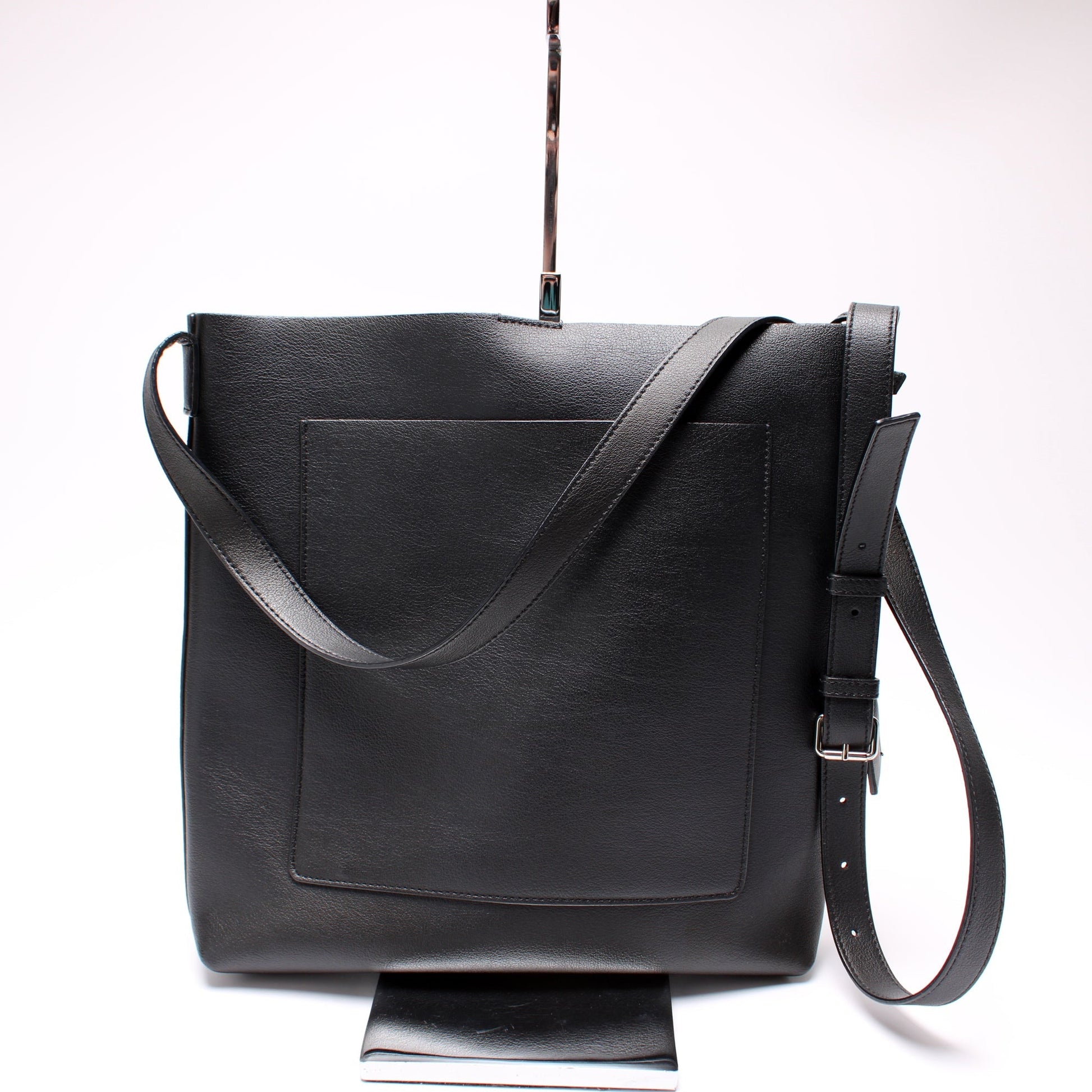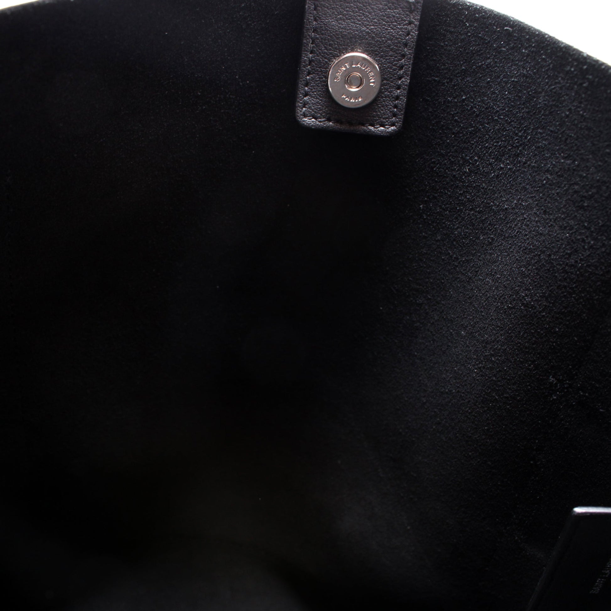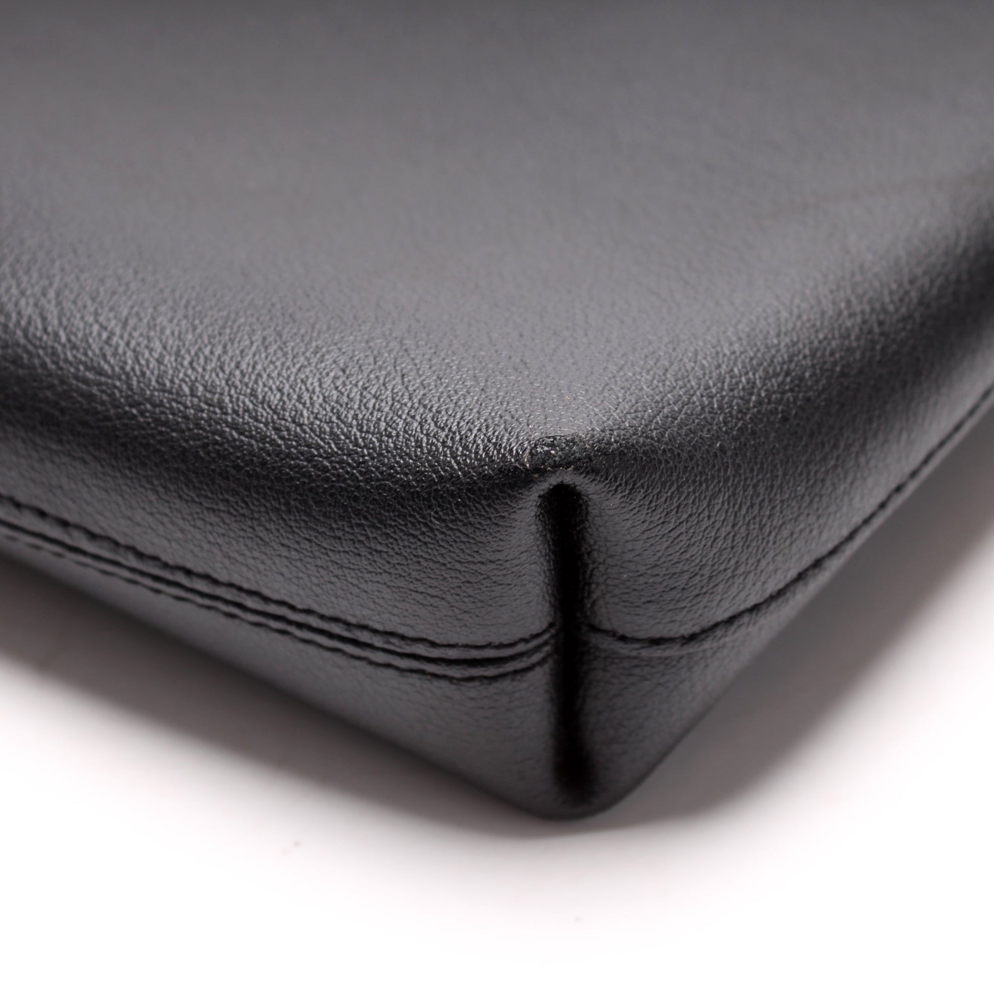 Exterior: The exterior leather is free from wear. The exterior features one open pocket. The glazing shows minor wear along the opening of the bag.