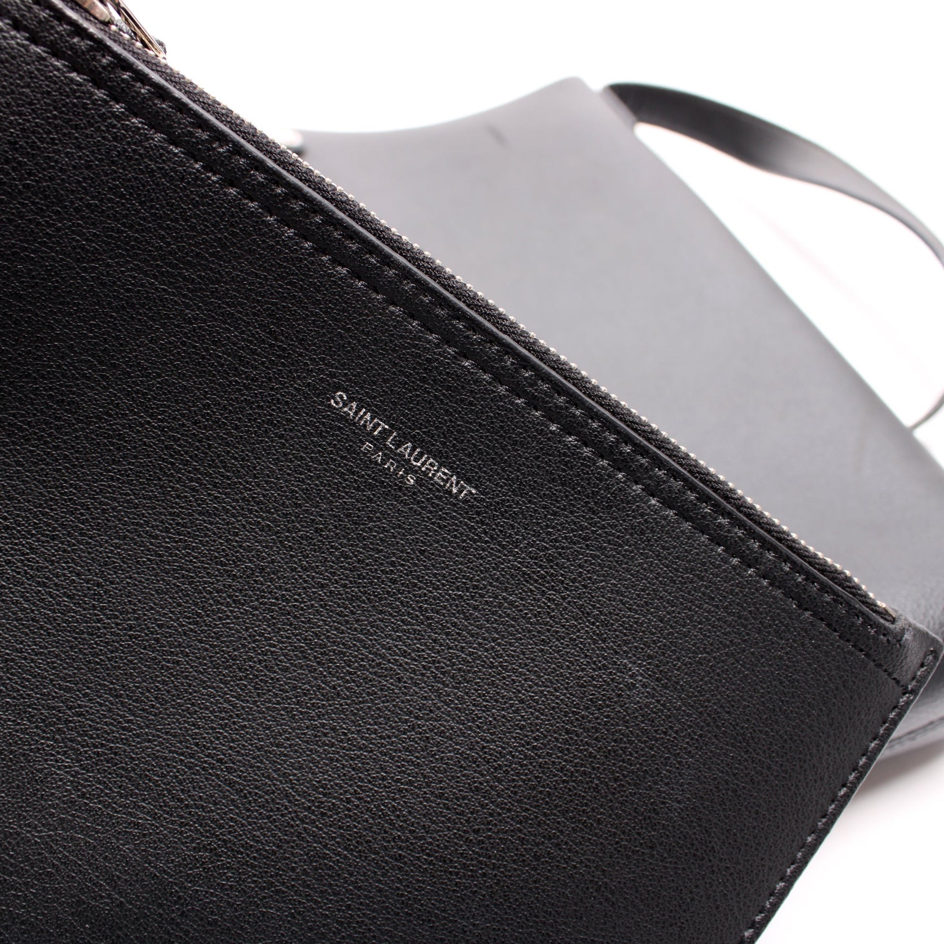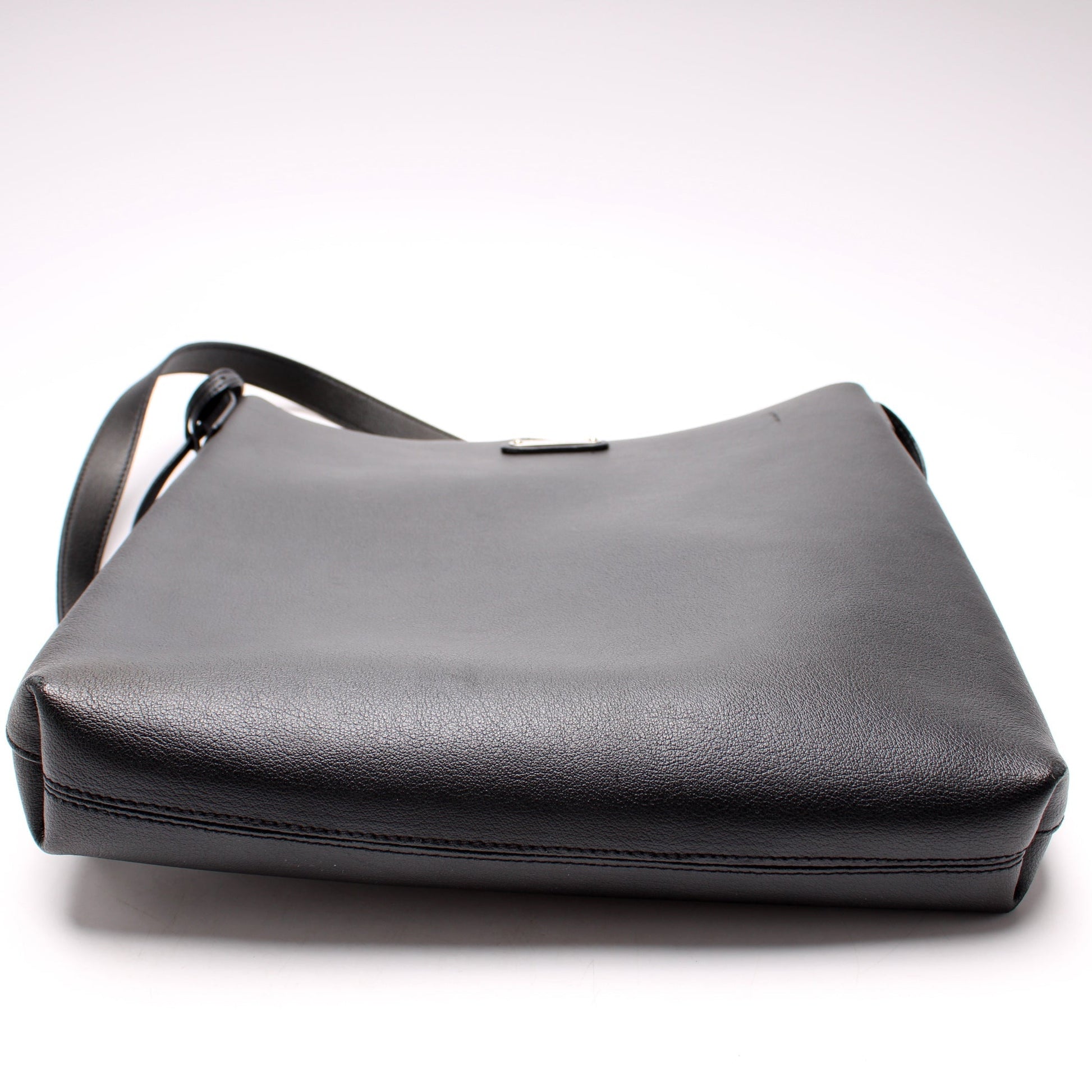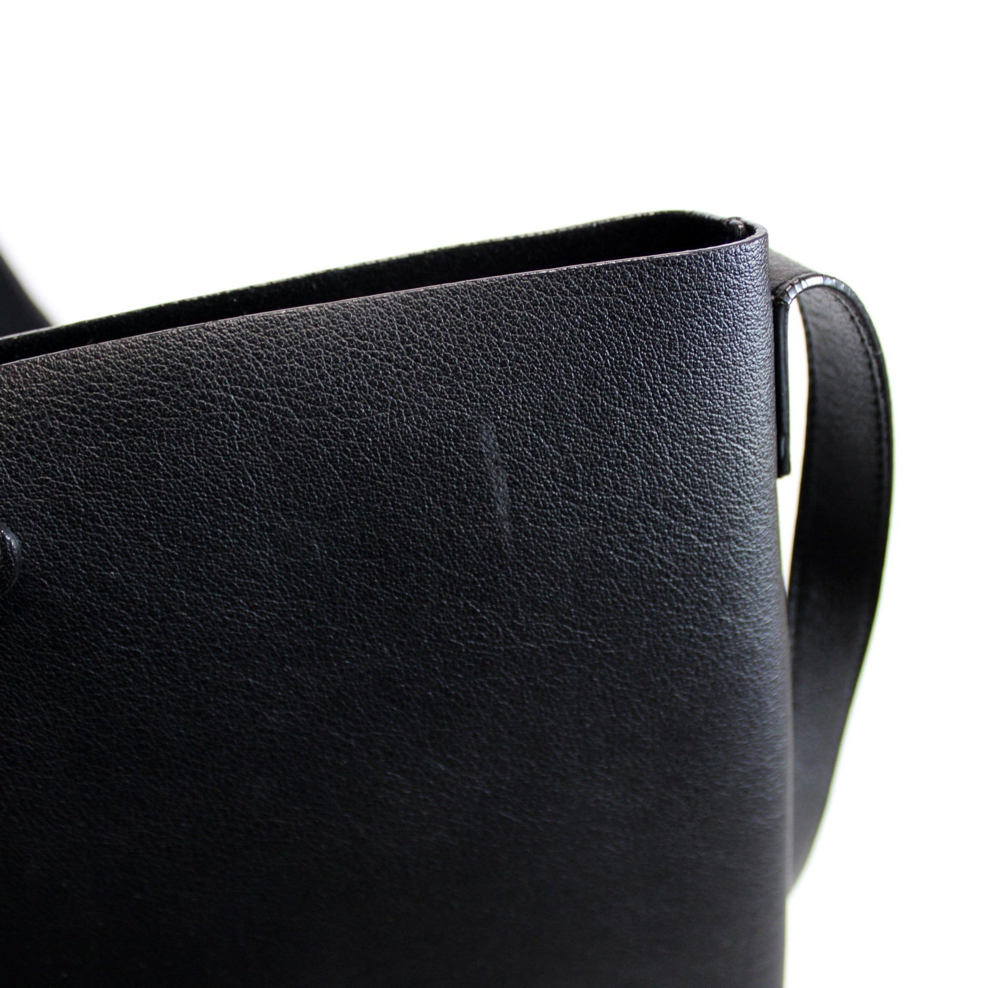 Exterior: The exterior leather is free from wear. The exterior features one open pocket. The glazing shows minor wear along the opening of the bag.