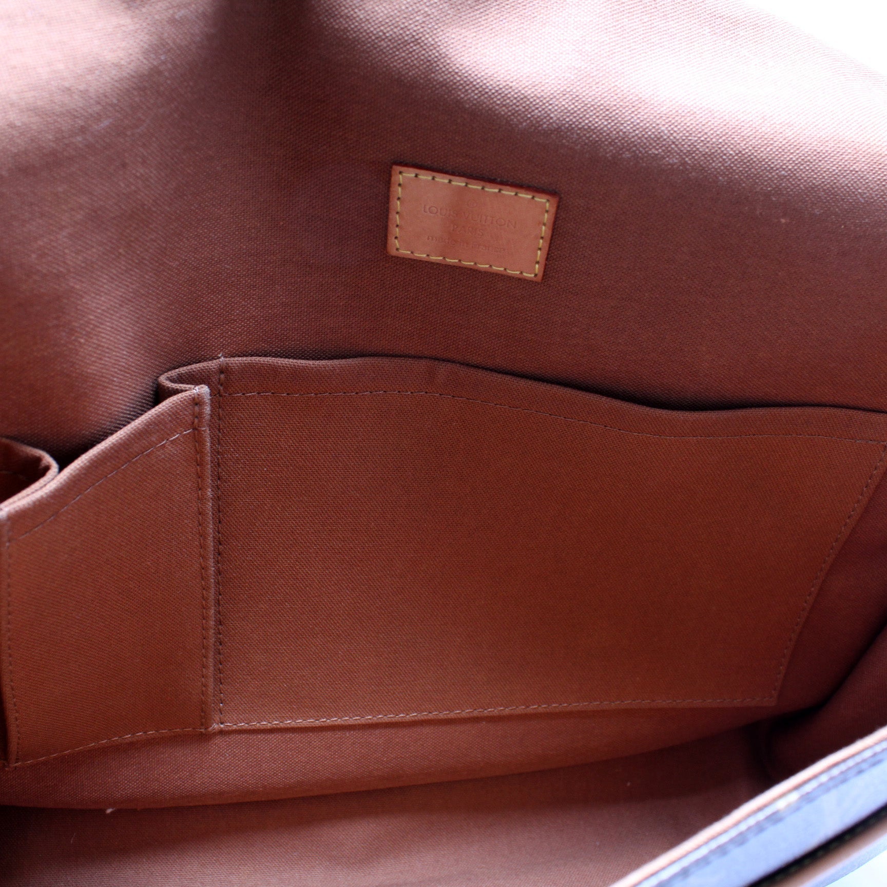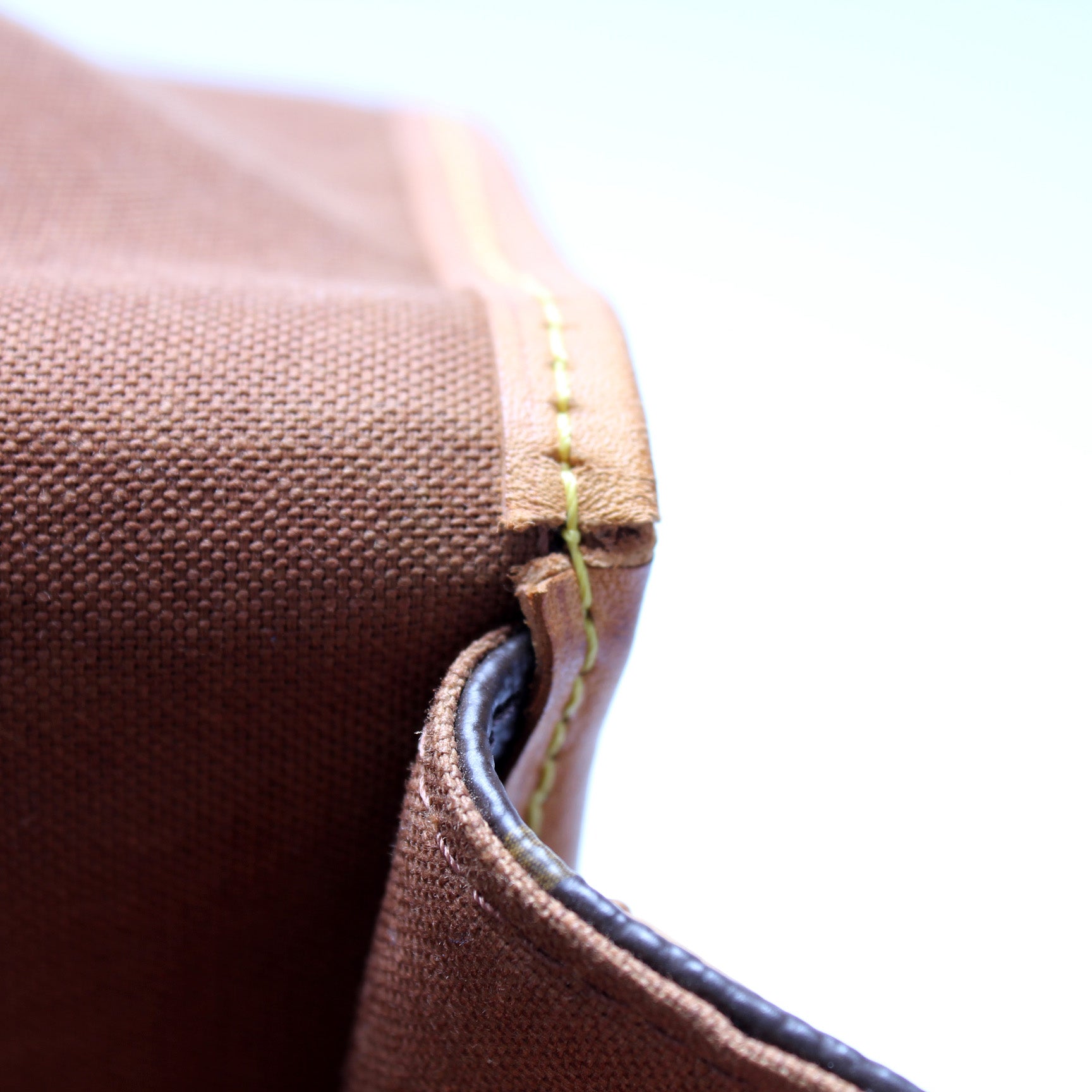 Exterior: The exterior Monogram coated canvas is free of any rips or cracks. The leather trim and details have signs of wear and discoloration throughout.