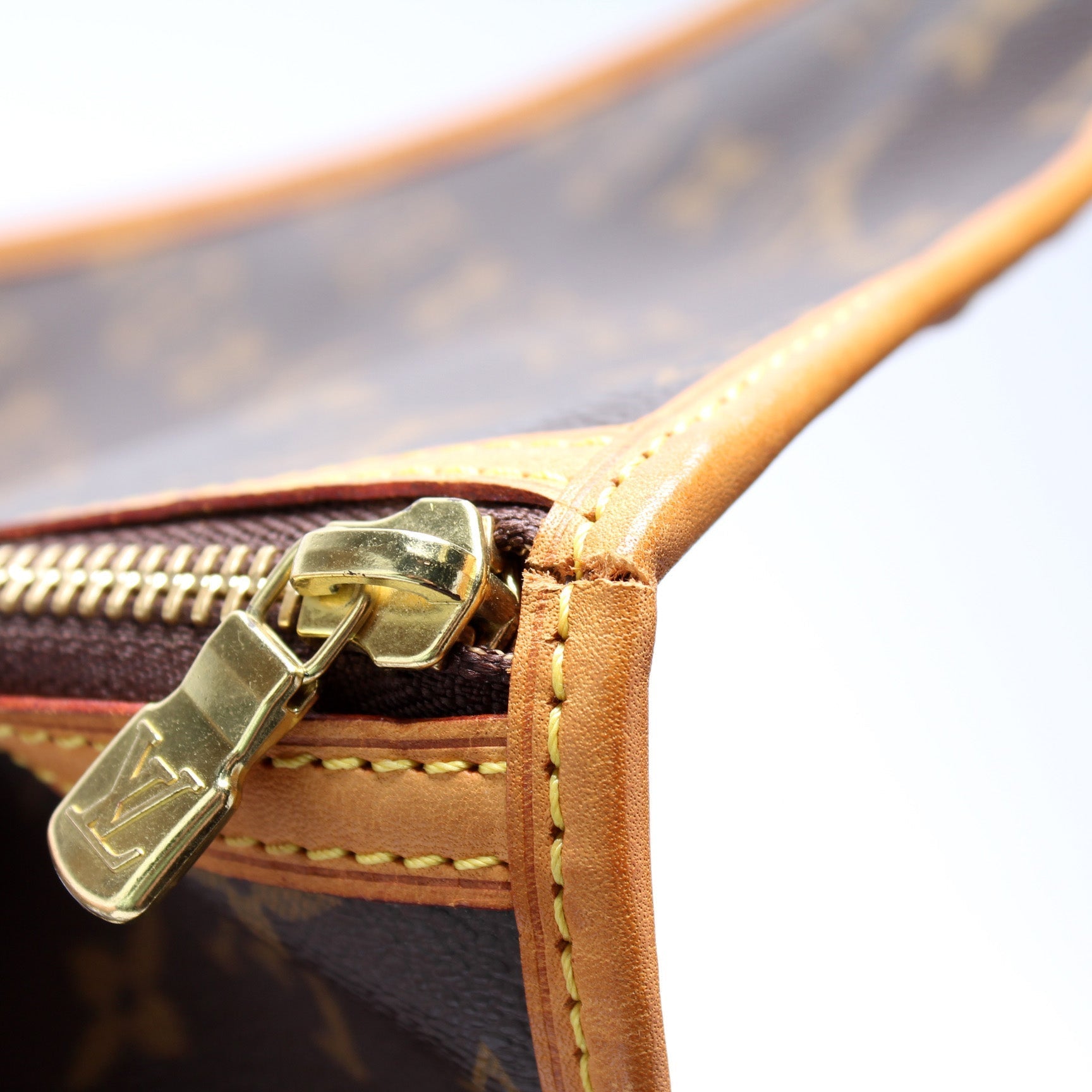 Exterior: The exterior Monogram coated canvas is free of any rips or cracks. The leather trim and details have signs of wear and discoloration throughout.