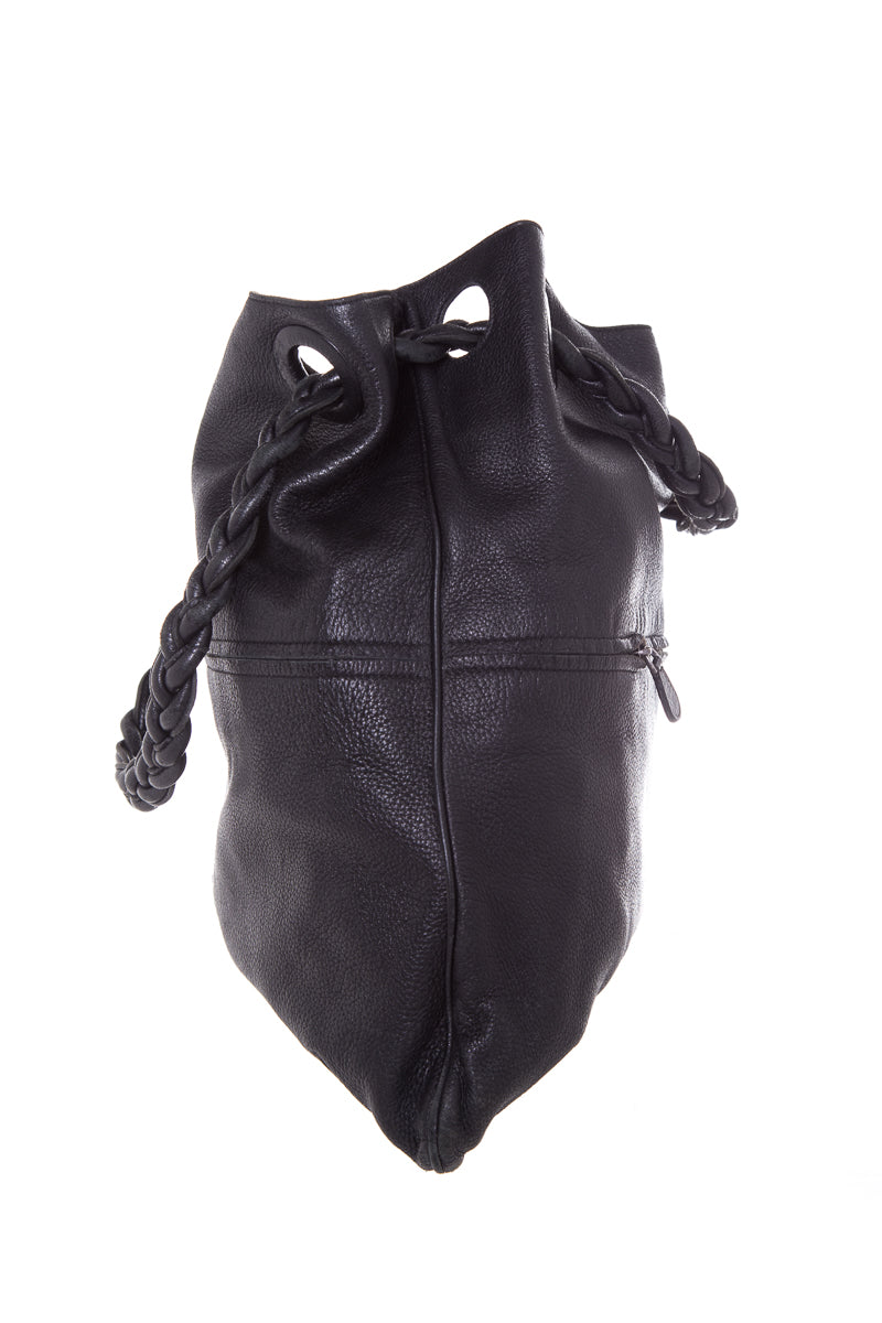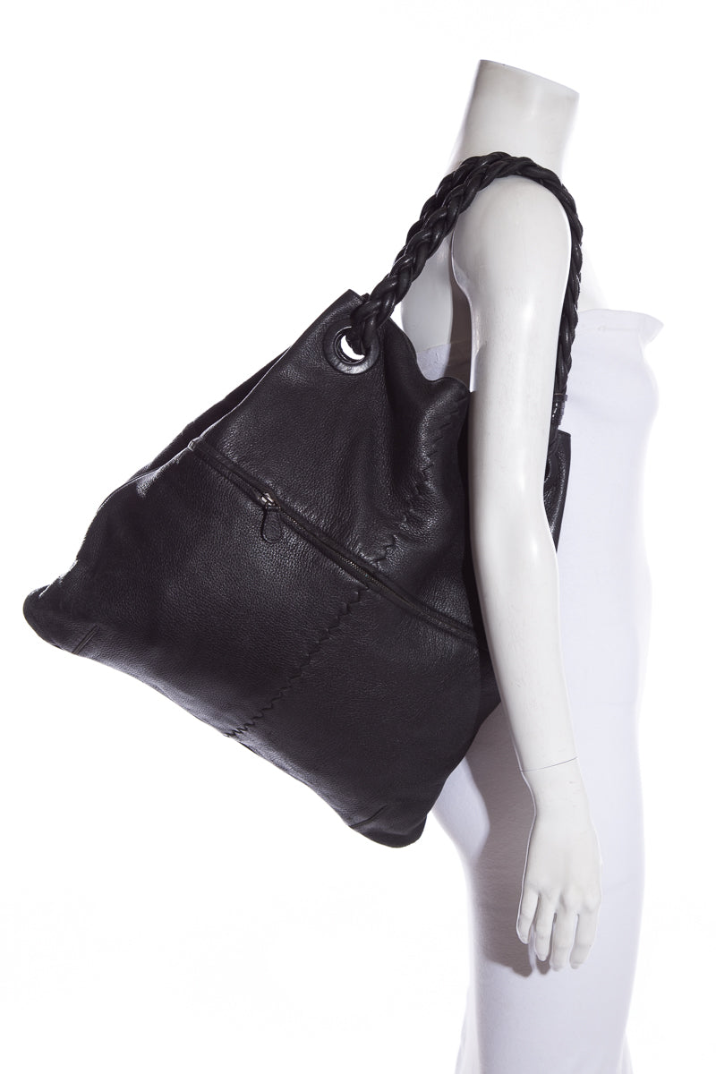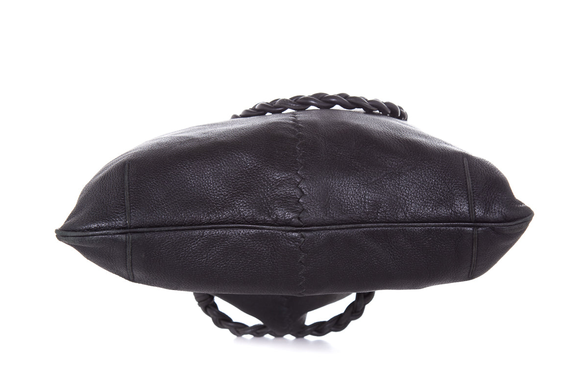 Bottega Veneta Black Leather Julie Tote with front zipper compartment and adjustable shoulder strap. This item is in fair condition; wear to leather on exterior including handle as well as moderate staining on lining.