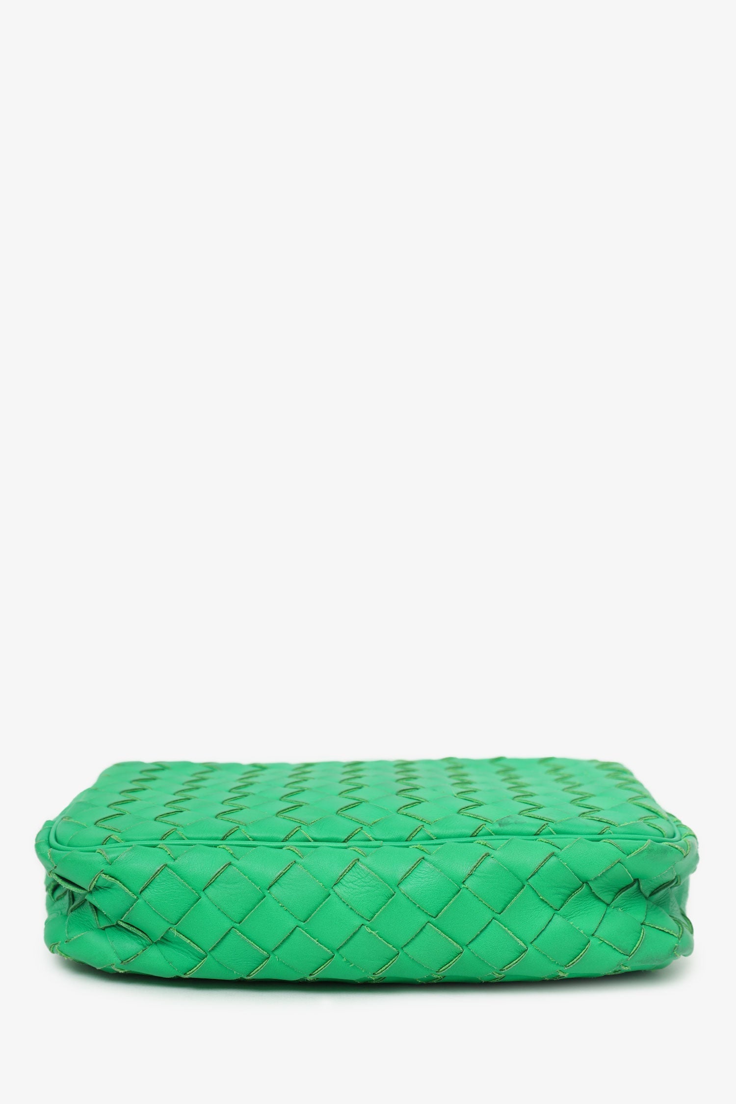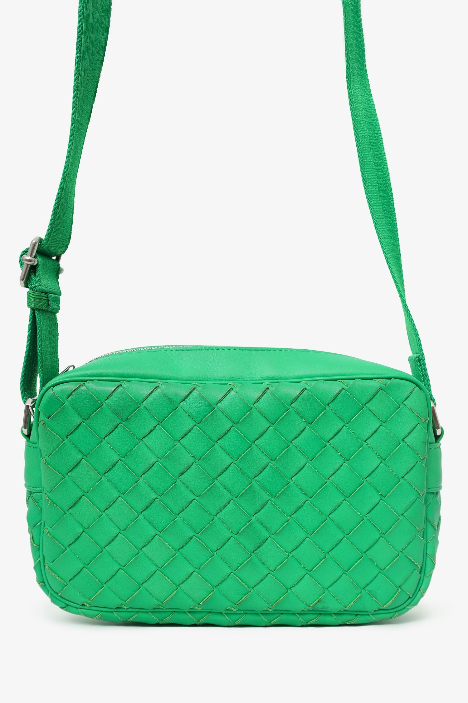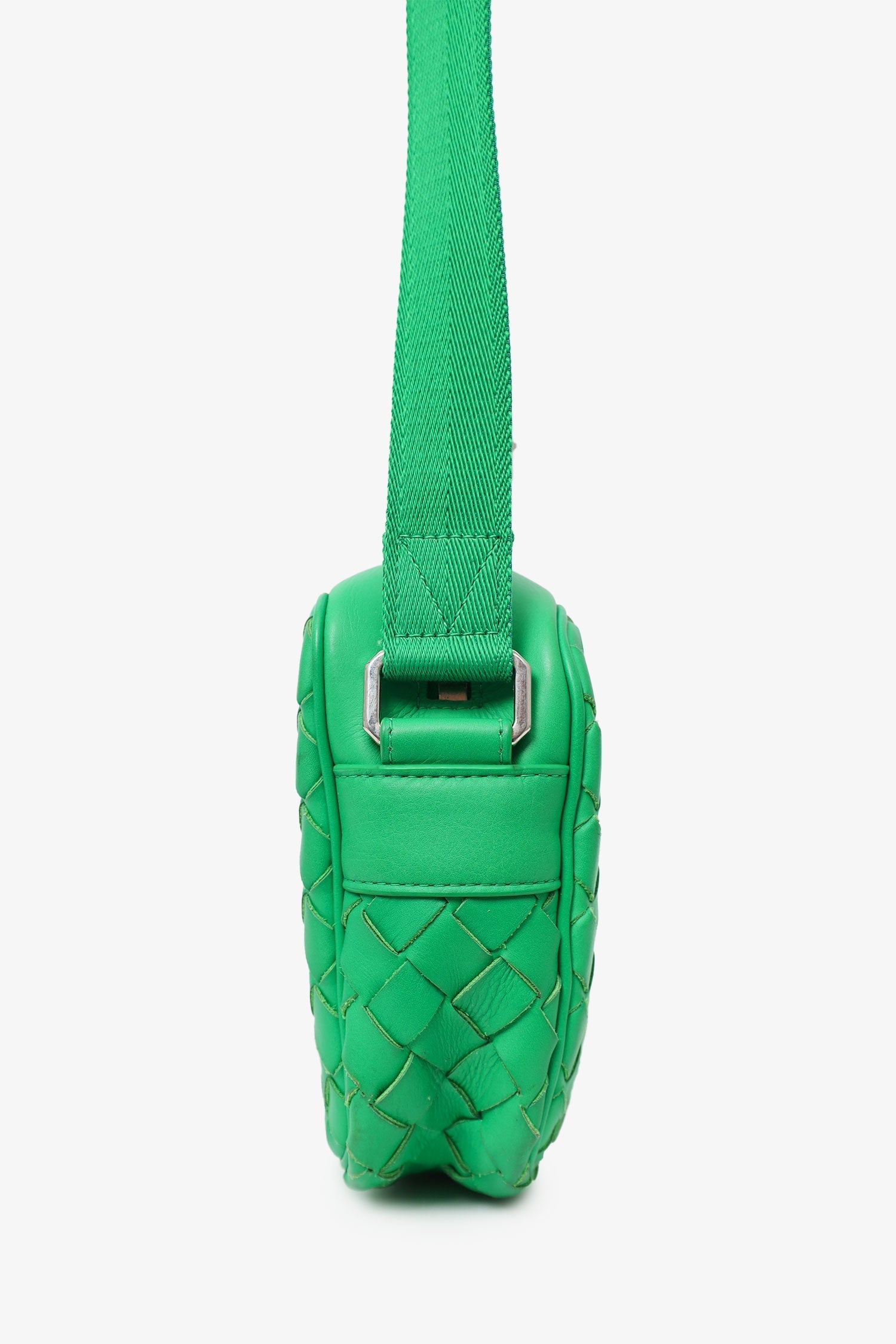 Bottega Veneta Green Small Intrecciato Camera Bag. Top two-way zip closure. Adjustable shoulder strap with buckle closure. Open leather interior. Silver-tone hardware. Tonal stitching.