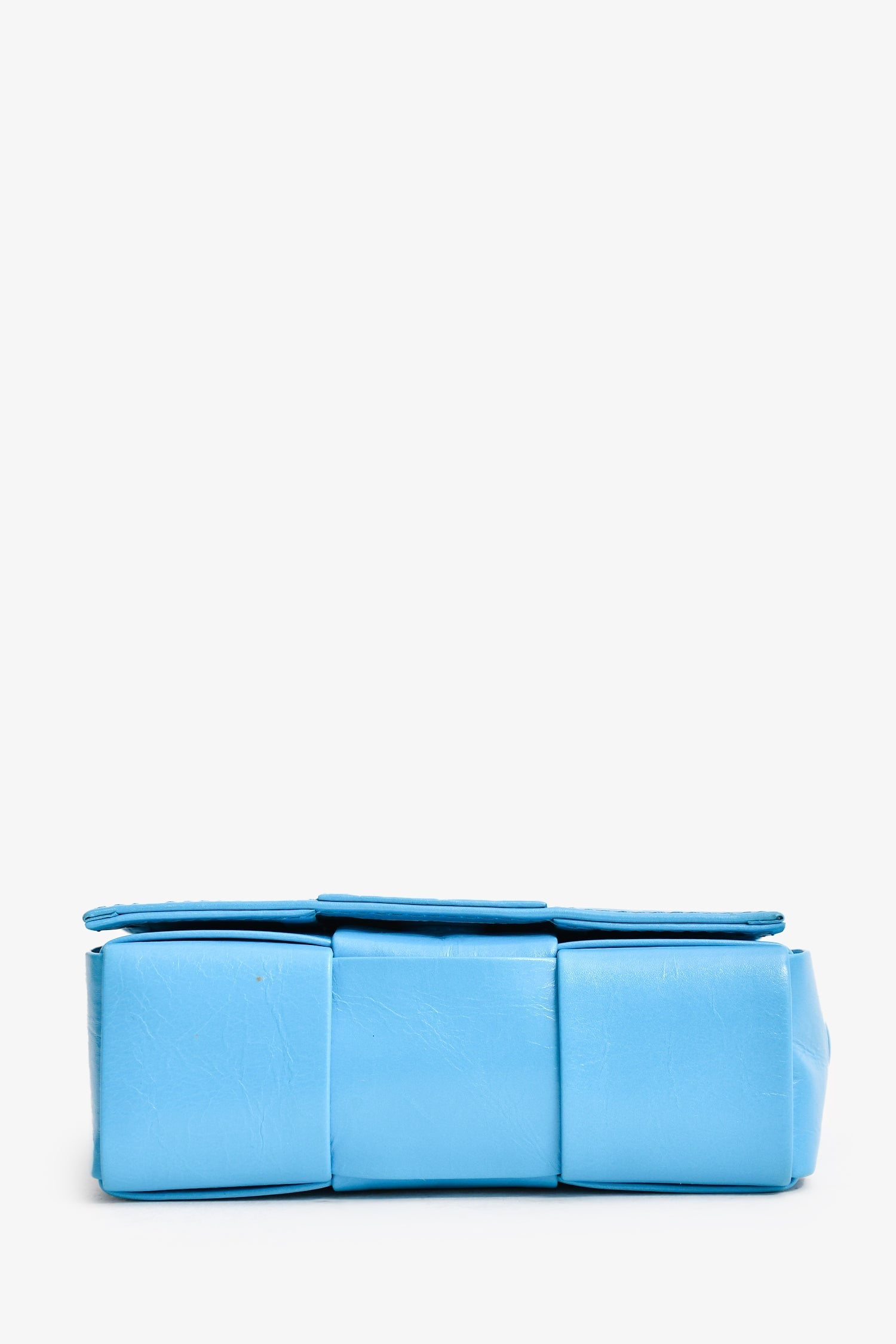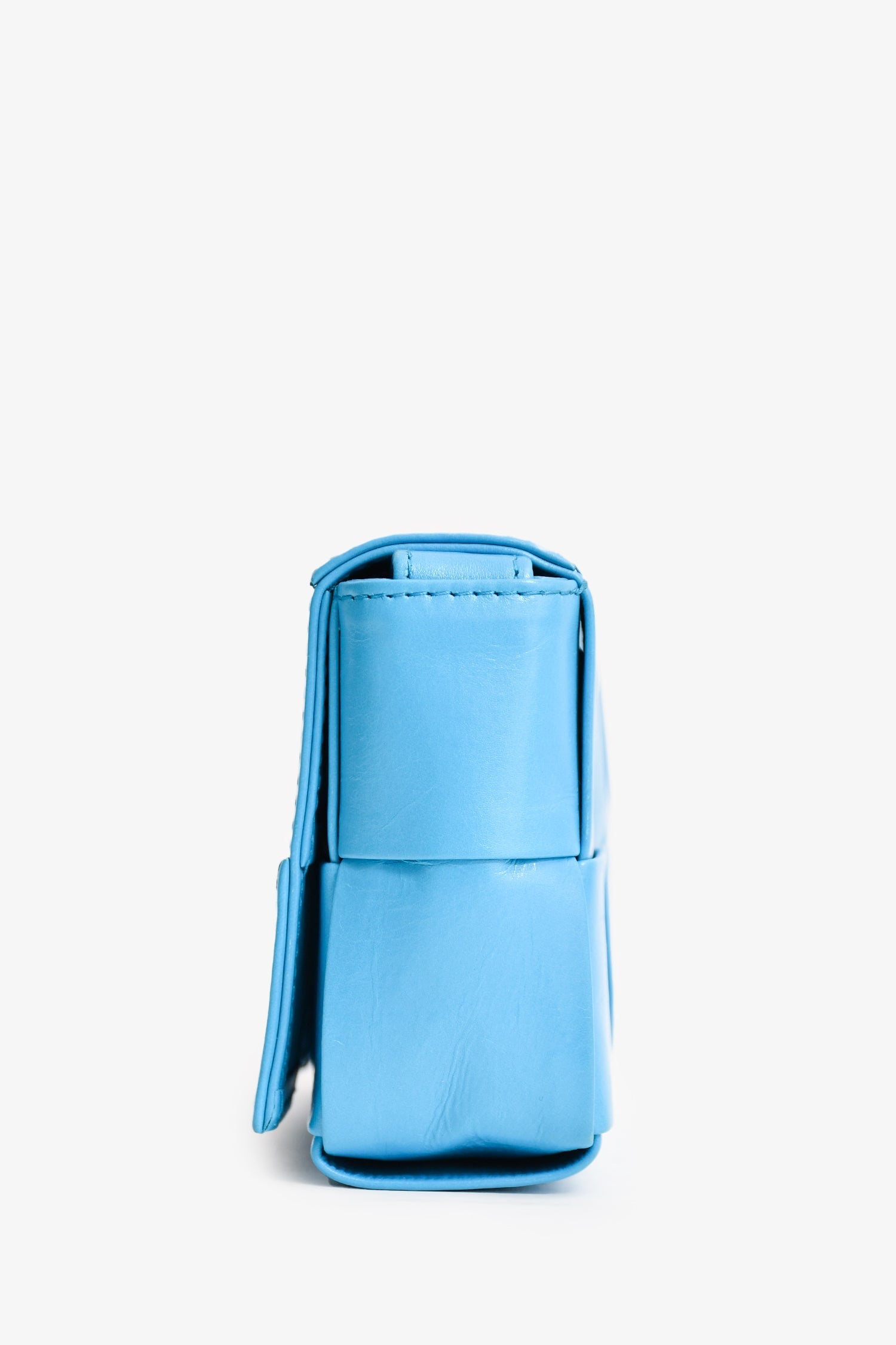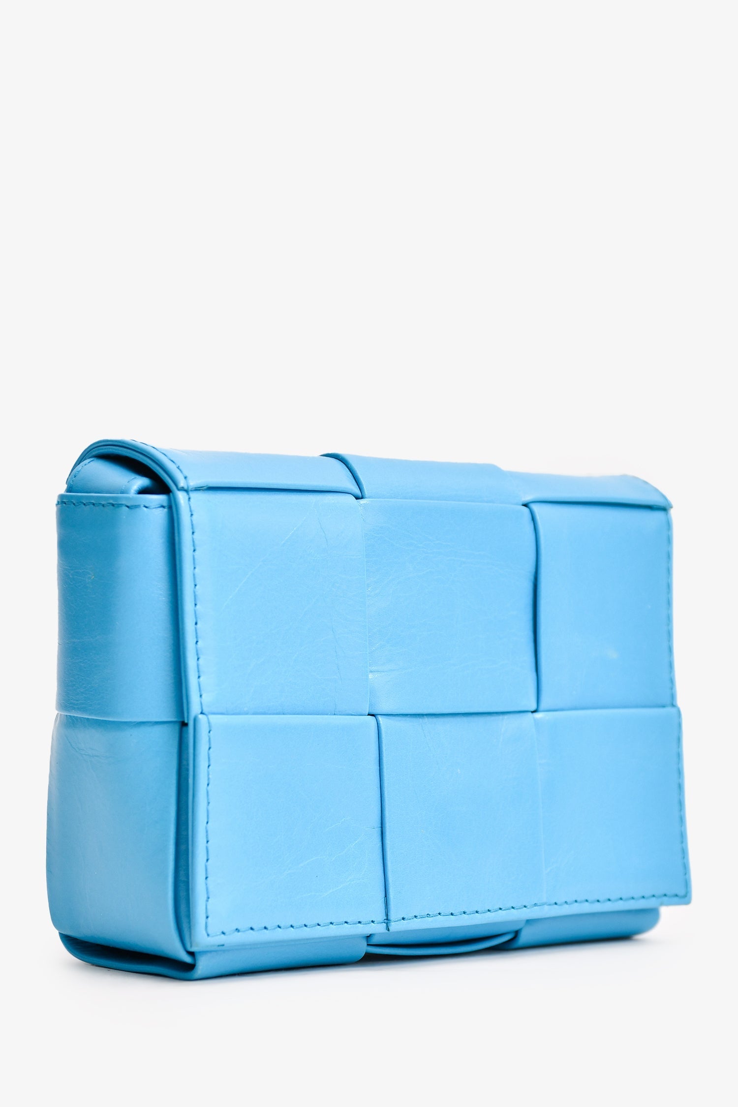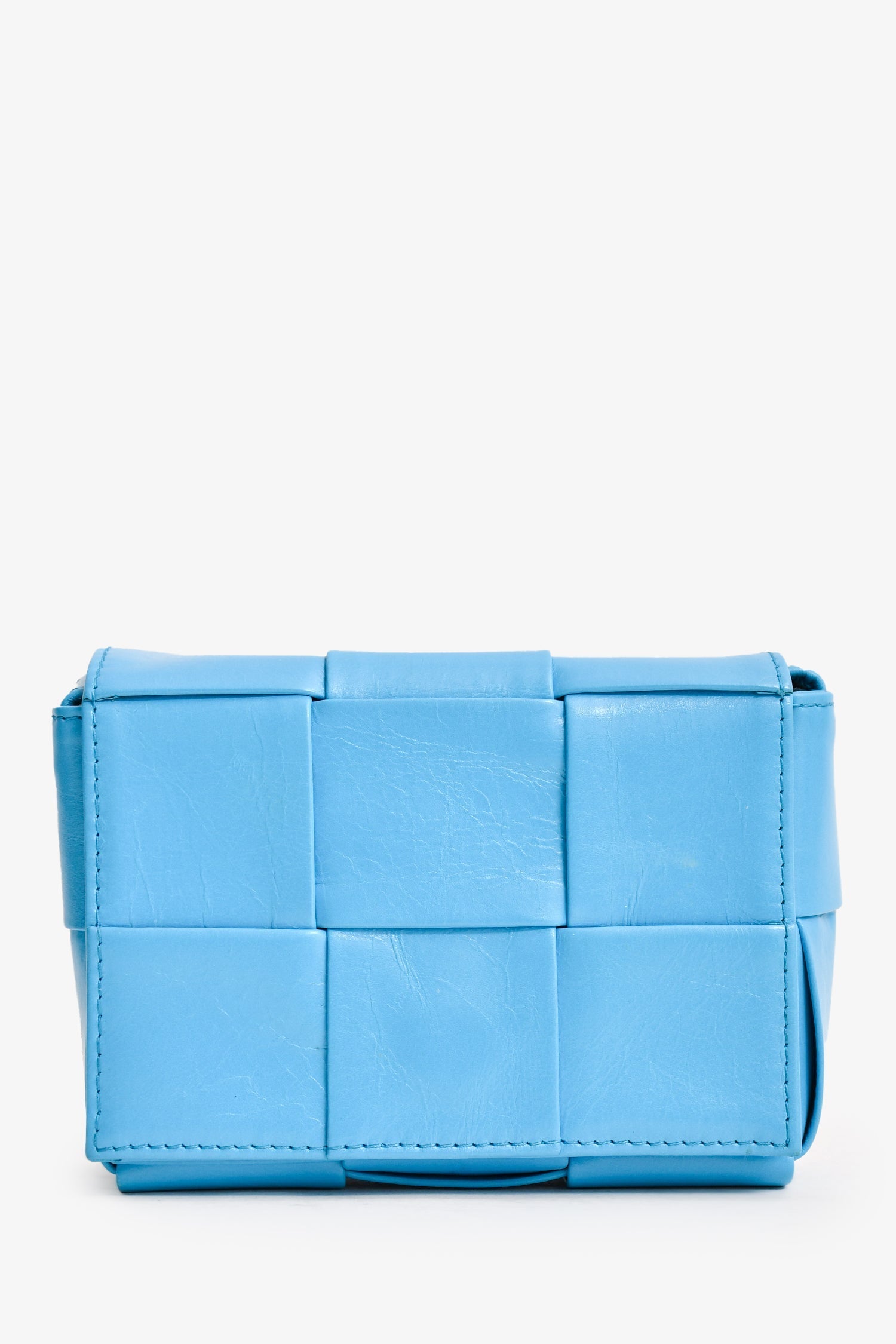 Bottega Veneta Leather Turquoise Mini Cassette Crossbody Bag. Front fold-over flap with magnetic closure. Tonal interior. Detachable interior slip pocket. Adjustable strap.