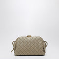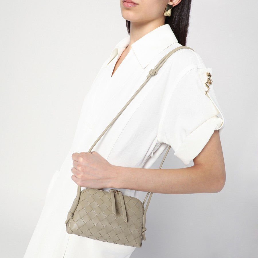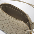 Clutch by Bottega Veneta in ecru Intrecciato patterned leather, featuring a zip fastening, an adjustable leather shoulder strap with mobile knots, a main compartment, an internal flat pocket, and metallic elements with a gold finish.
