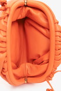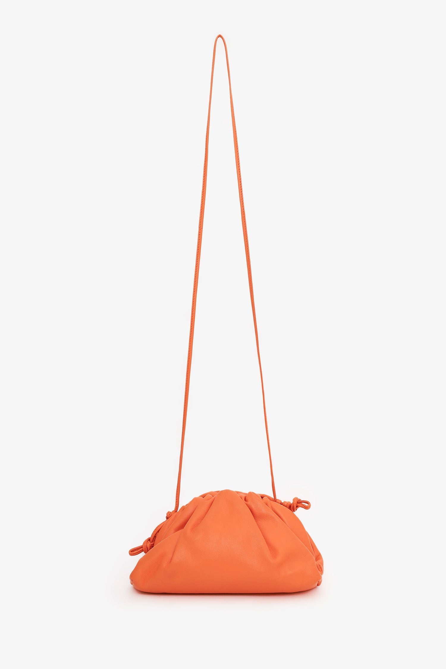 Bottega Veneta Orange Leather Mini Pouch Bag. Top magnetic closure with ruched detail. Crossbody strap. Open interior. Gold-tone hardware. Tonal stitching.