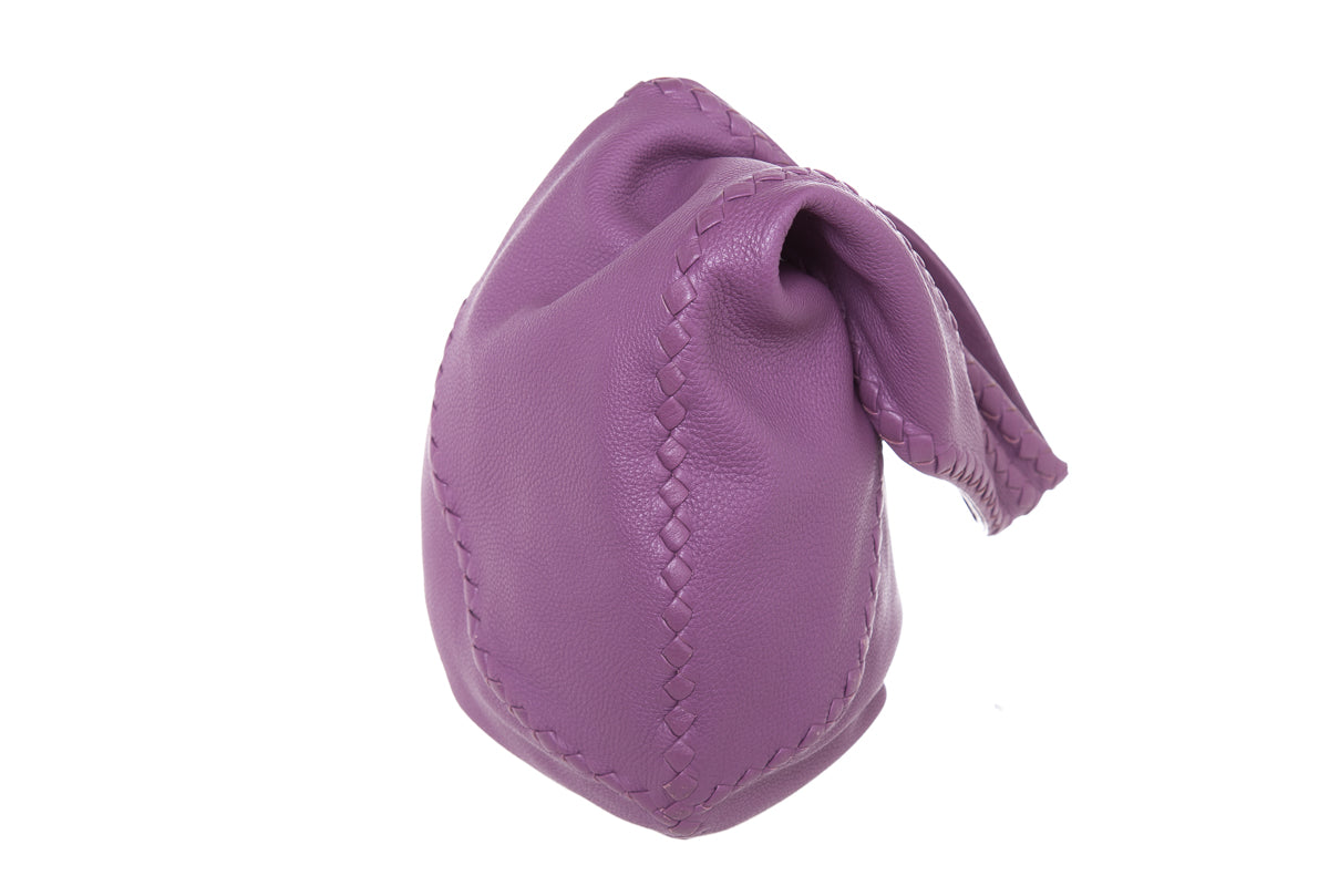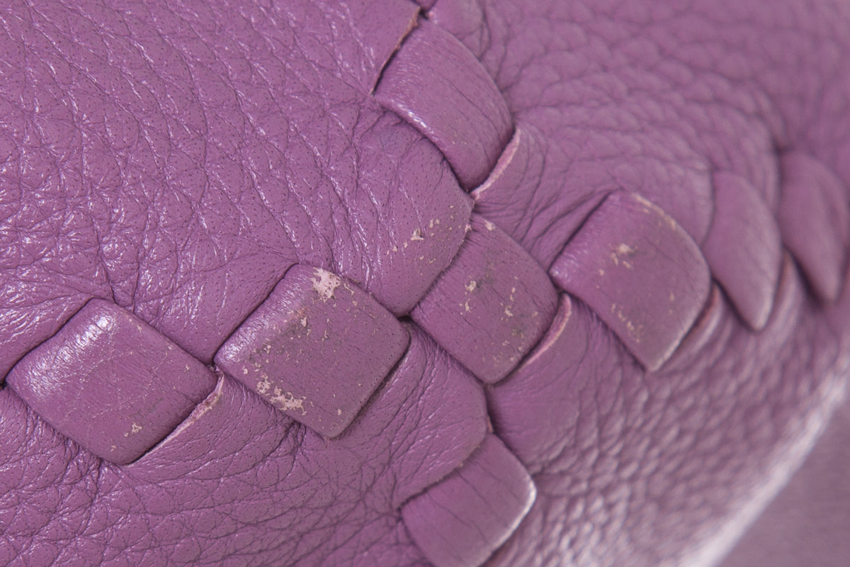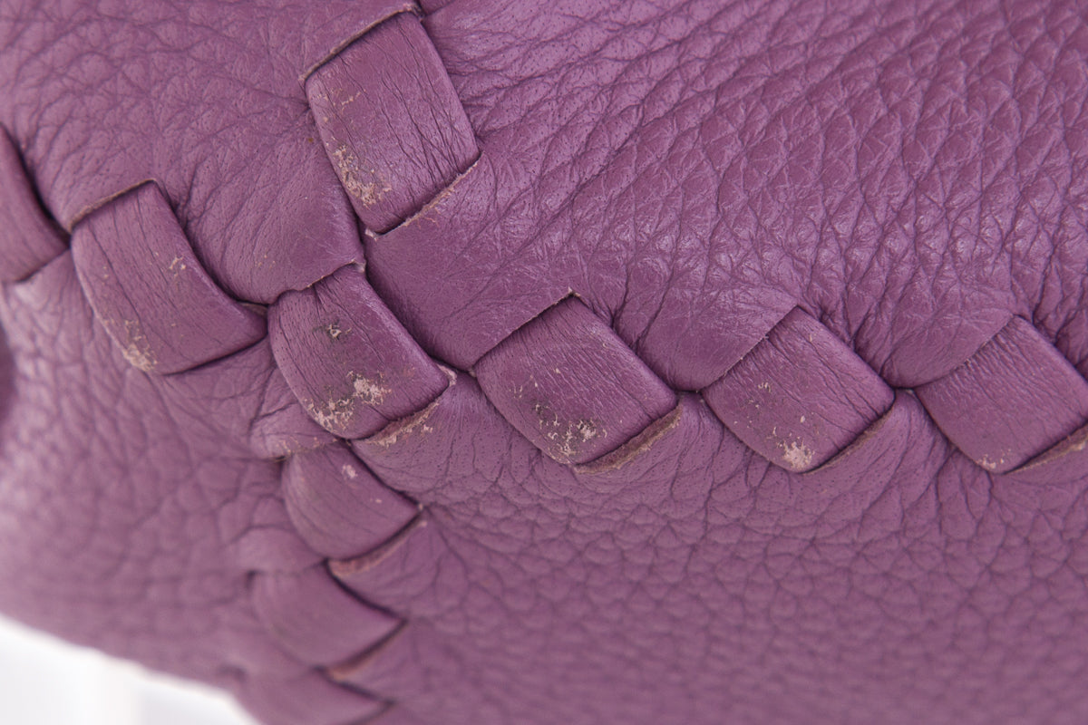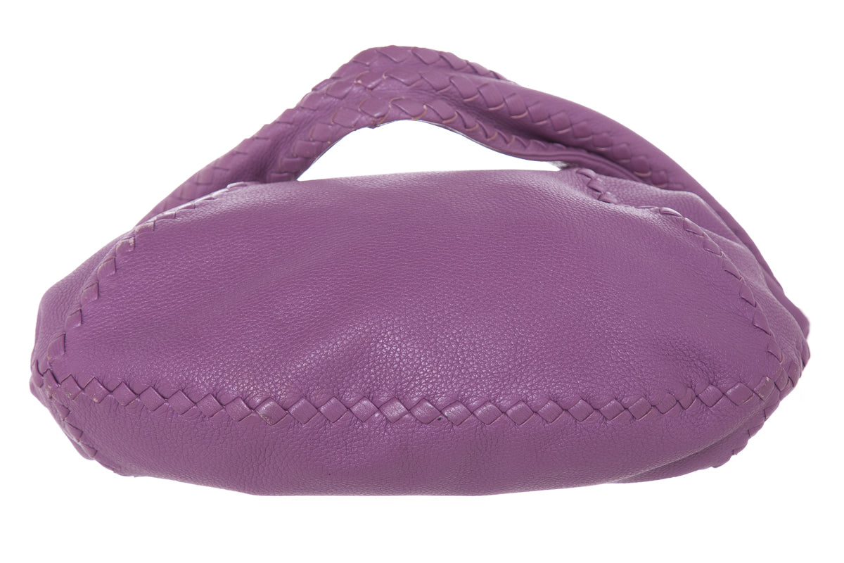 Bottega Veneta Purple Leather Hobo with woven detail and top shoulder strap and single button for closure. This item is in good condition; some scuffing on leather.